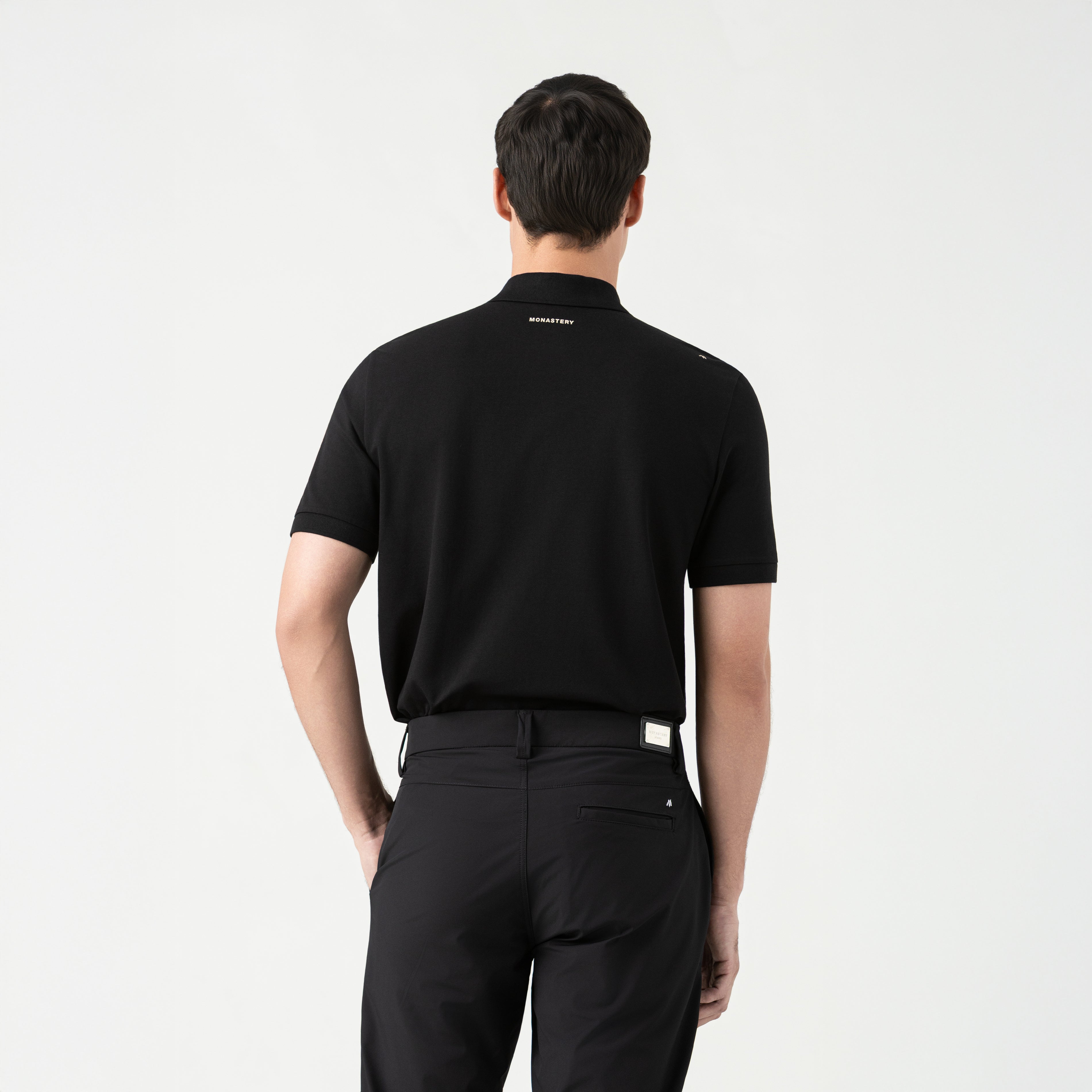 Akhal is a men's polo shirt, crafted in a regular fit, from 100% Peruvian Pima cotton exclusively for Monastery. The Akhal polo stands out for its balance of sobriety and character. It features an embroidered Monastery logo and the collection name on the front, contrasting decorative stitching on the goatee, and a complementary collar. The knit collar and cuffs add structure and sophistication, while the contrasting buttons complete a garment designed for a casual style with subtle refinement.