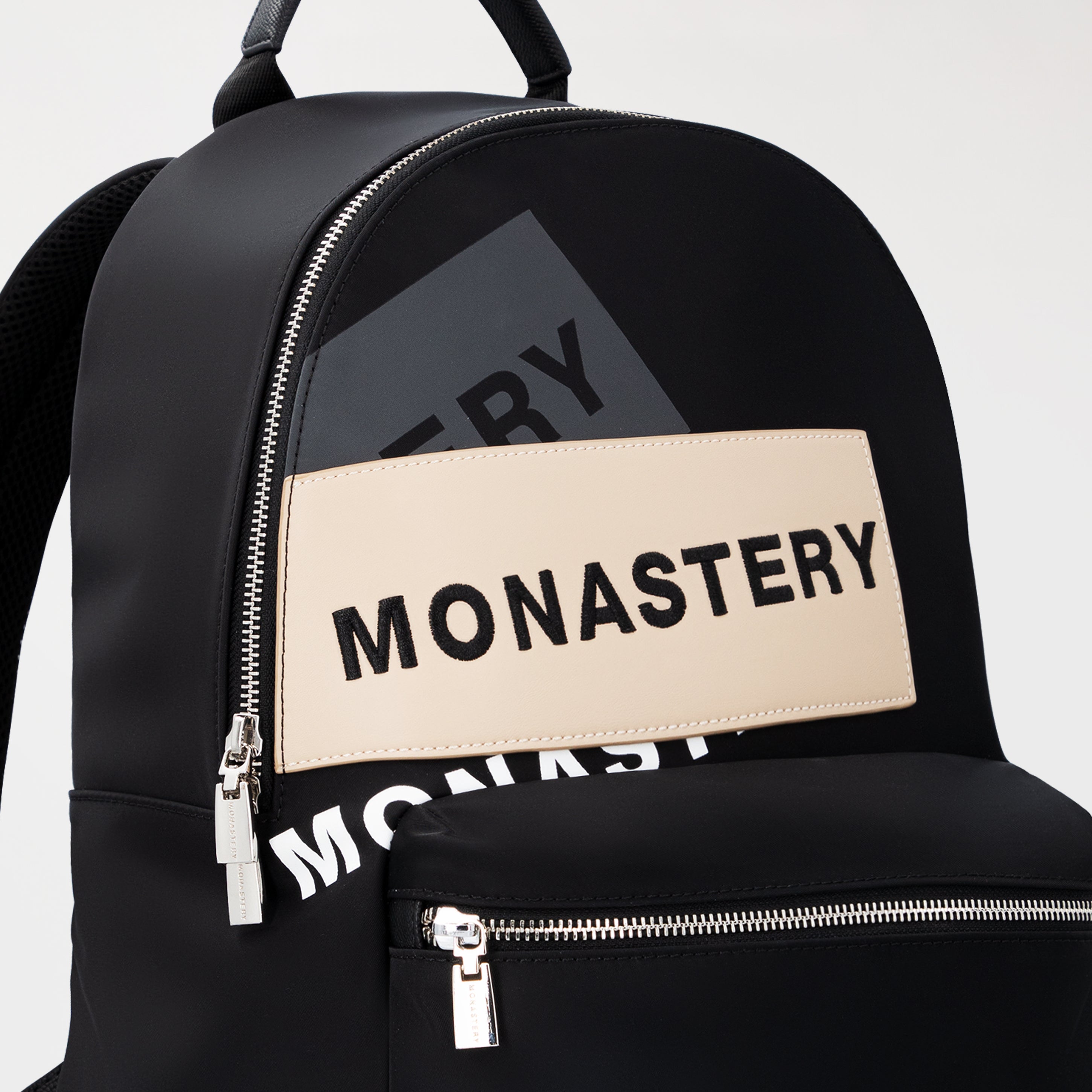 Cosmo is a unisex black backpack that fuses graphic design, durable materials, and functional details. Designed for those who move with style and purpose. Crafted from high-quality polyamide, a lightweight, durable material perfect for everyday use, the front features a printed design accompanied by 3D embroidery. It features two compartments: a large main compartment and a more accessible one for quick organization of personal belongings. The back features a strap for easy attachment to a suitcase, ideal for comfortable travel. Additionally, the Monasterio logo is embossed in low relief, subtle yet distinctive, reinforcing the piece's authenticity. Cosmo is a backpack designed for the contemporary pace: urban, versatile, and with attitude.