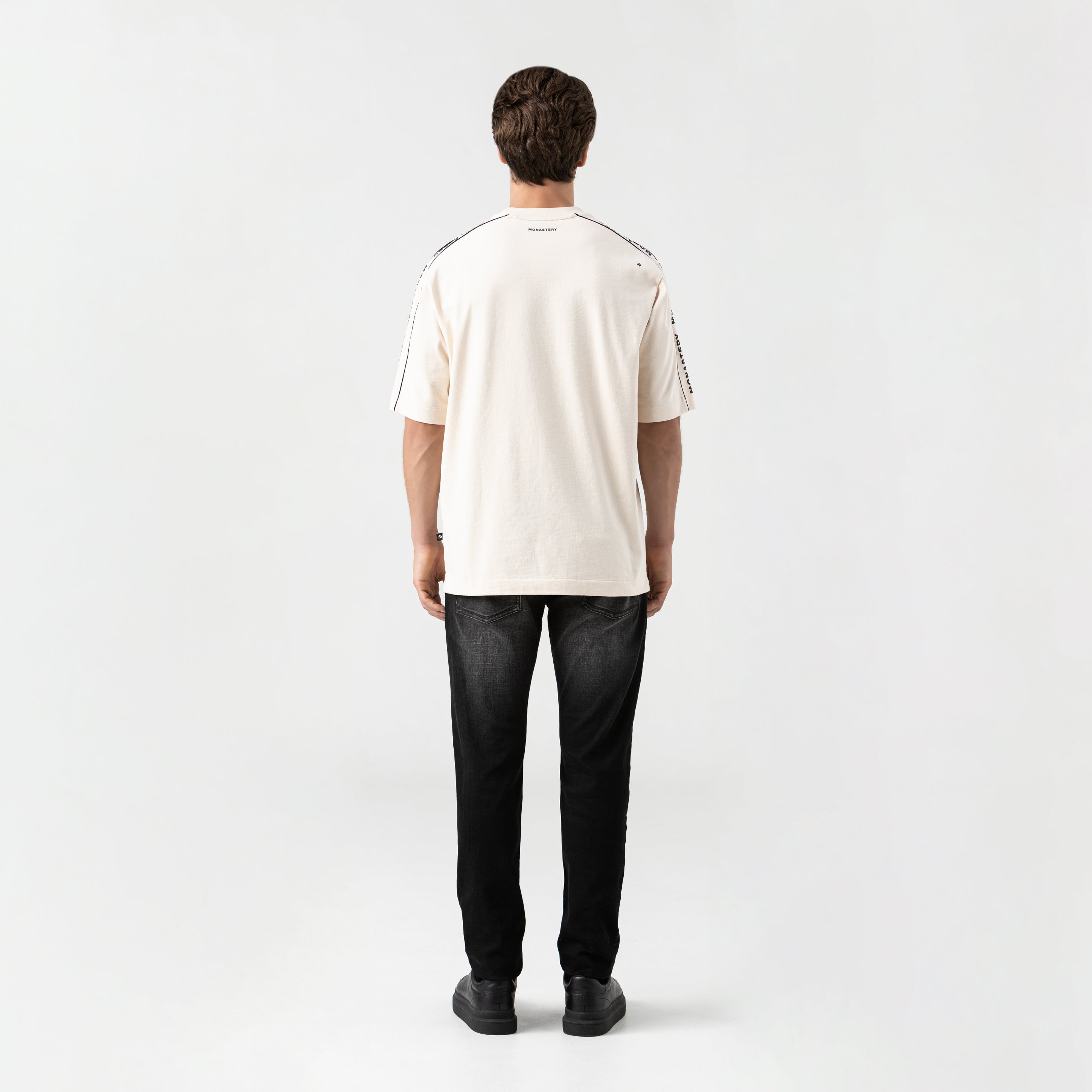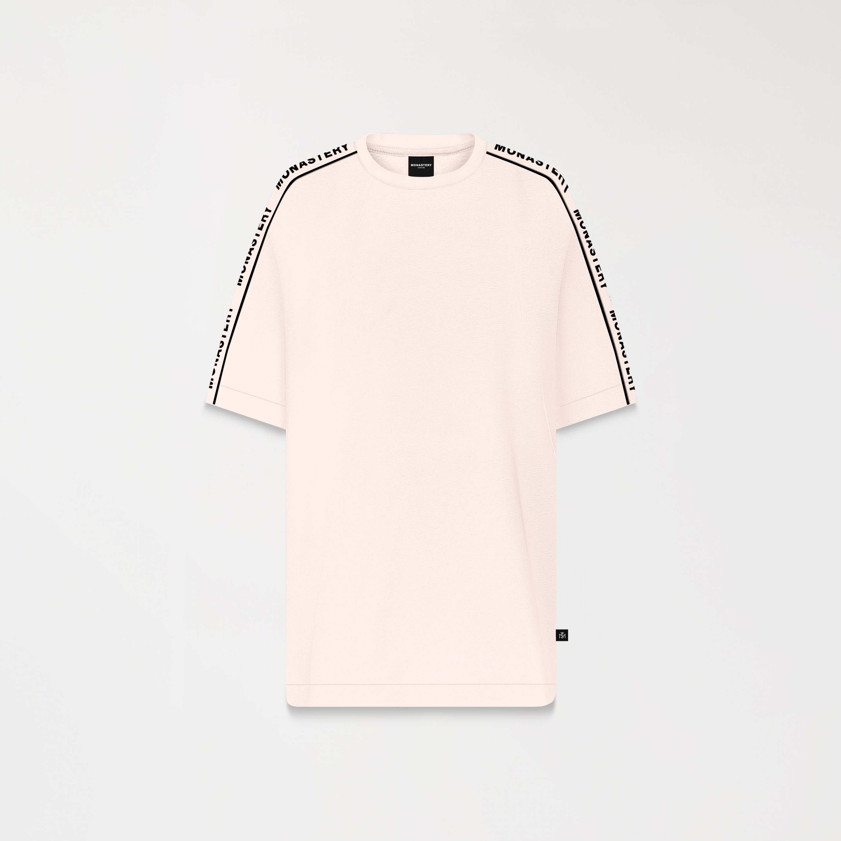 The oversized Monastery fabric T-shirt is a statement of control and millimetric design. Crafted from Monastery fabric, this oversized fit T-shirt redefines the codes of minimalism through its construction. Its 2.5 cm ribbed collar marks the starting point of a deliberately wide silhouette, offset by a sleeve cut that provides structural tension. The signature detail: a vivid contrasting bias, which traces a precise and visually disruptive line, like a clean incision on a perfect surface. It's a piece for the man who understands that true luxury lies in the details.