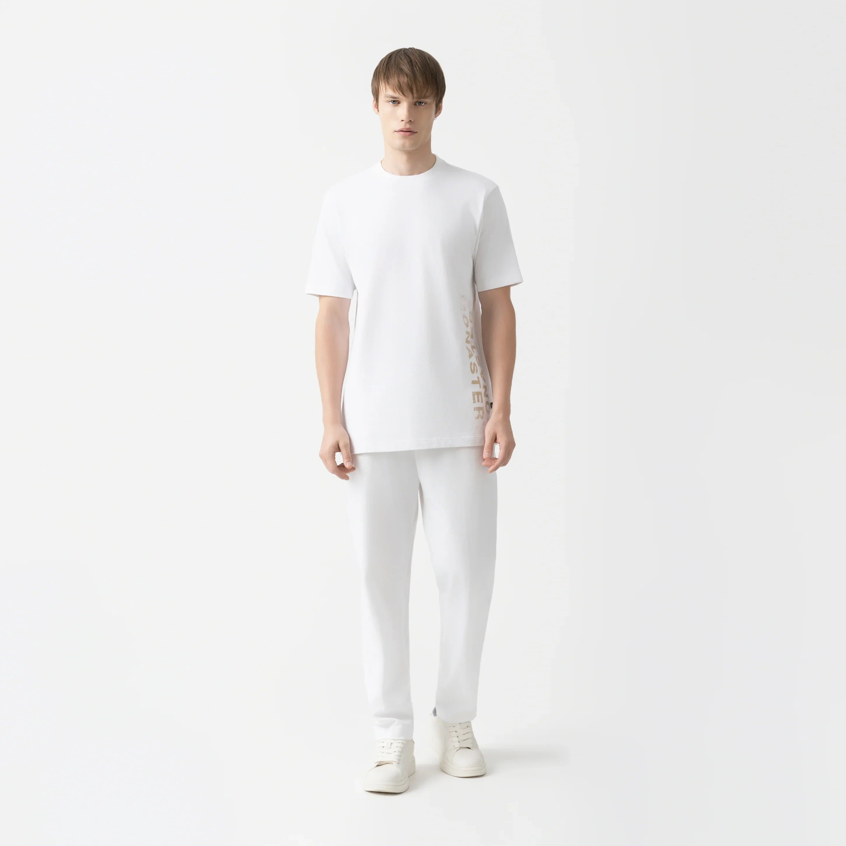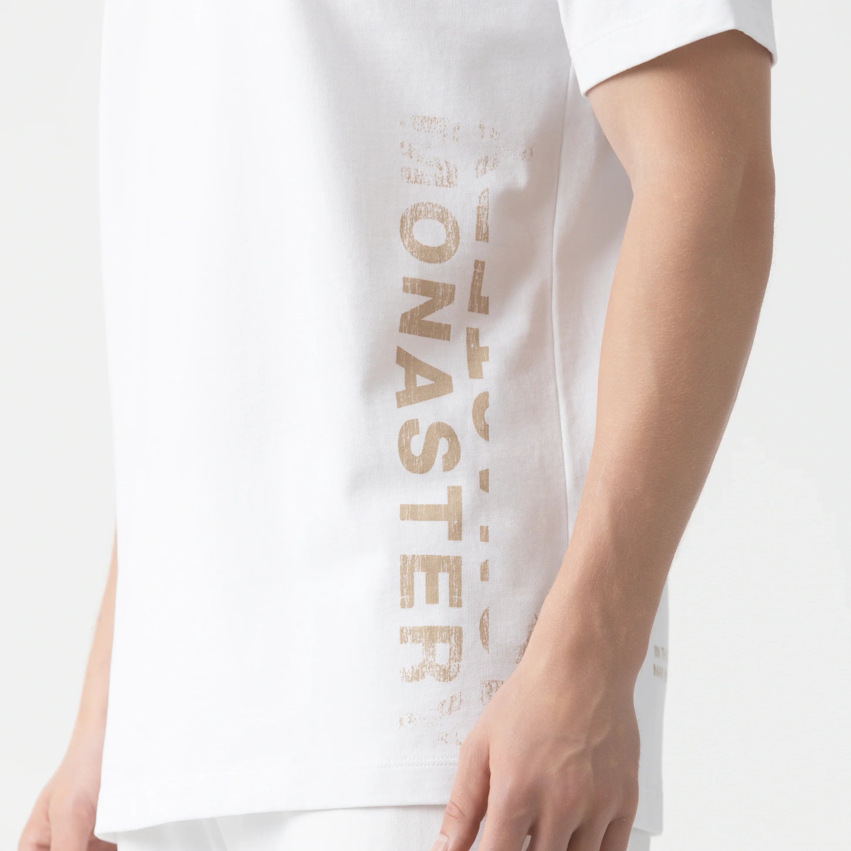 Clint is a men's regular-fit T-shirt made from Monasterio 2 fabric, a high-quality cotton that combines softness and structure. Its design includes a ribbed collar for a clean and durable finish. On the front and back, the prints, applied using a corrosion technique, create a distinctive visual effect that adds character and a modern touch. A versatile garment with its own personality, ideal for those who appreciate distinctive details in essential wardrobe pieces.