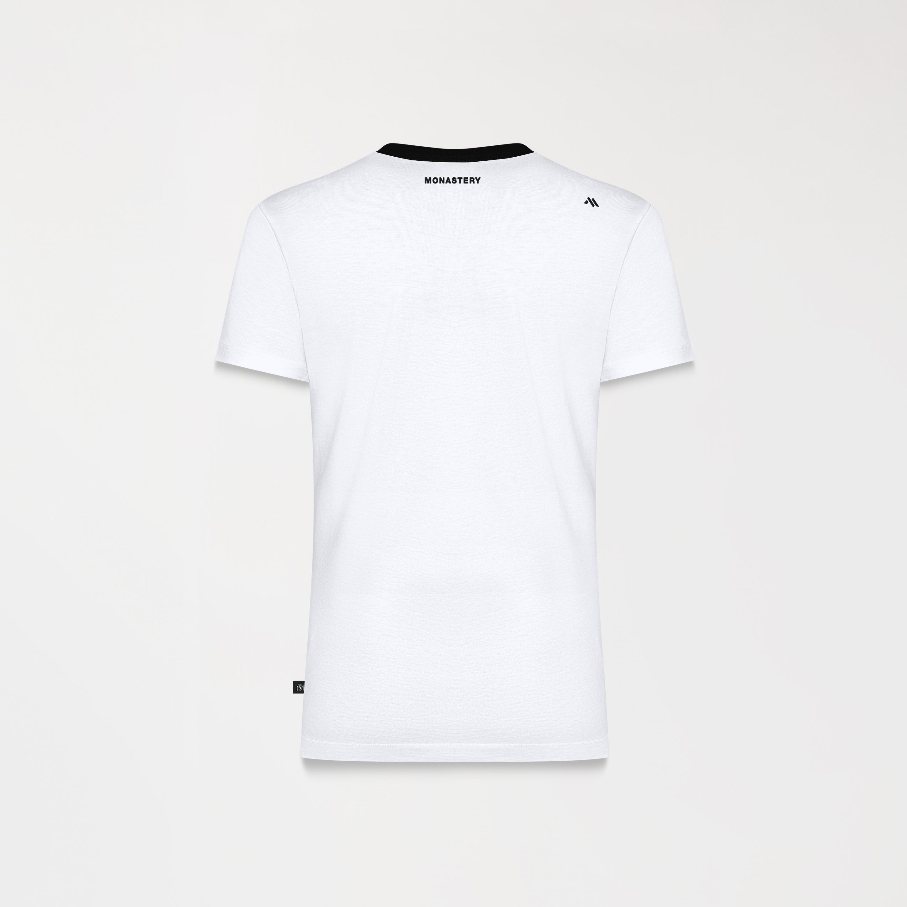 A women's T-shirt crafted in a small silhouette designed to highlight the feminine figure through its fresh, fitted textile base. Emmeline features a contrasting collar and features our MONASTERY logo in the center front using a plastisol technique, while the back features flat prints of our iconic logos. This style is crafted from our premium cotton textile base with elastane for greater comfort, allowing a better fit on the feminine silhouette.