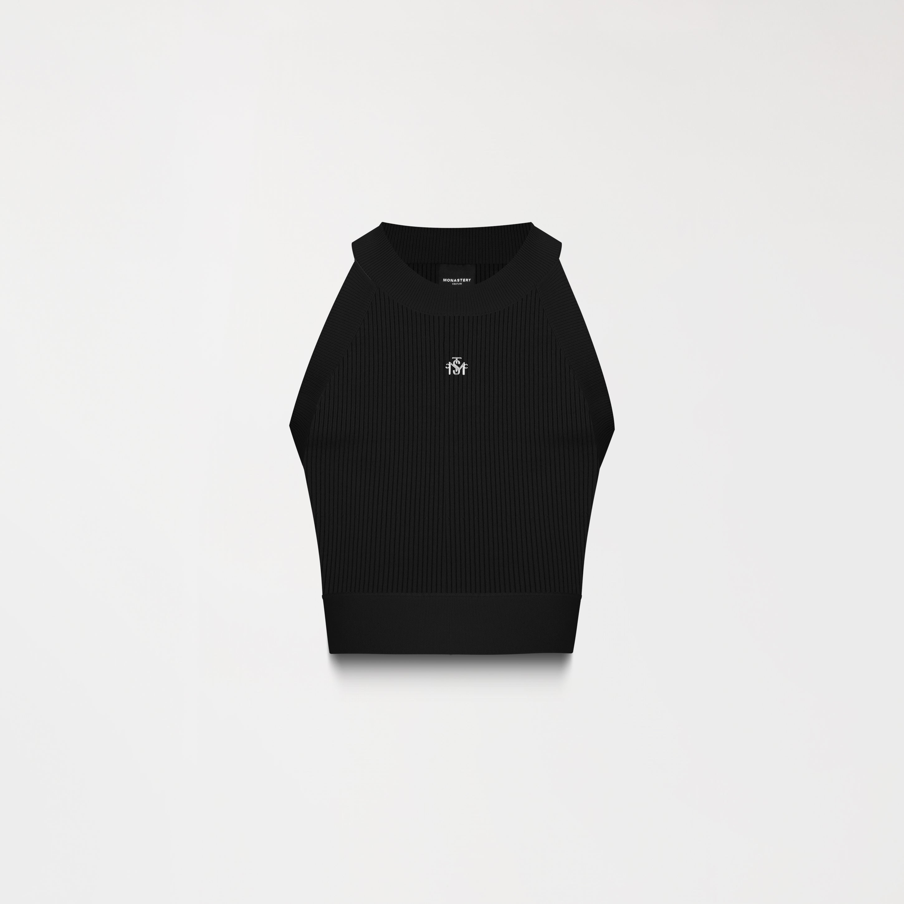 Fairy women's top made from Monastery fabric, an exclusive textile base that offers softness and structure. It features a halterneck silhouette that stylizes the neckline. Both the front and back feature subtle metallic appliqués that, without being overpowering, add a distinctive and sophisticated touch to the design.