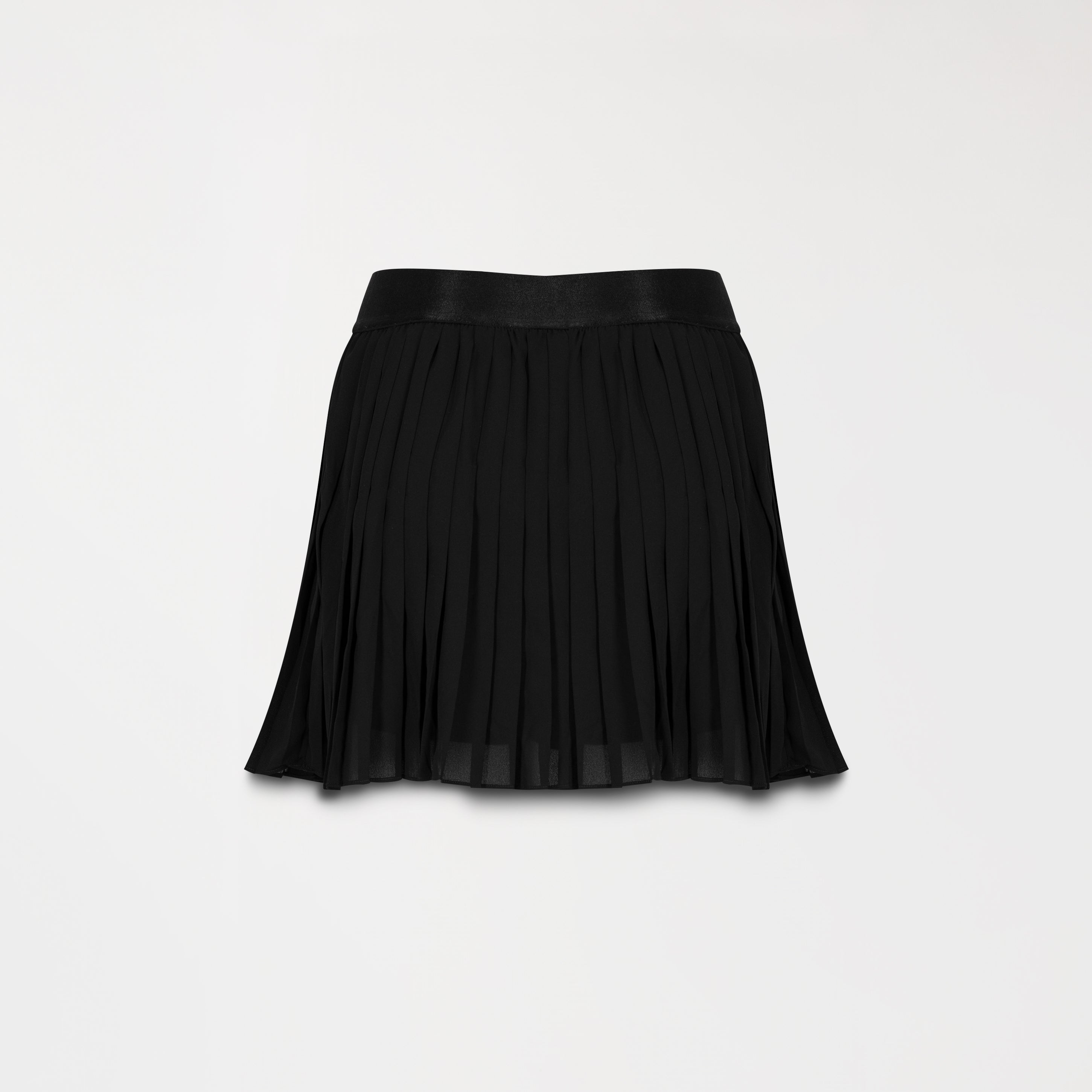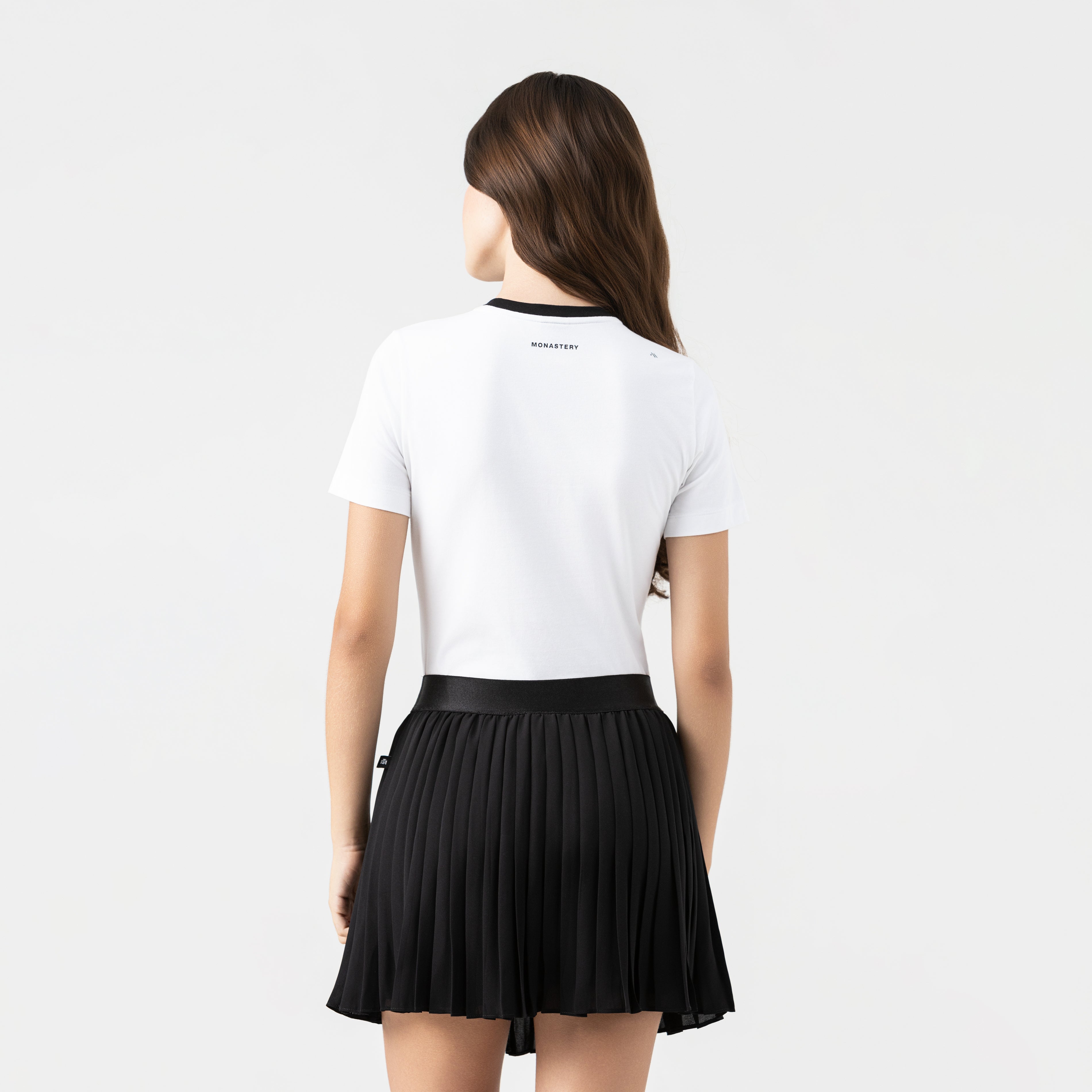 A short, pleated skirt that balances dynamism and femininity. Its design incorporates built-in shorts for comfort and freedom of movement, adapting to an active lifestyle with an urban and refined feel. A metal logo plate at the waistband reinforces the Monastery brand identity, while the signature logo printed on the built-in shorts adds an unexpected and distinctive detail. A versatile piece, designed to combine character and functionality with aesthetic precision.