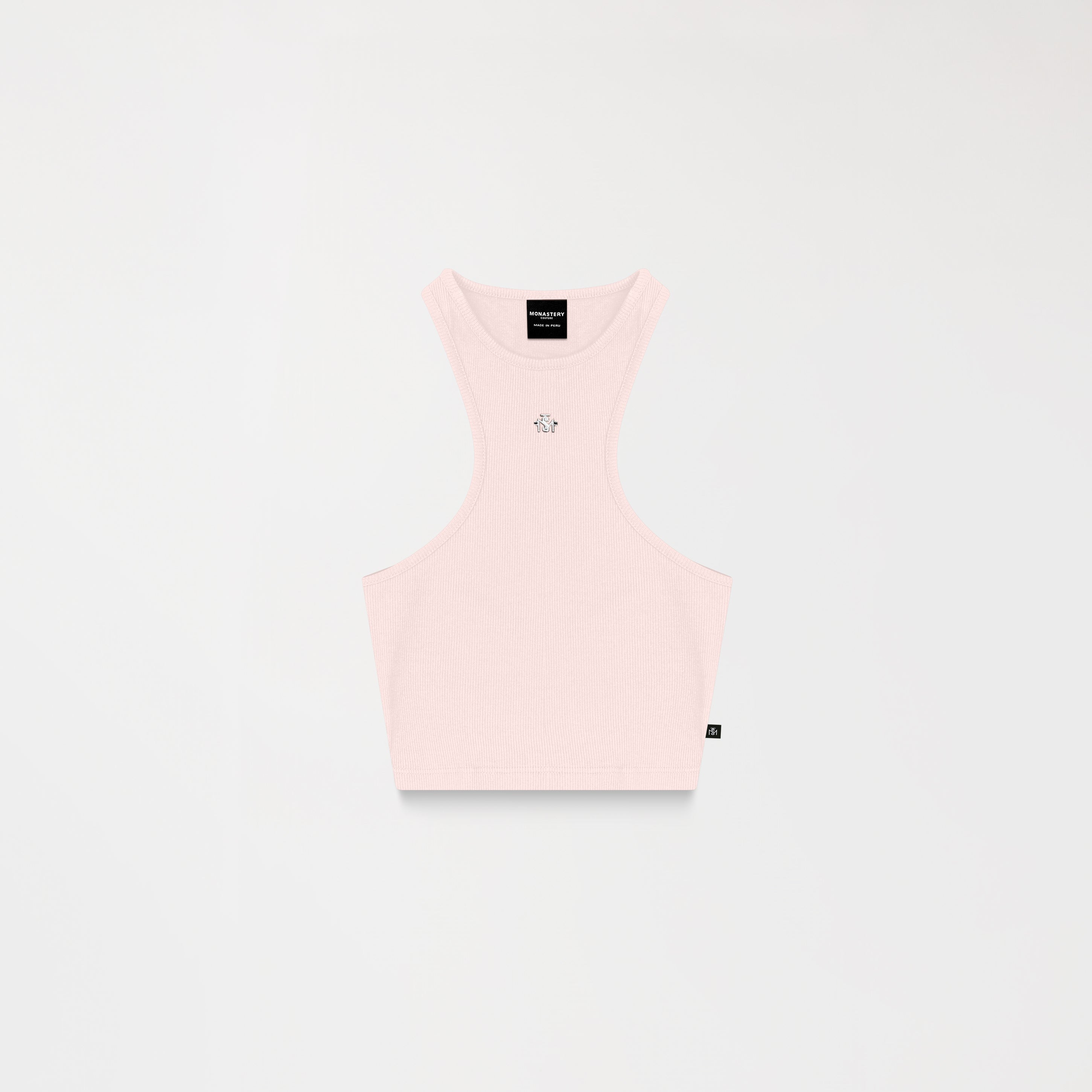 A feminine tank top crafted in rib exclusively for Monastery. With a clean, structured silhouette, Genna features a shiny silver TSM metallic trim that acts as the main visual accent on the front, while the back features a Monastery countermarked trim. The trims in a special silver finish have been exclusively designed, highlighting the value of each detail, reinforcing its identity with a sober and precise aesthetic.