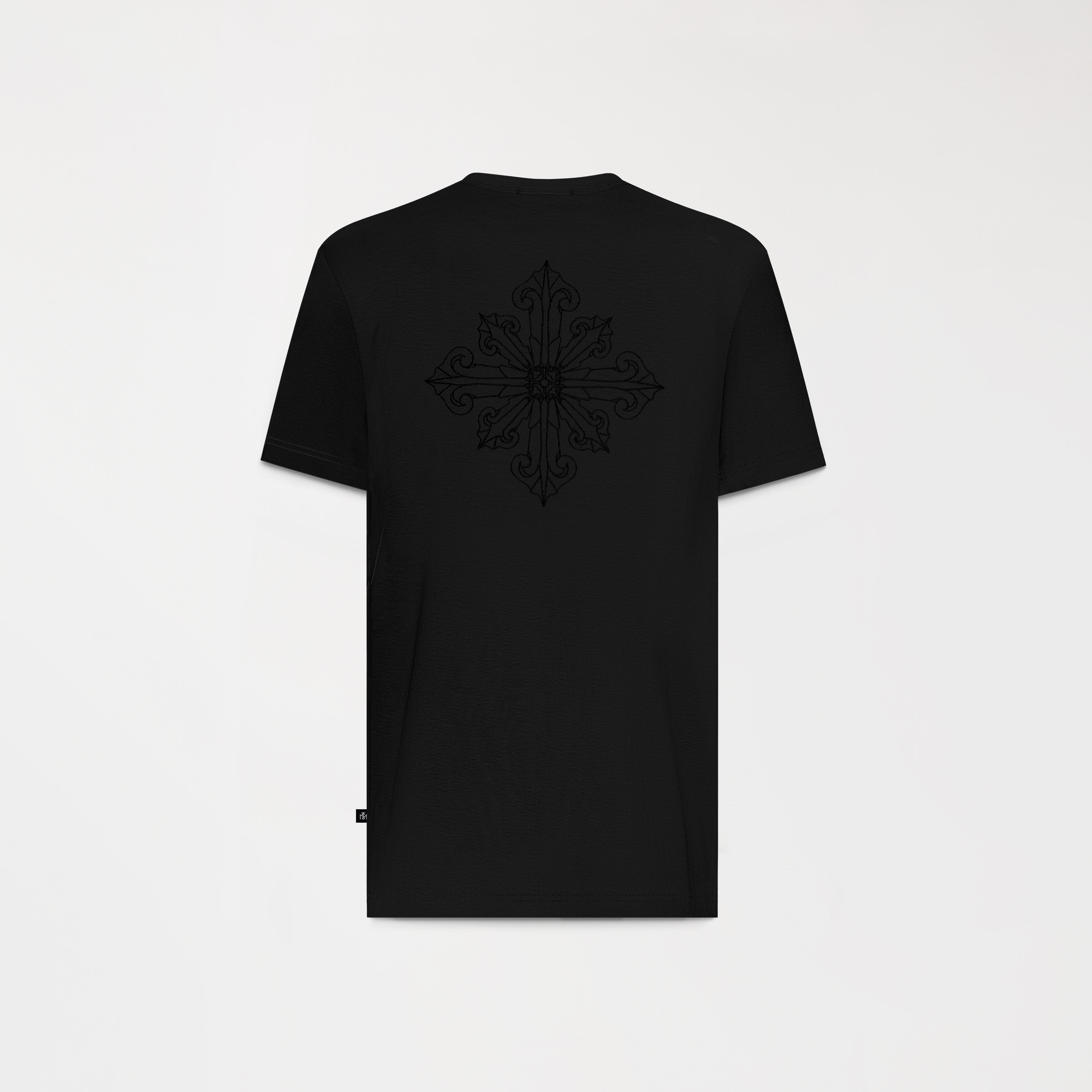Black men's t-shirt in regular fit, made in soft cotton, this t-shirt features a 3 cm collar for comfort and style. The front features embroidered heart stitch artwork, while the back features a striking 3D cross embroidered design. In addition, the logo logos are printed in high density, adding a classic and distinctive touch. Ideal for those looking for a modern look with character.