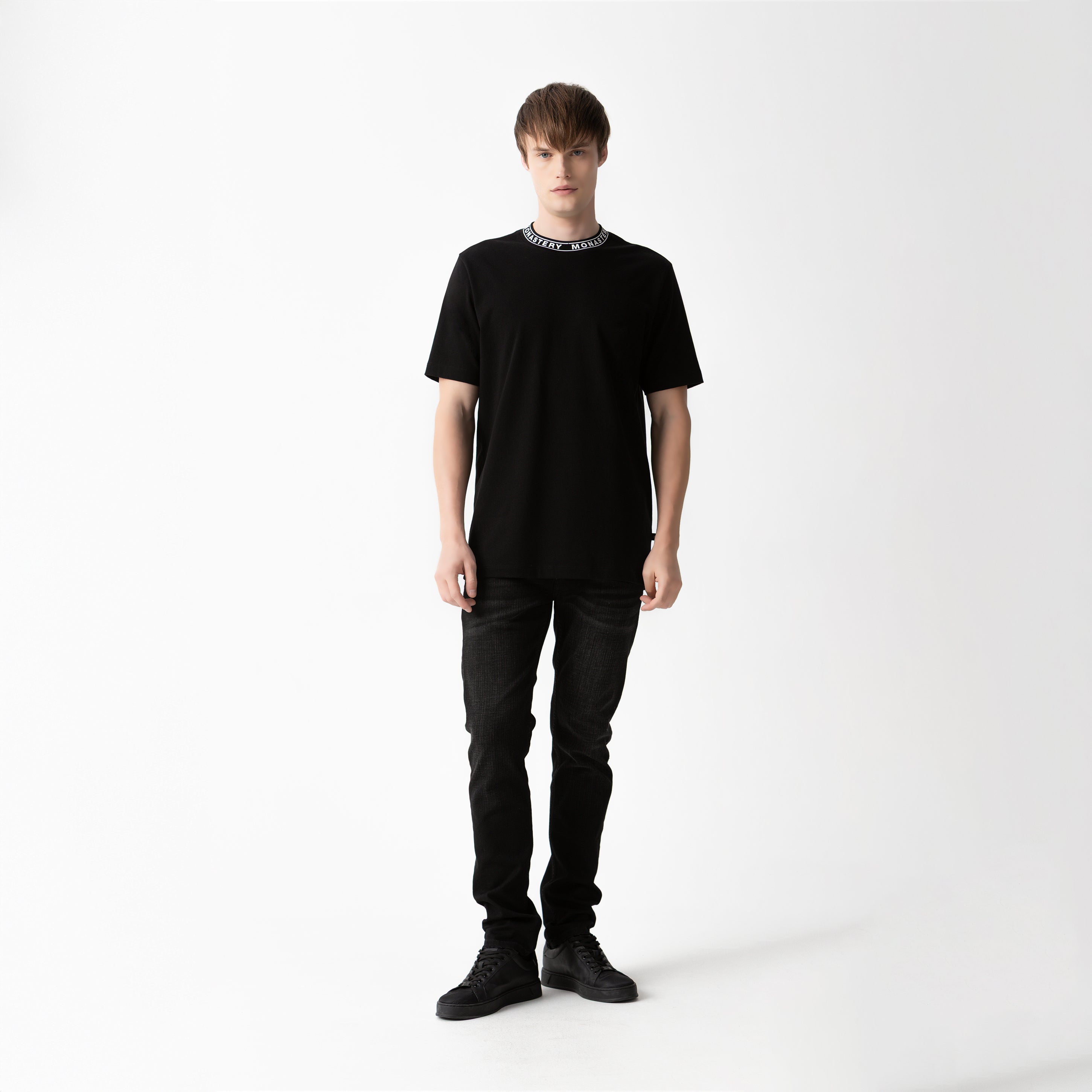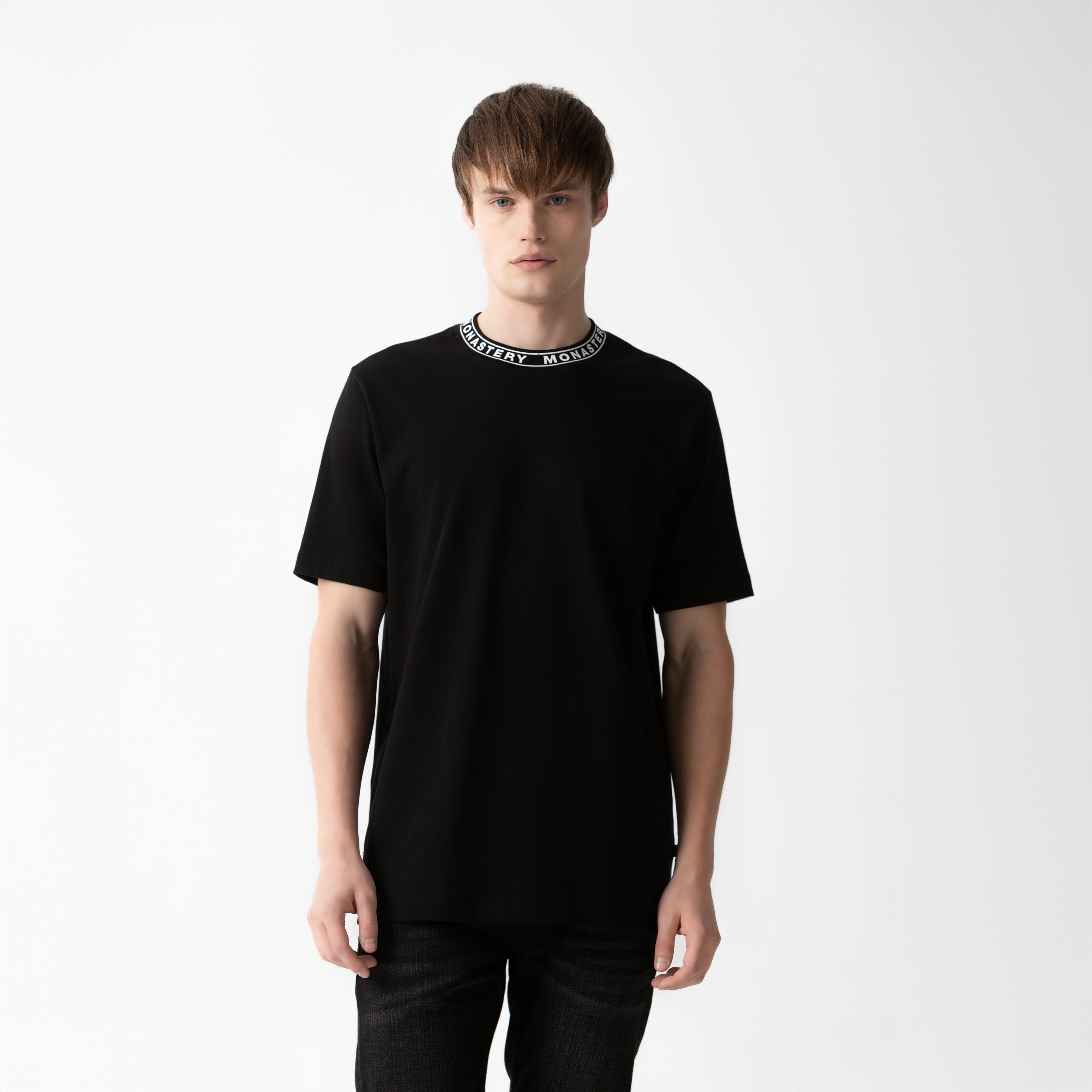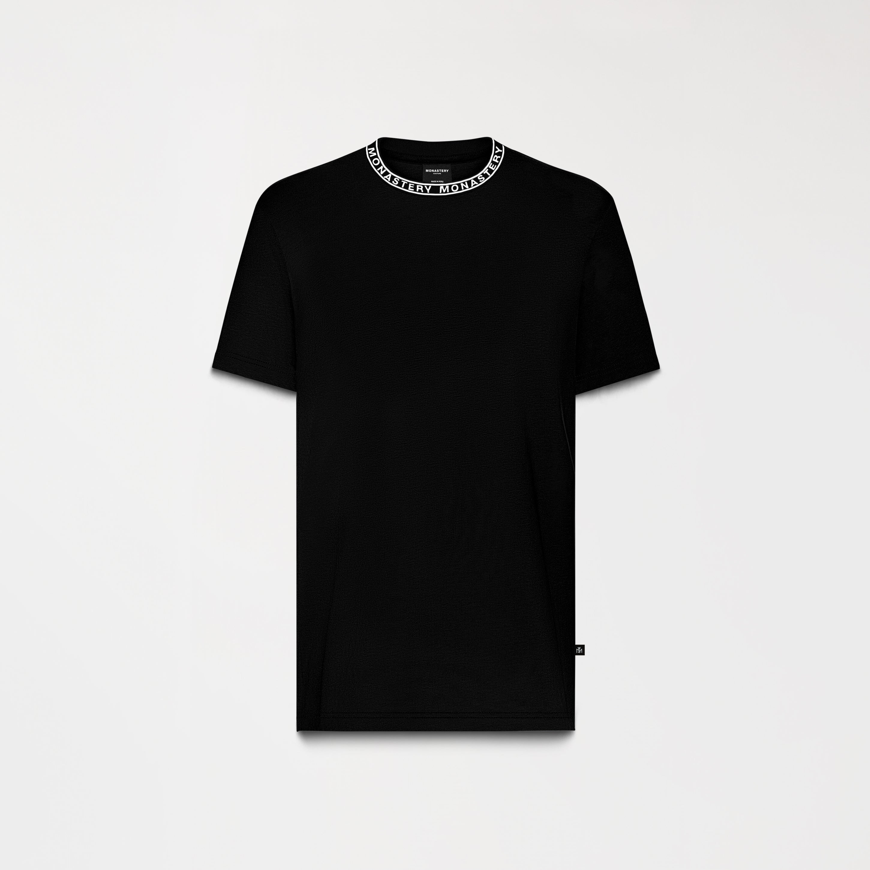 The Monastery logo, applied in a semi-high-density print on the collar, creates a tactile and distinctive detail, while the back features a flat-print graphic with a uniform finish.