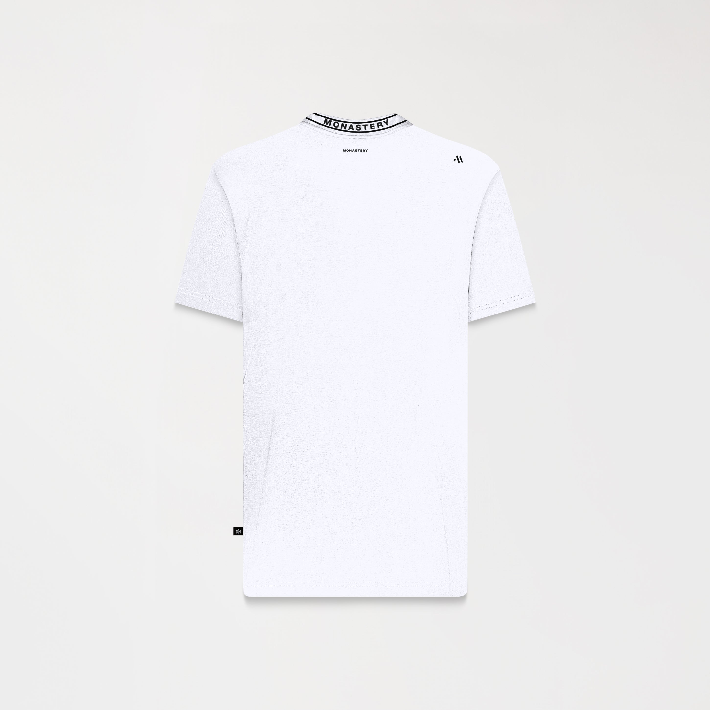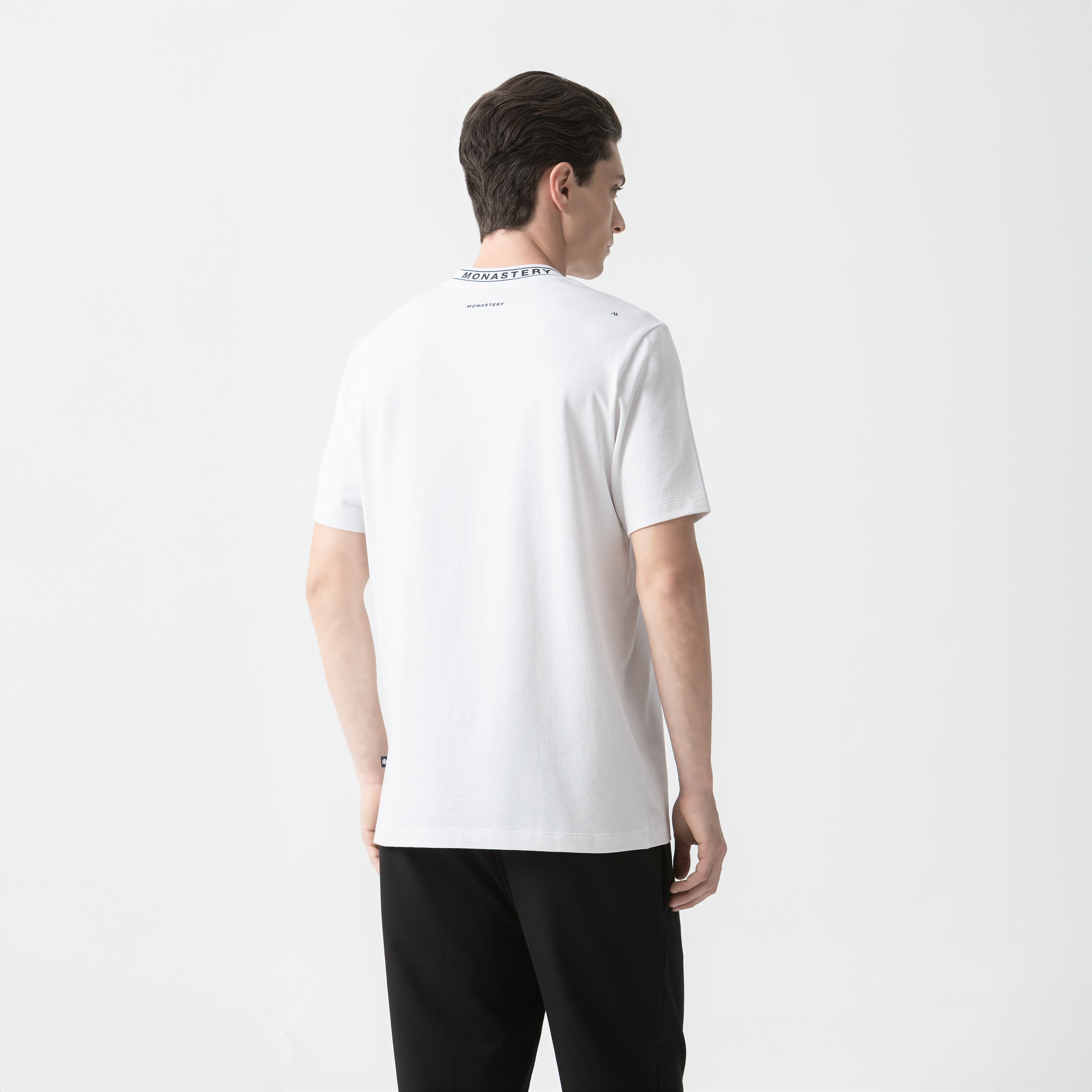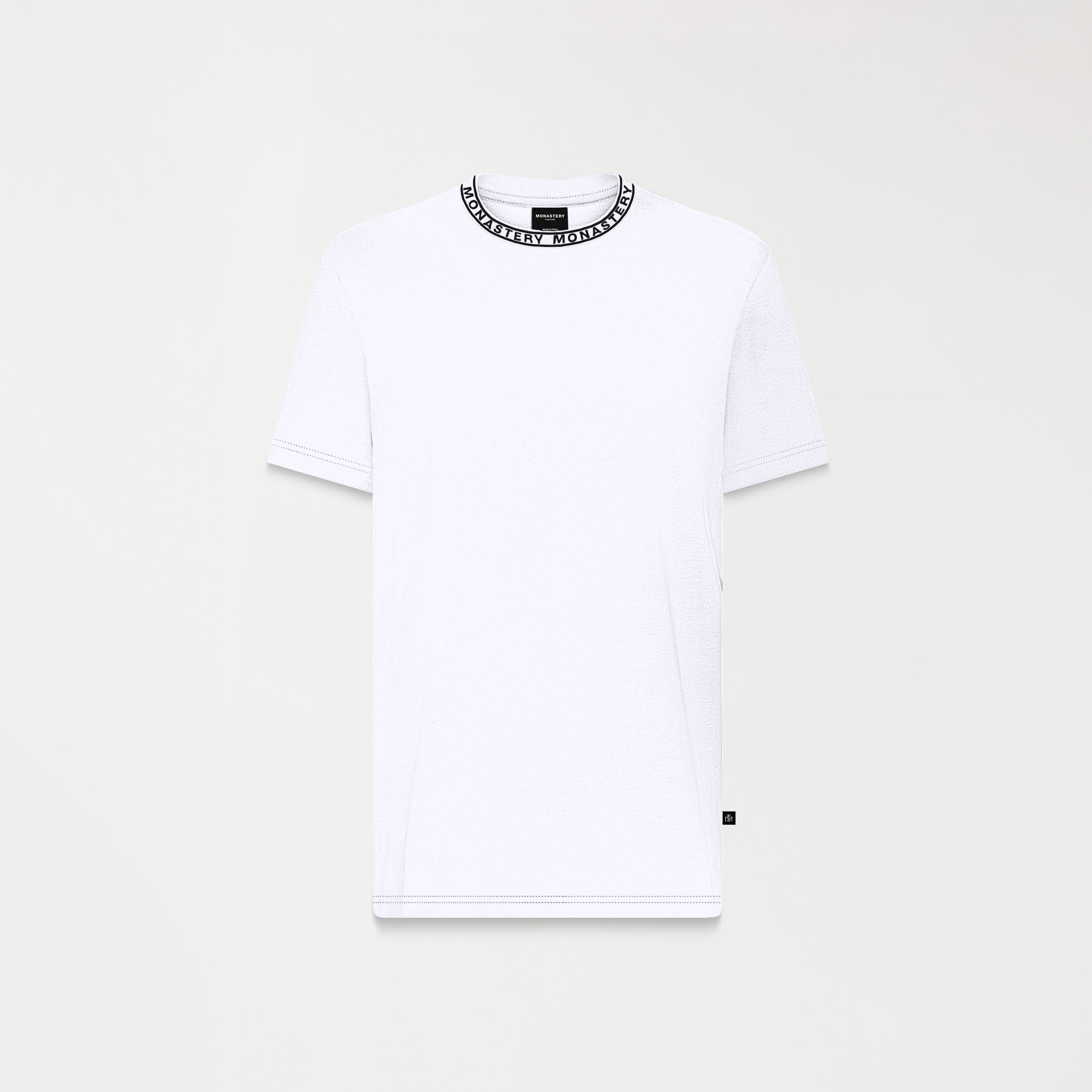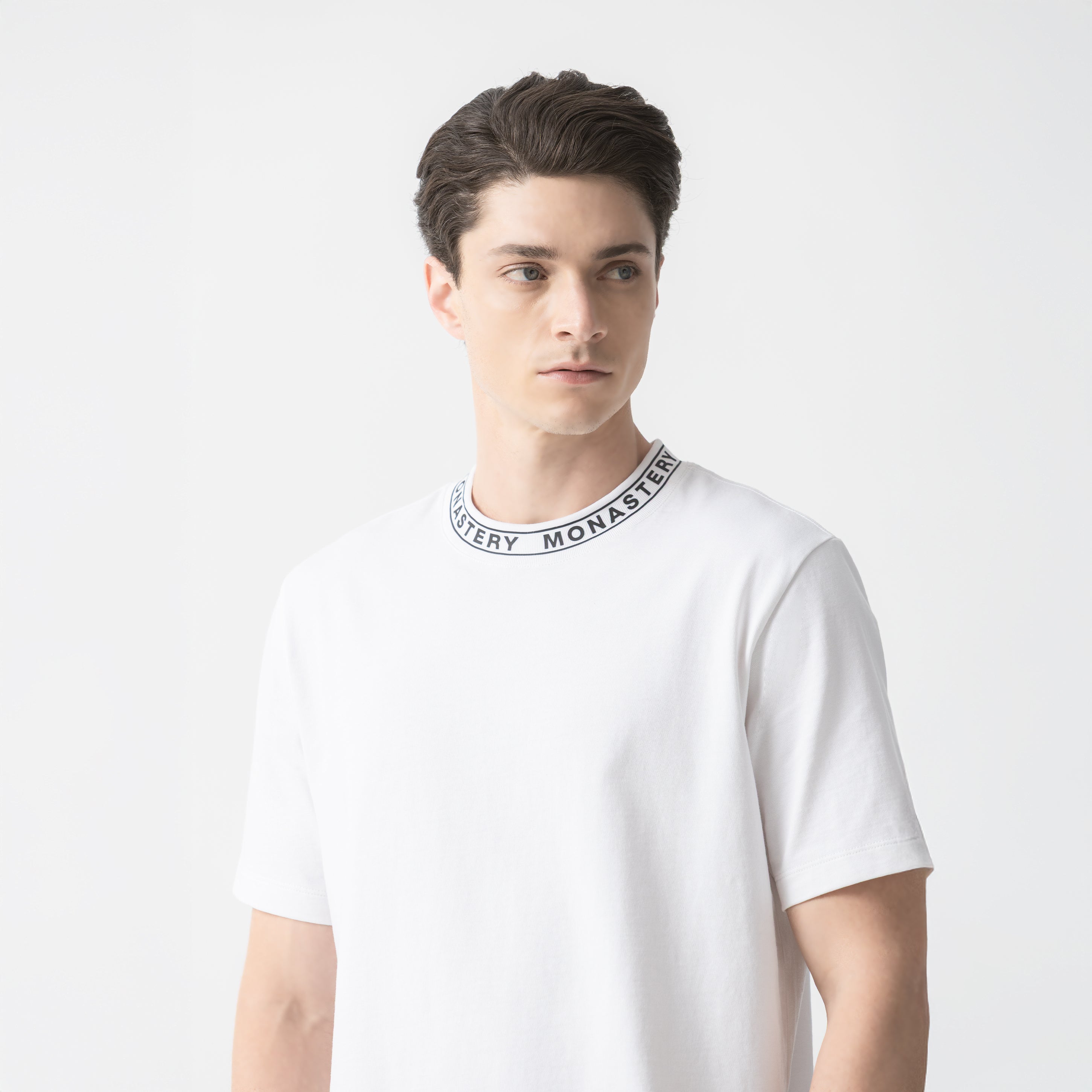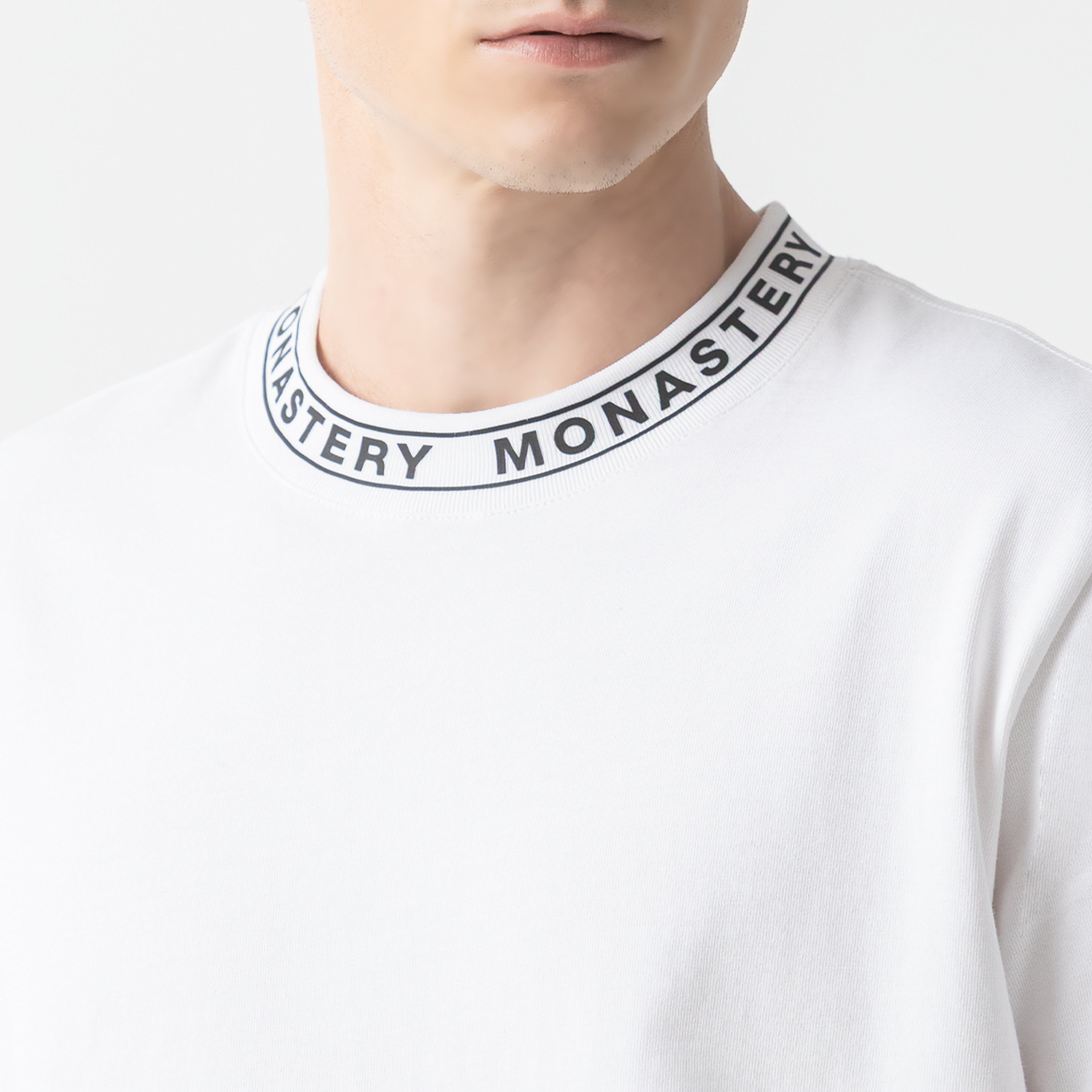 The Monastery logo, applied in a semi-high-density print on the collar, creates a tactile and distinctive detail, while the back features a flat-print graphic with a uniform finish.