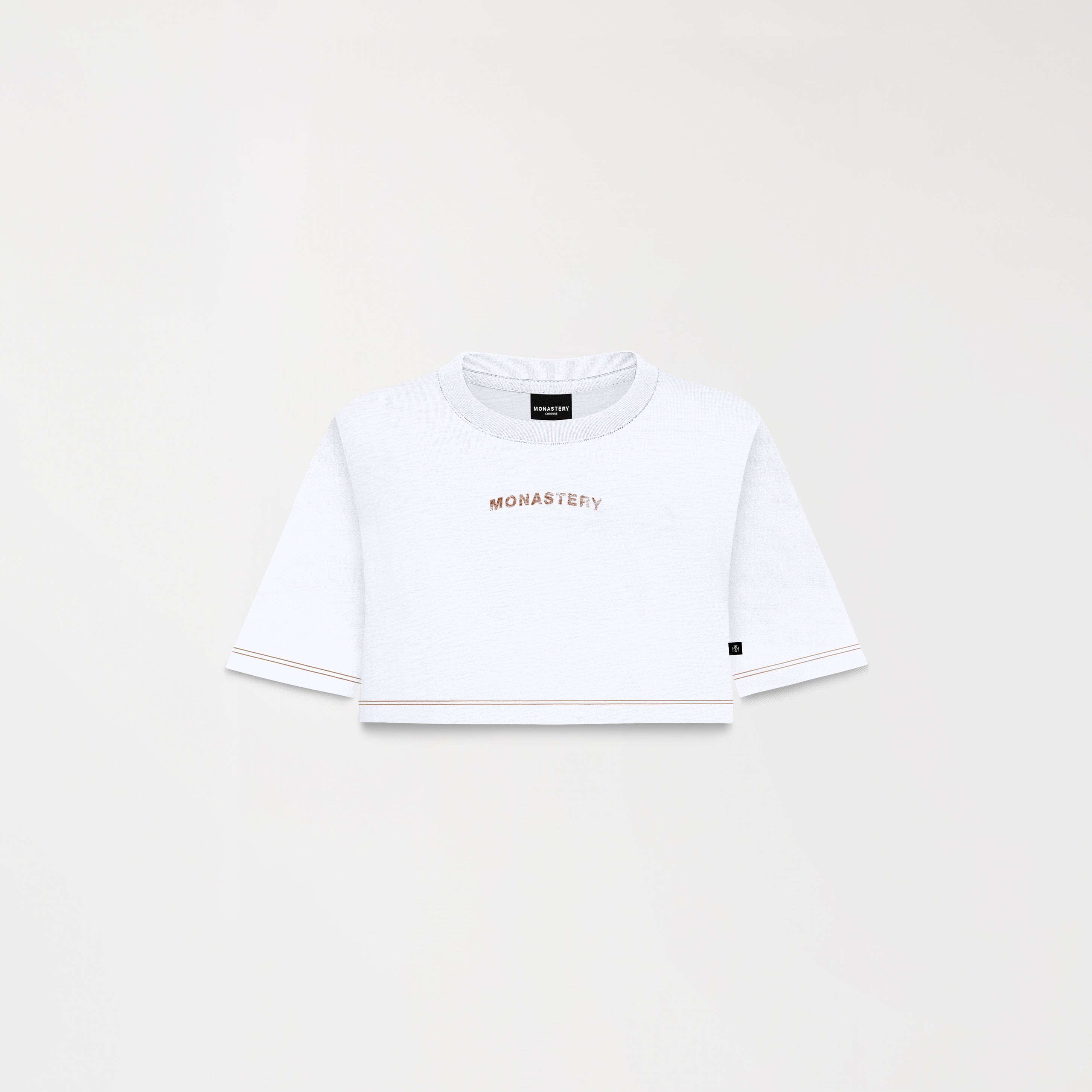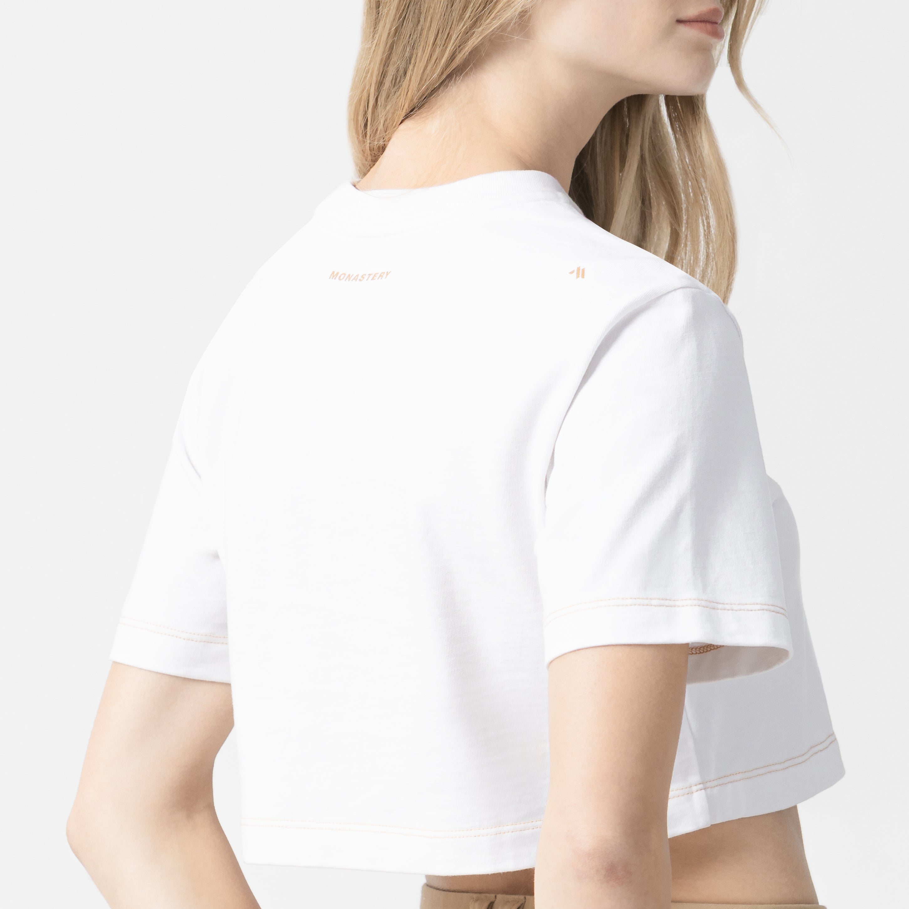 Keona is a crop top made from 100% high-quality, ultra-siliconized cotton, offering softness, breathability, and a perfect fit. Designed in a petite silhouette and available in black or white, it features a front graphic applied using a distressed technique, achieving a worn and authentic finish. The back incorporates a flat print, while the sleeves stand out with their biscuit-colored stitching, a signature shade of the collection that provides a subtle and original contrast.
