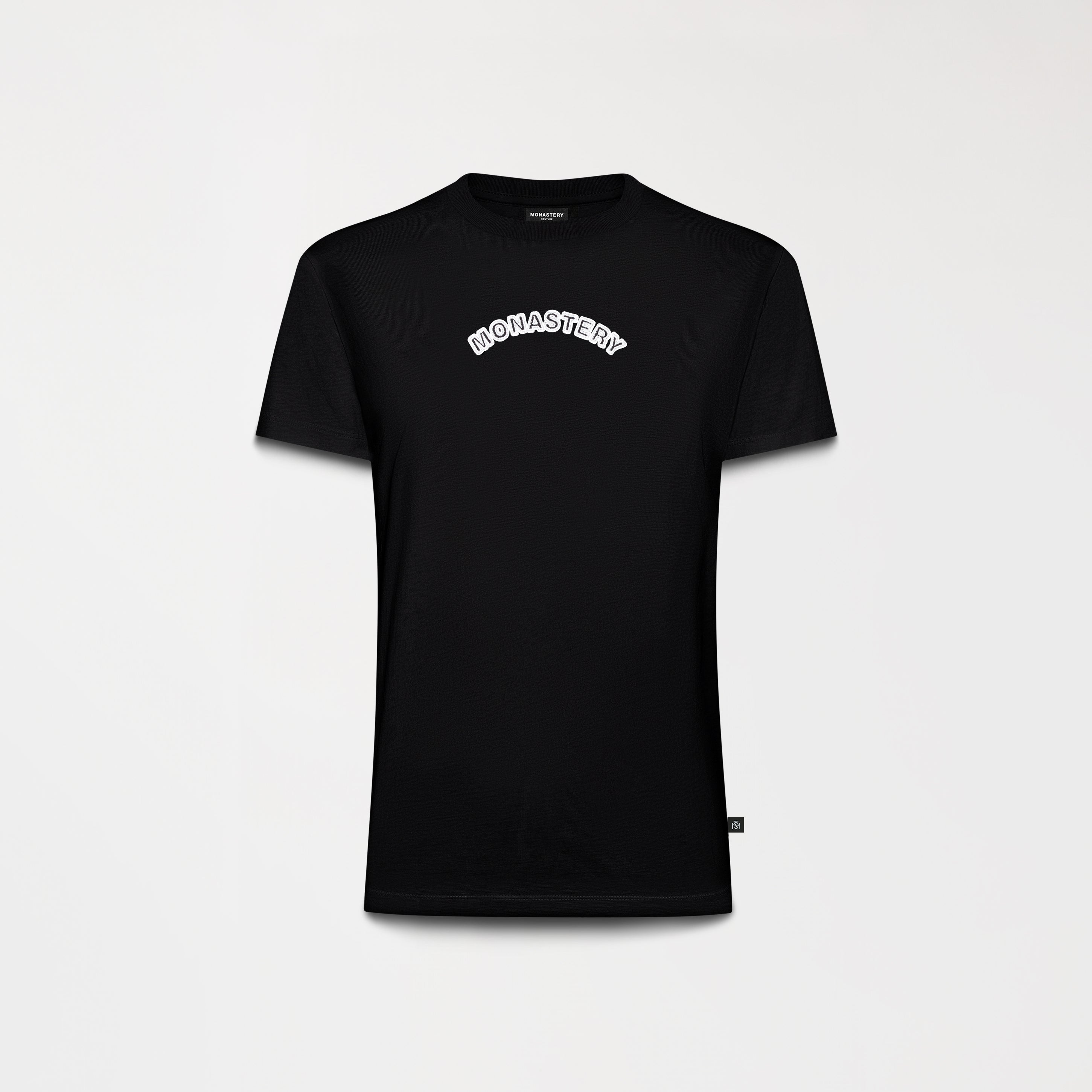 A feminine T-shirt crafted in a small silhouette designed to highlight the feminine figure through its fresh, fitted textile base. Kirsi features a curved Monastery design in the center of the front using a flat print + lurex embroidery technique. It is a dynamic garment thanks to its texture on the front and its combination of techniques. It adds elegance through its lurex shine, accompanied by our insignia logos on the back. This garment features details that give it a unique and exclusive touch, while maintaining the comfort and versatility of a basic garment.
