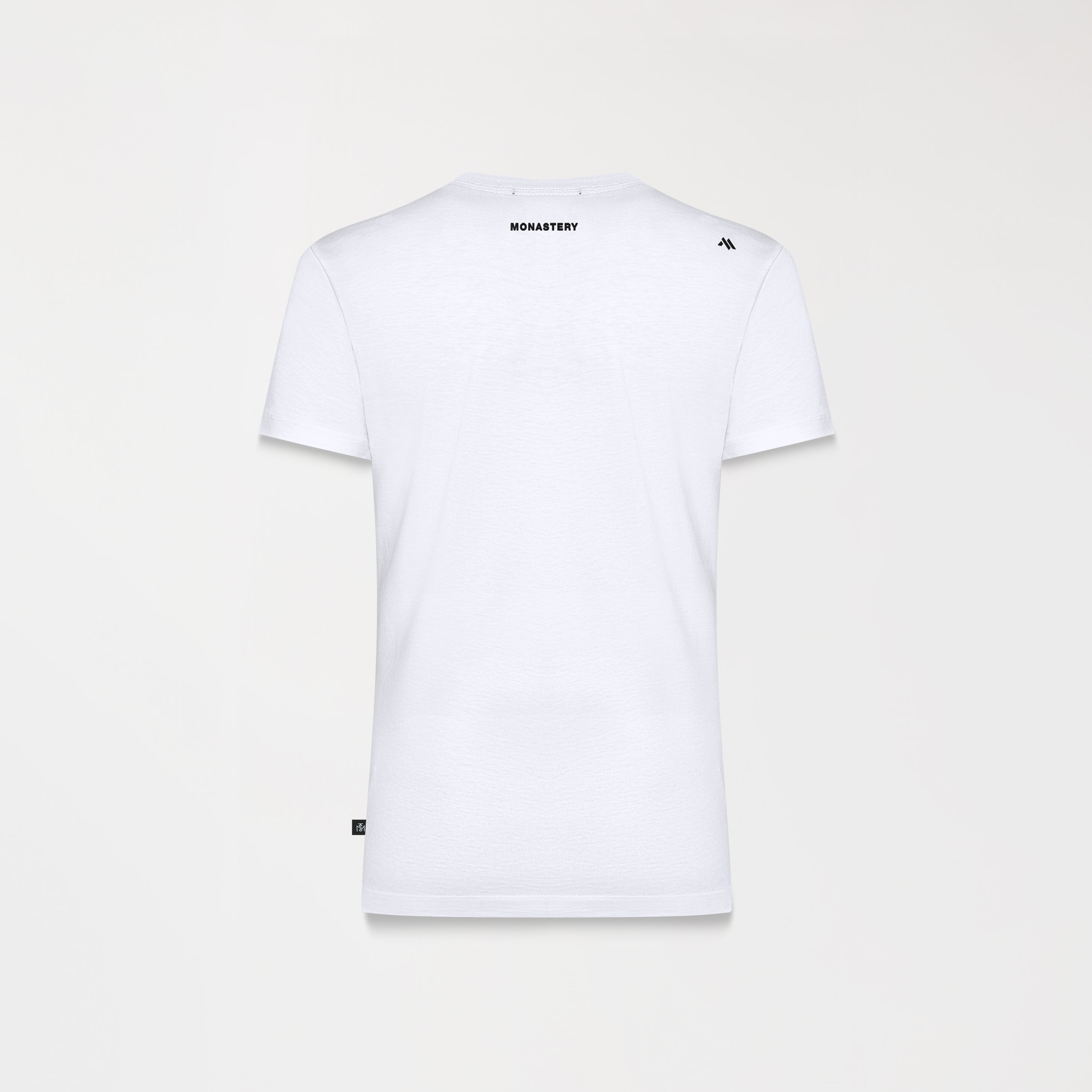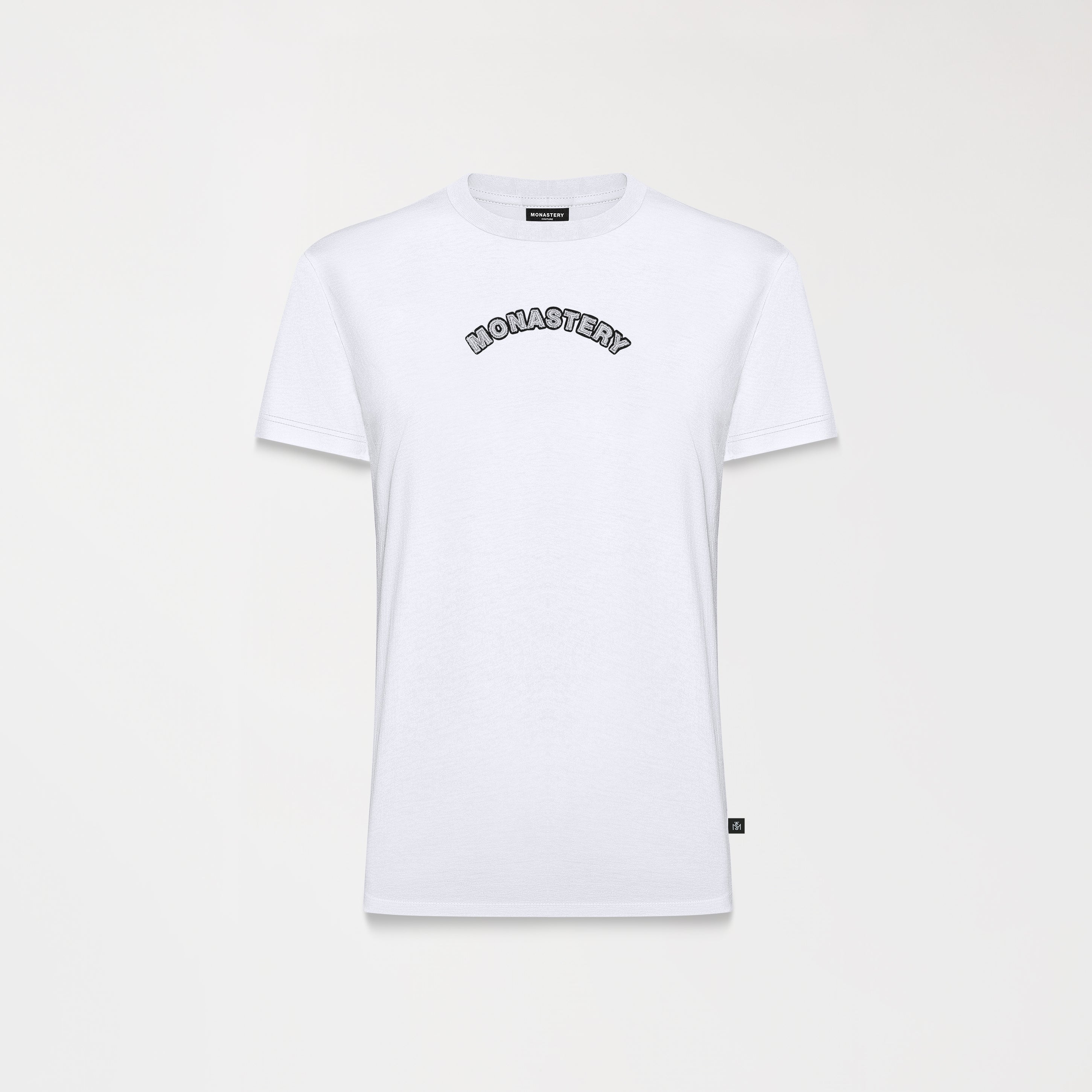 A feminine T-shirt crafted in a small silhouette designed to highlight the feminine figure through its fresh, fitted textile base. Kirsi features a curved Monastery design in the center of the front using a flat print + lurex embroidery technique. It is a dynamic garment thanks to its texture on the front and its combination of techniques. It adds elegance through its lurex shine, accompanied by our insignia logos on the back. This garment features details that give it a unique and exclusive touch, while maintaining the comfort and versatility of a basic garment.