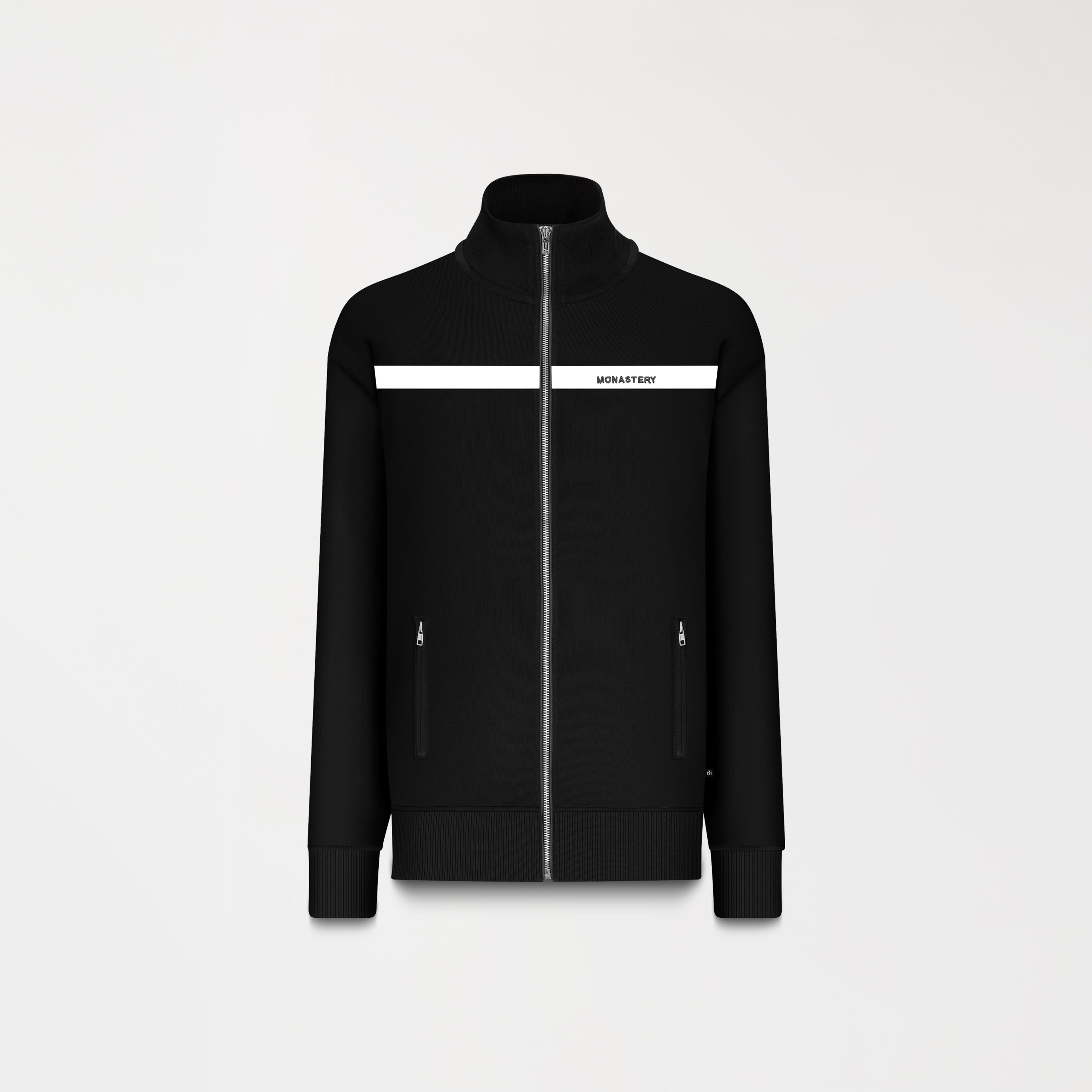 Luminus is a set consisting of a jacket and joggers in double-faced knit fabric, with a regular silhouette that combines comfort and sophistication. The jacket features zippered pockets, a contrasting trim, an embroidered Monastery logo, and a high-density print on the back for added character. The joggers feature a matching drawstring, front and back pockets, and an internal pocket for small items. The contrasting details reflect meticulous attention to detail. An ideal set for an elegant standout in casual settings.