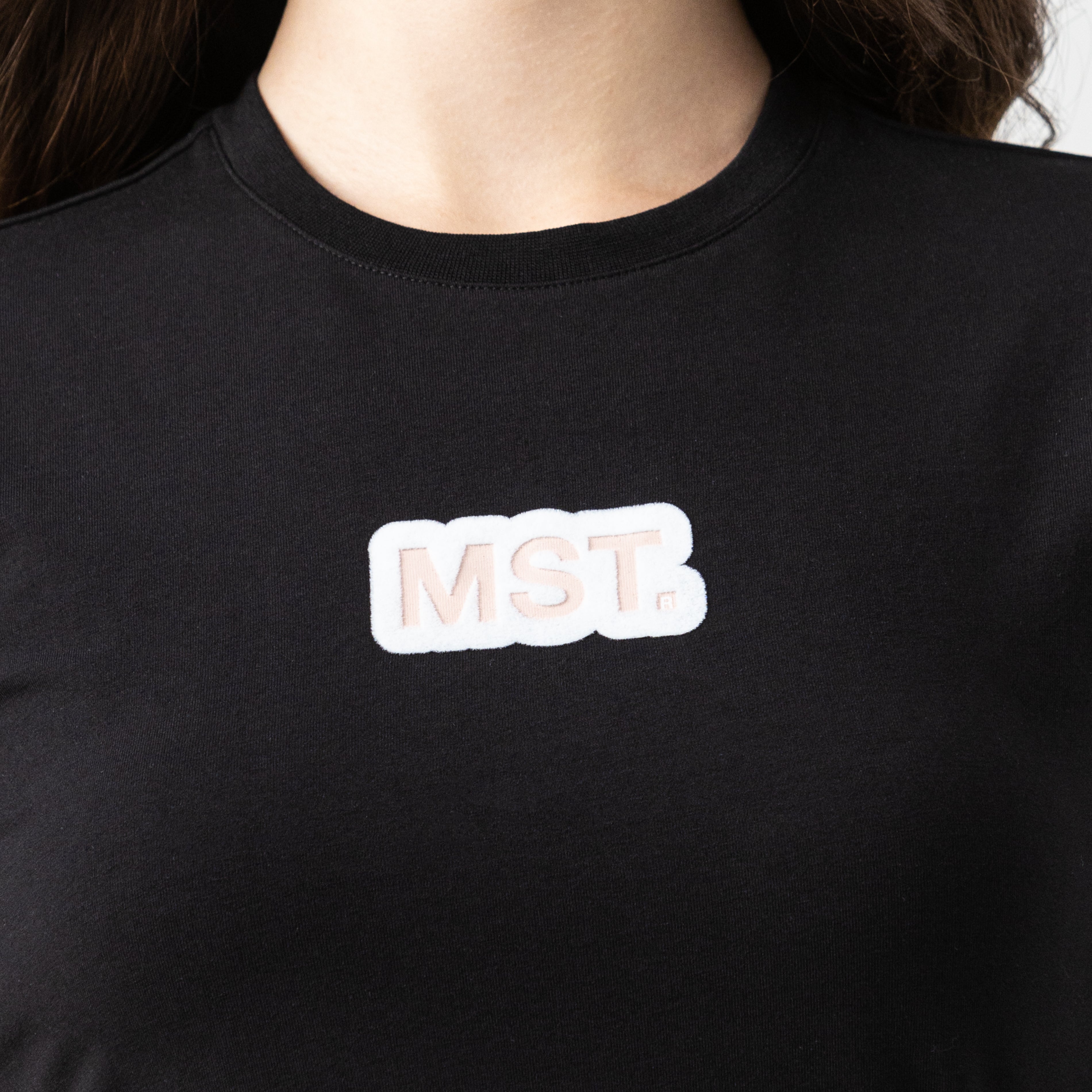 A women's T-shirt crafted in a small silhouette designed to highlight the feminine figure through its fresh, fitted textile base. Marie features MST artwork on the front using a Flock + Plastisol technique. It is a dynamic garment thanks to its textured front and its combination of techniques, accompanied by our signature logos on the back. This garment features details that give it a unique and exclusive touch, while maintaining the comfort and versatility of a basic garment.