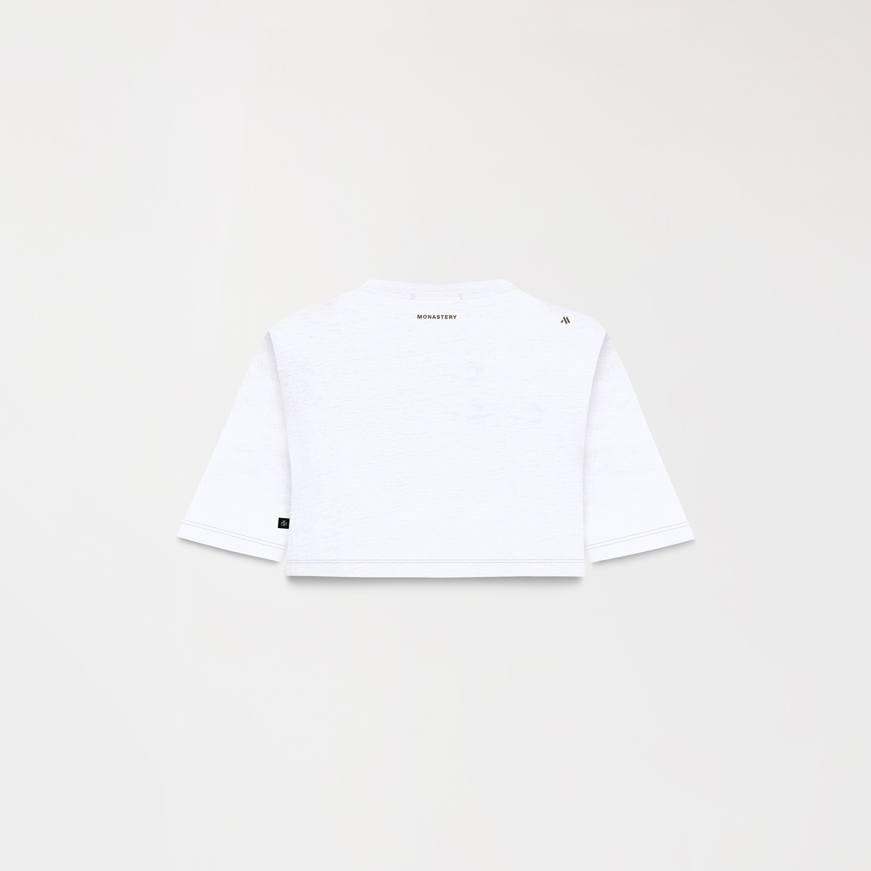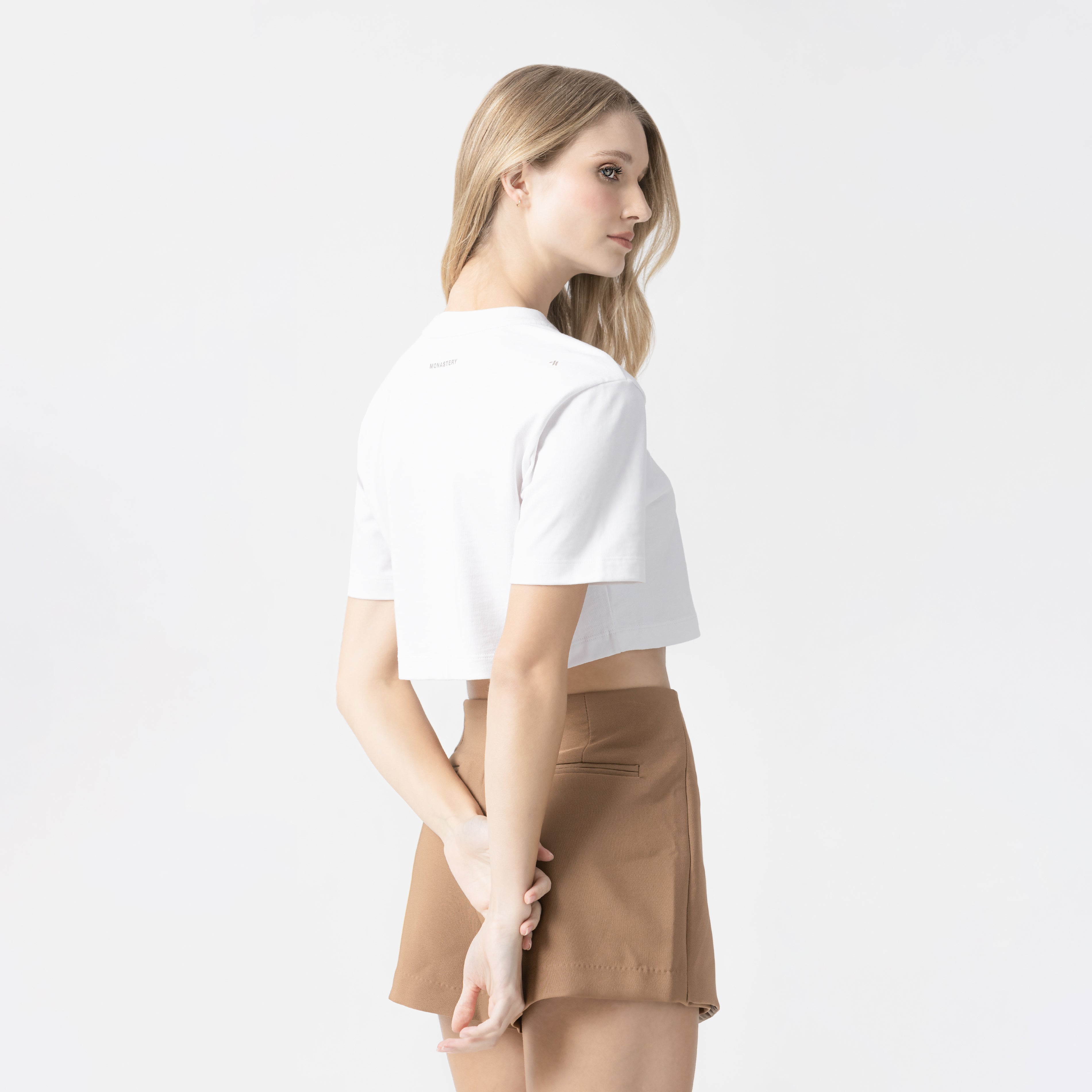 Med is a crop top made from 100% high-quality, ultra-siliconized cotton, providing softness, breathability, and a perfect fit. Designed in a petite silhouette and available in three colors—white, black, and White Asparagus, an exclusive shade from the collection—it features a multi-colored flat embroidery on the front, inspired by the season's key colors. The back incorporates flat print artwork that complements and balances the design, creating a versatile and sophisticated piece.