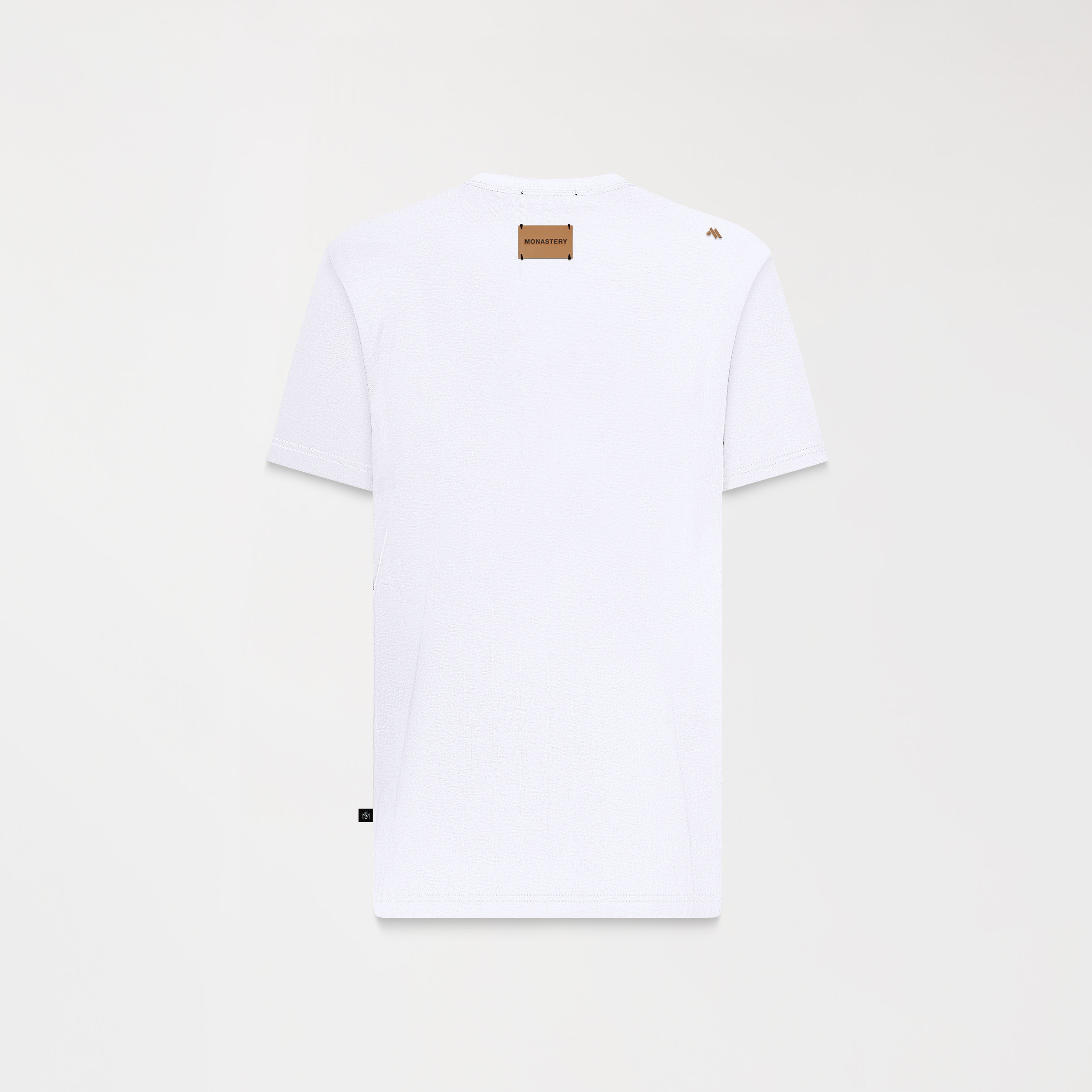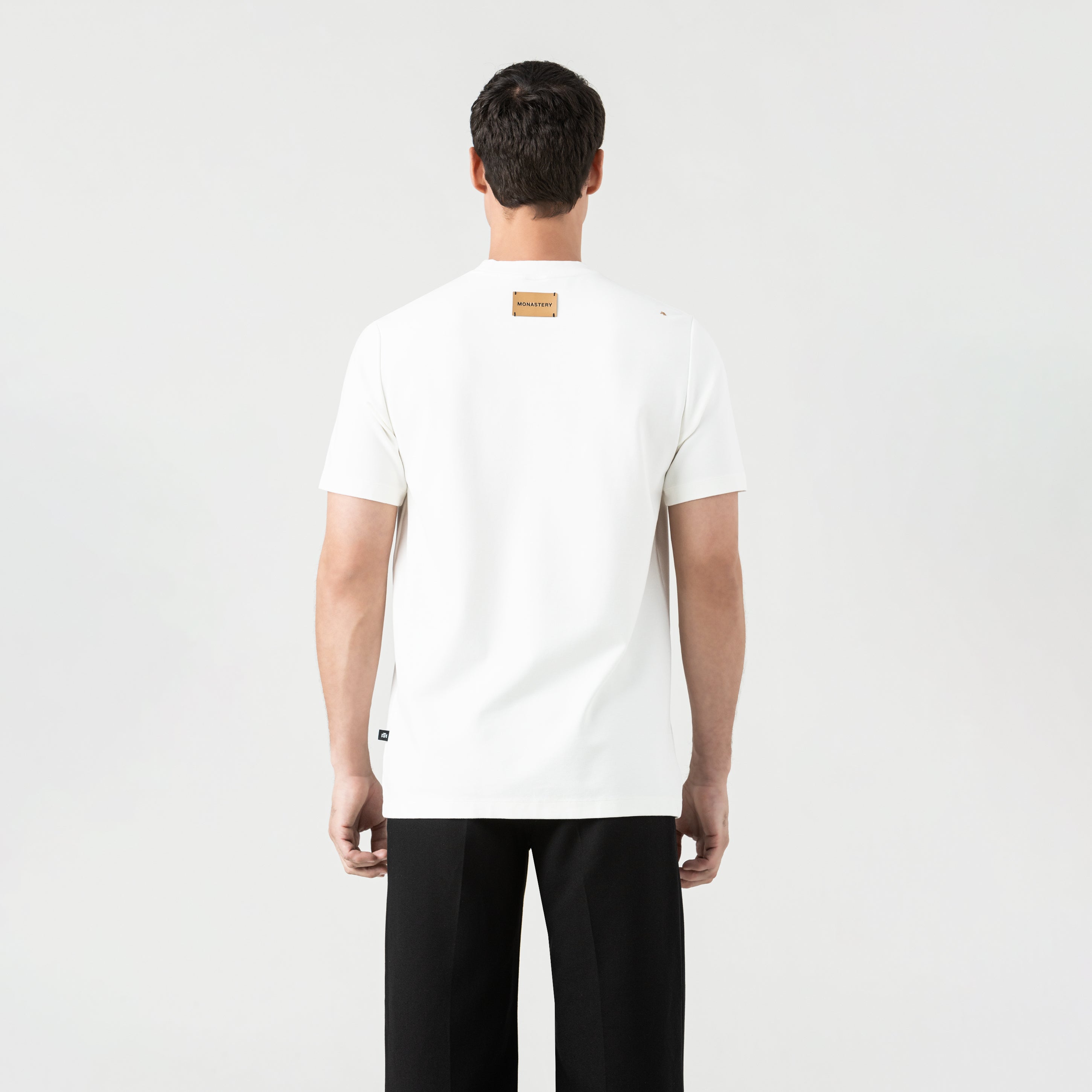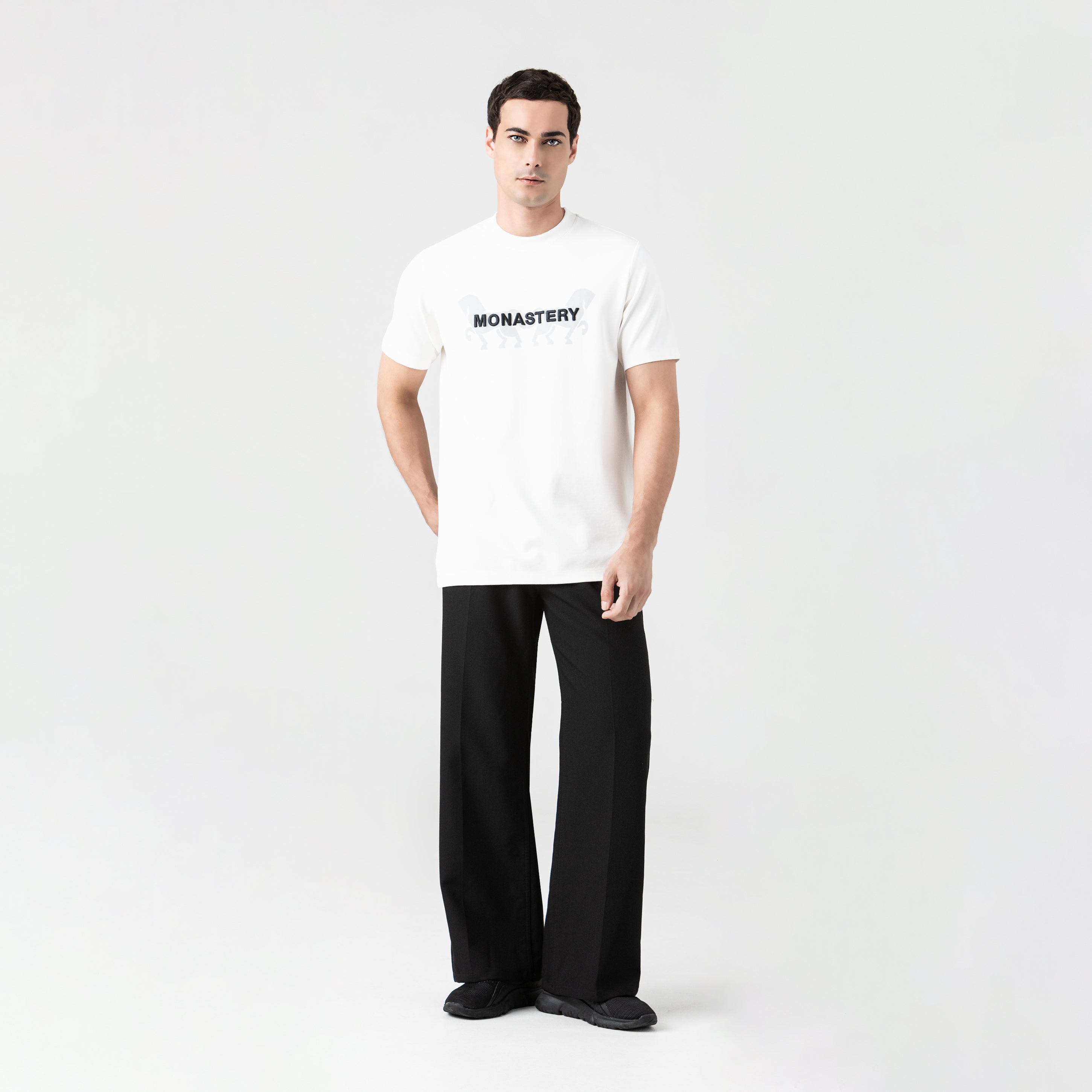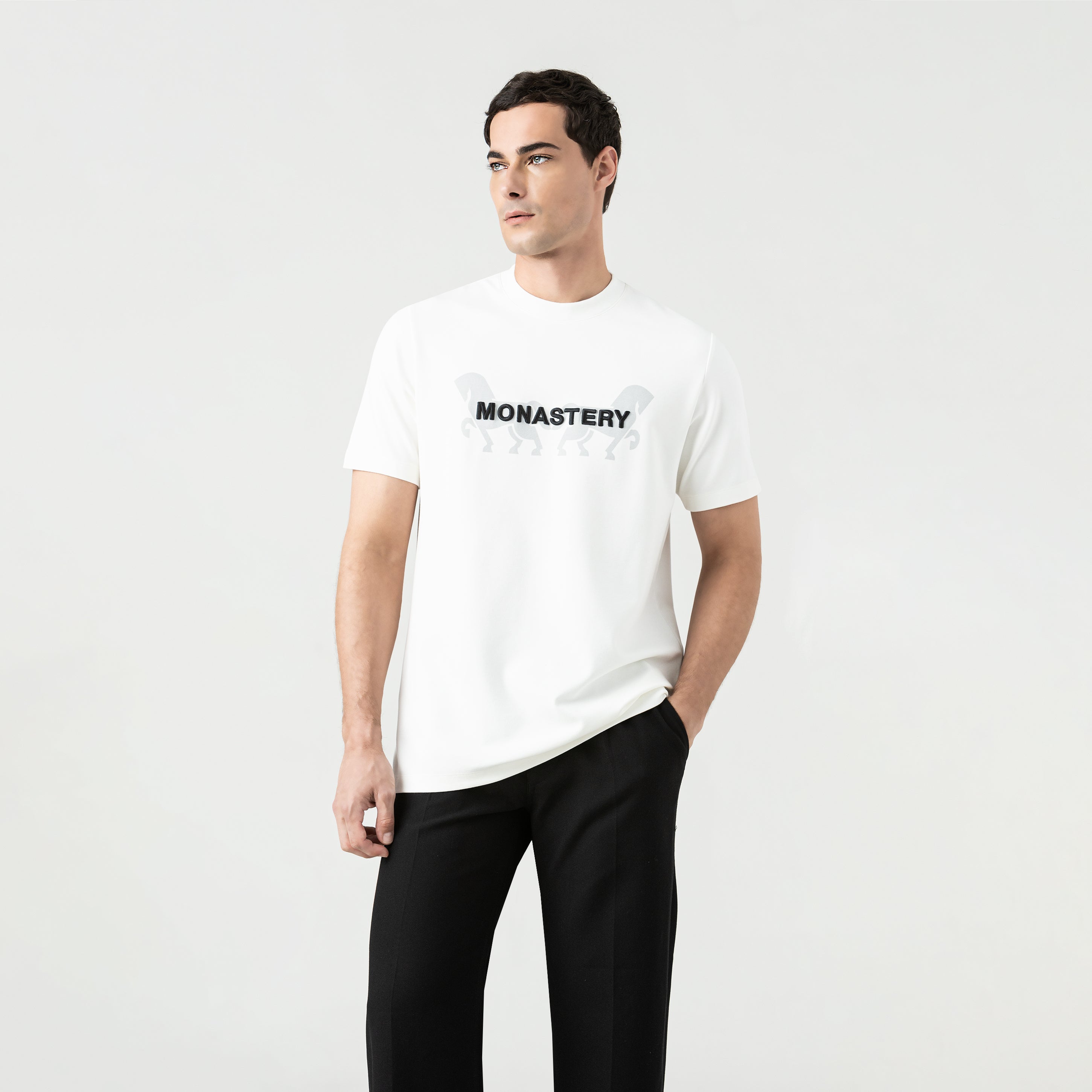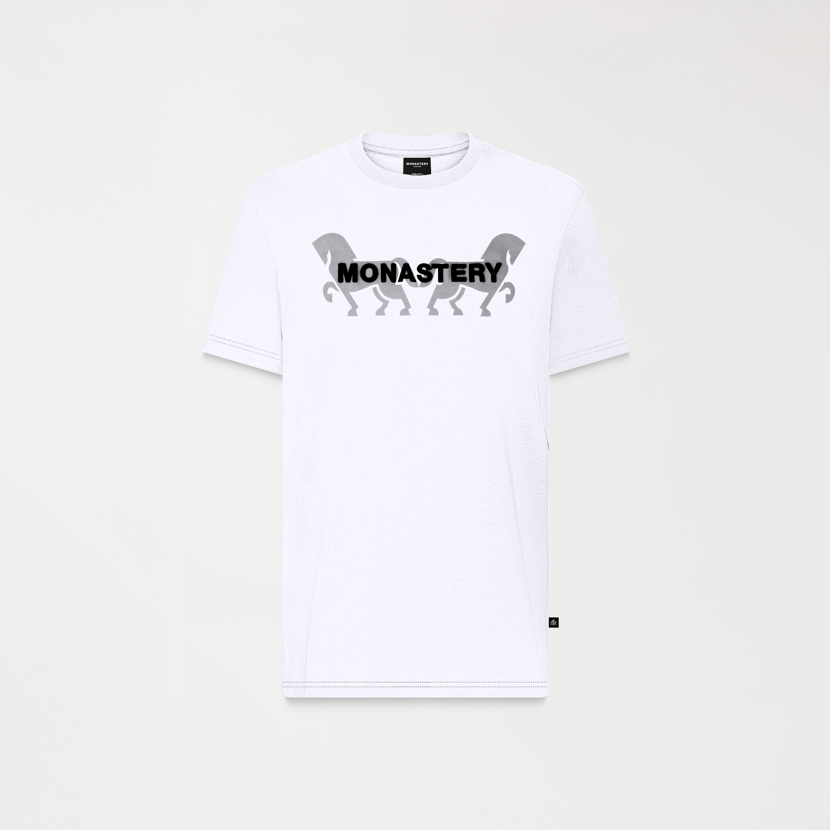 Mustang is a men's t-shirt crafted from high-quality MST Napoleon fabric, with a regular fit and a 2.5cm ribbed collar. On the front, two horses in a zero-touch print evoke strength and dynamism with subtle execution, while the 3D embroidered logo adds dimension and character. On the back, a high-density appliqué of the Monastery logo combines with the insignia, consolidating its identity. A piece designed for those seeking elegance and distinction in casual settings.