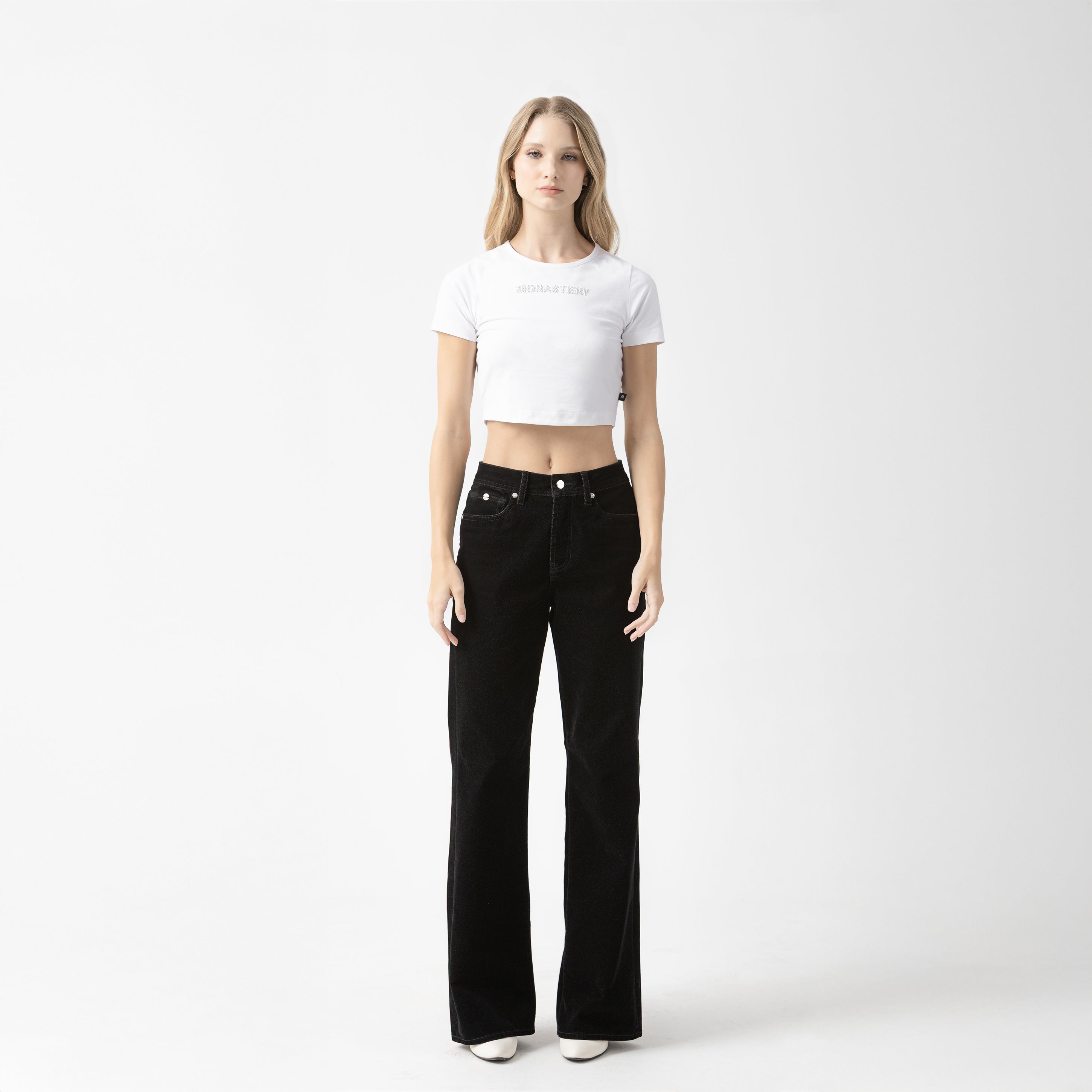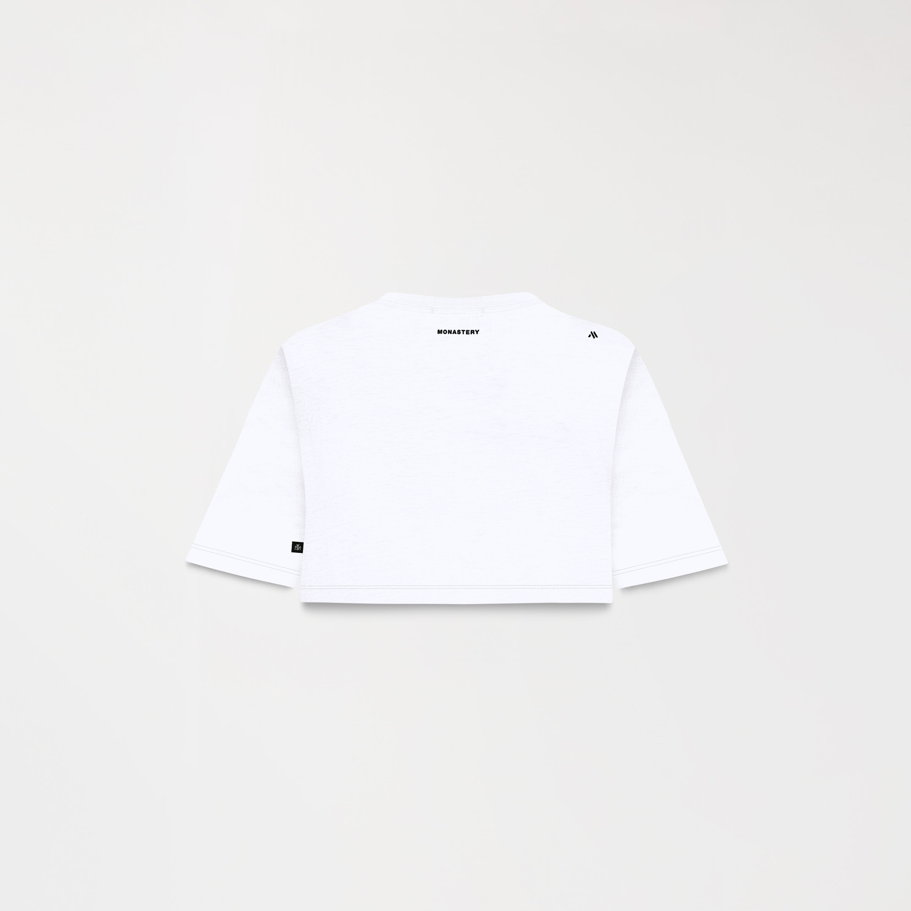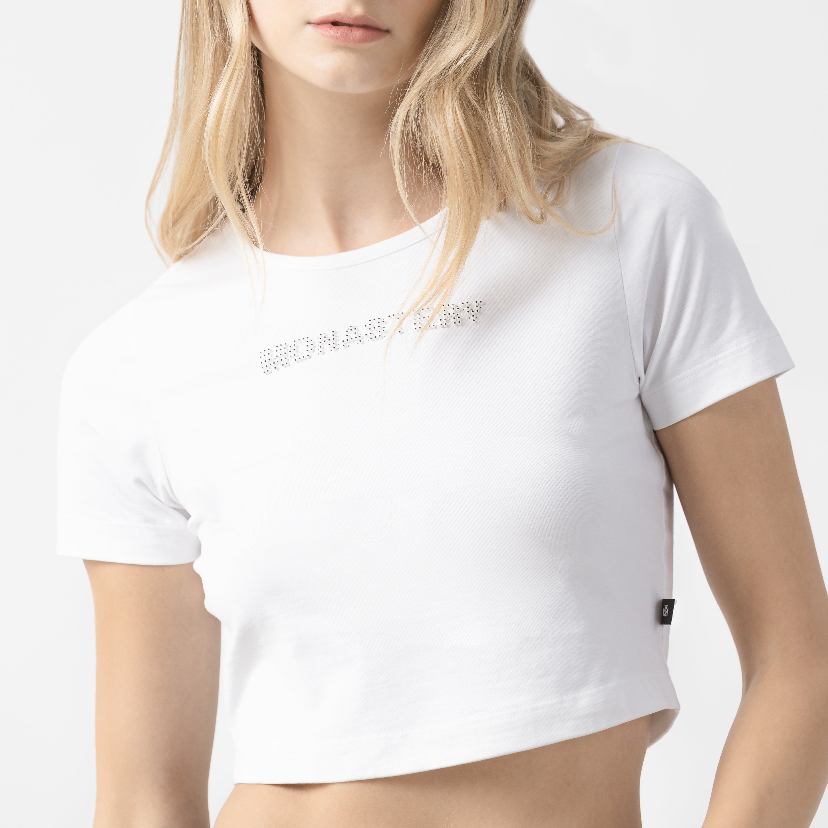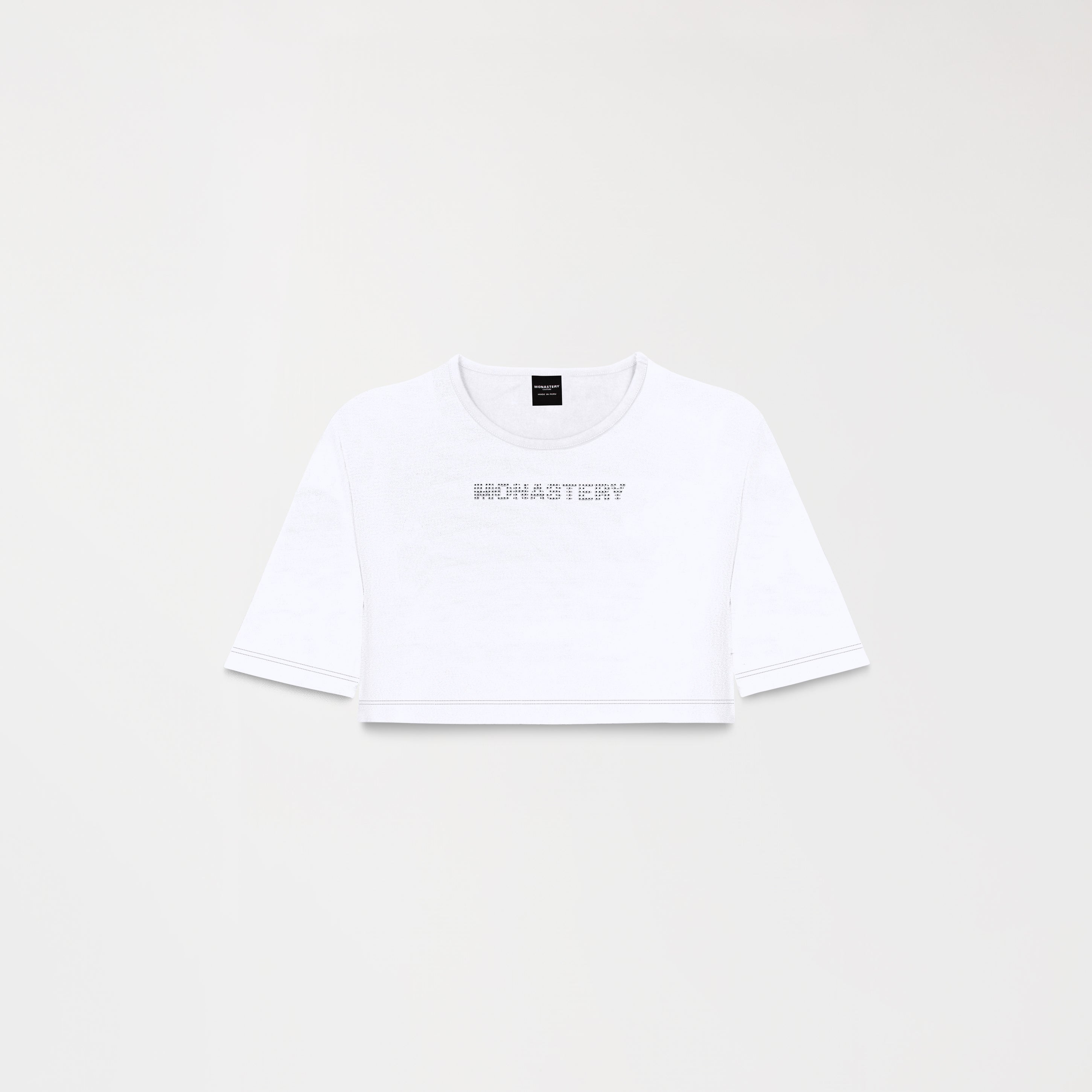 Nicolle is a cool, fitted crop top crafted from a textile base with a slanted neckline.
