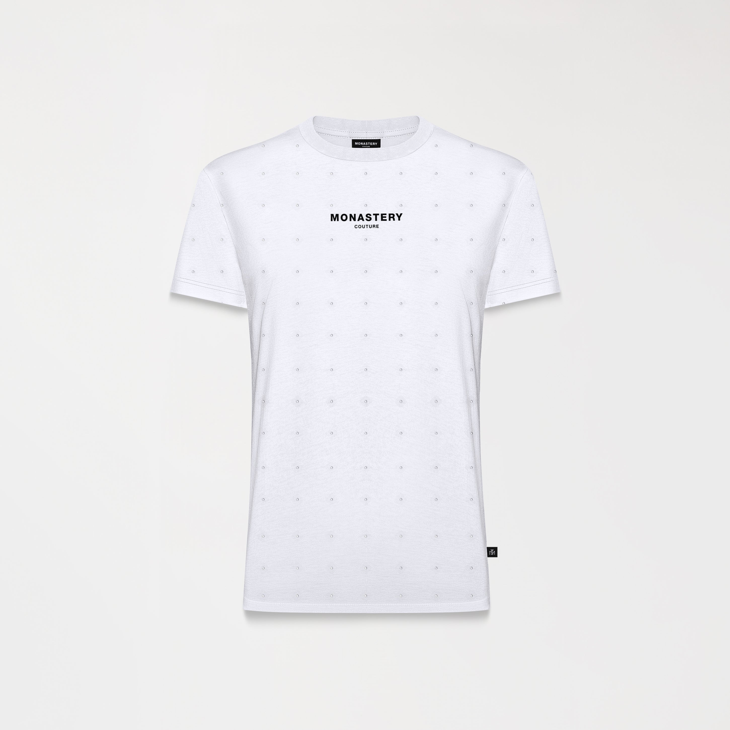 A feminine T-shirt crafted in a small silhouette designed to highlight the feminine figure through its fresh, fitted textile base. Qylla is a design featuring crystals continuously applied throughout the garment, precisely arranged to create a dynamic effect. It features the Monastery Couture logo in the center front using a transfer technique, which reinforces the visual contrast without detracting from the design. The back features signature artwork in a flat print, perfect for a striking elegance.