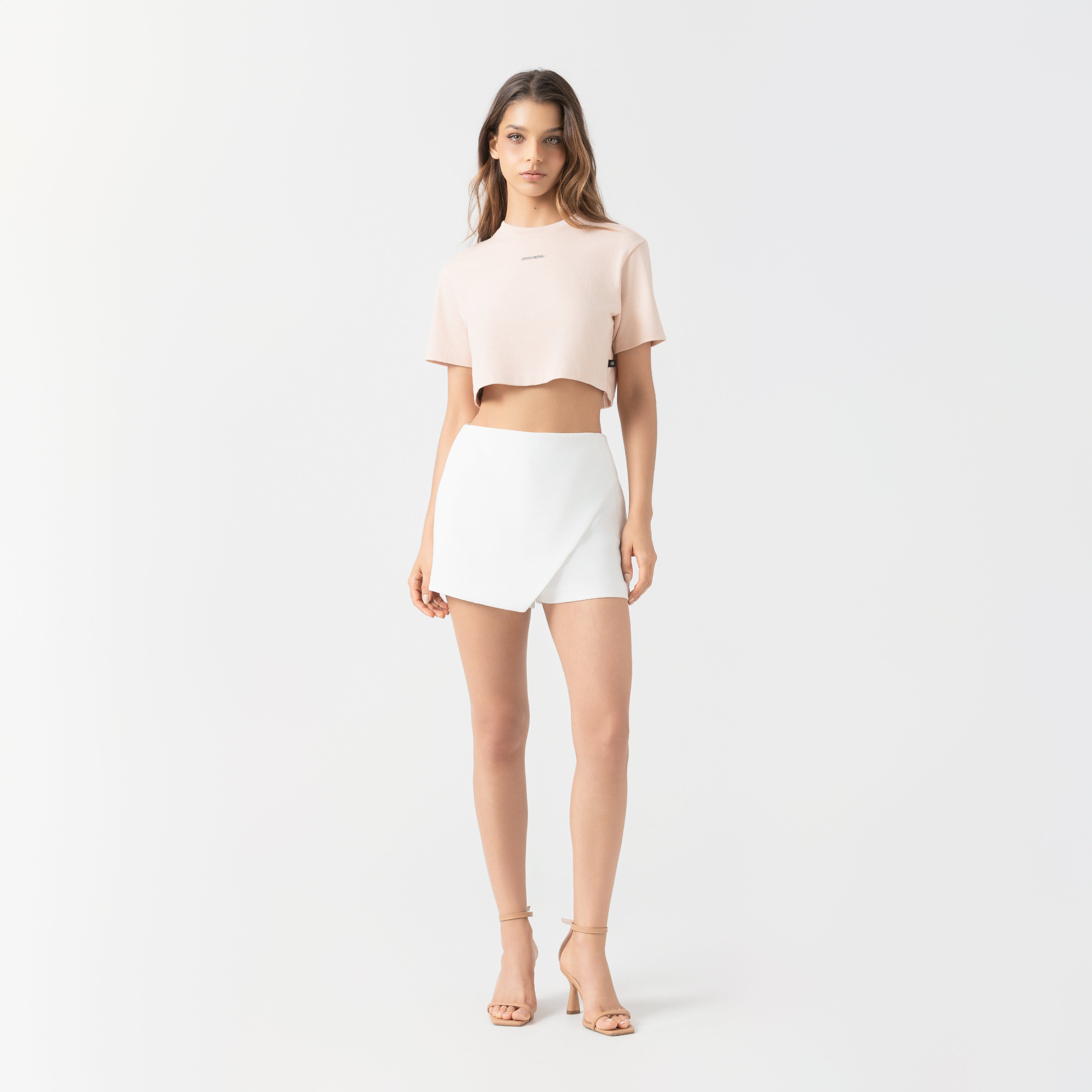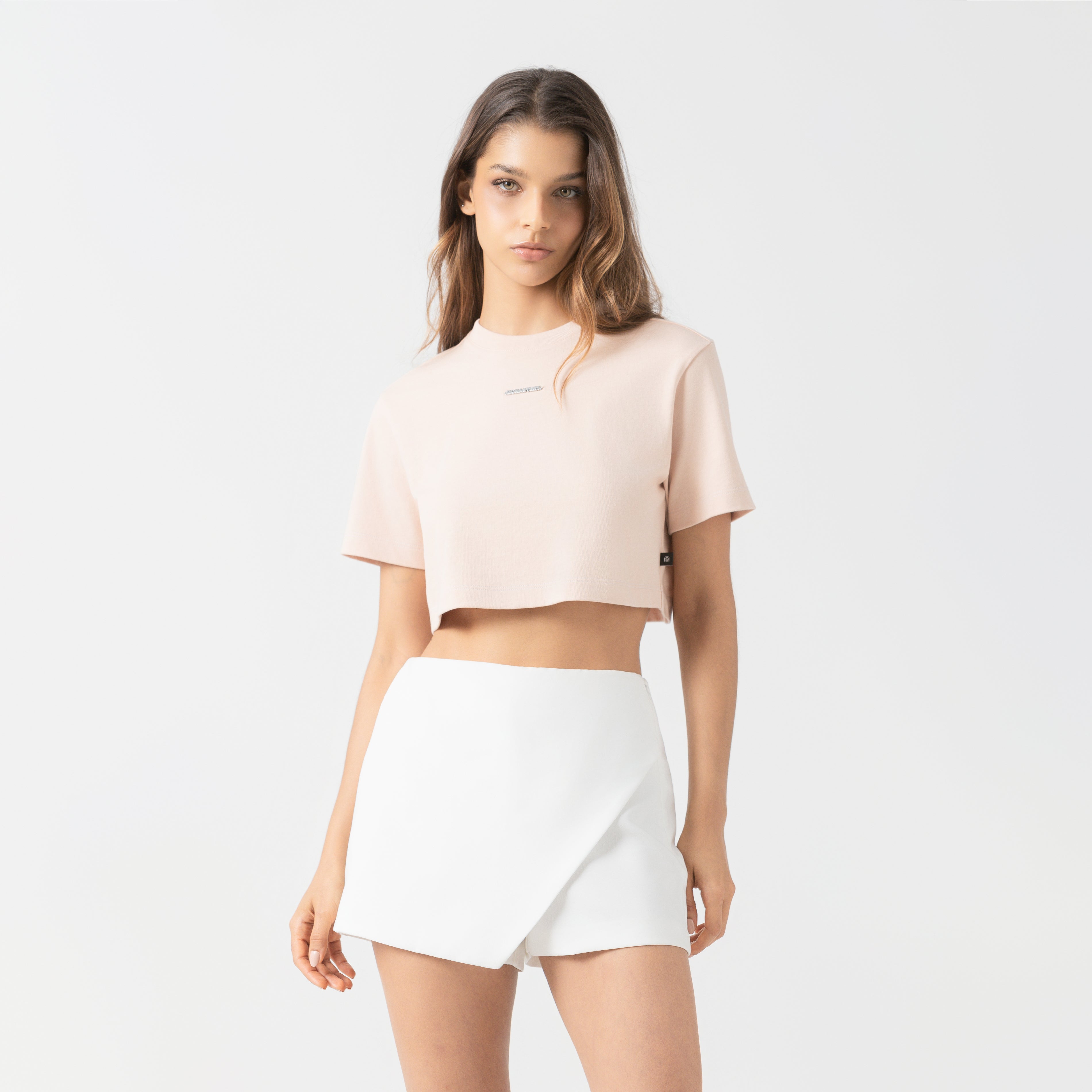 Savanna is a crop top made from 100% high-quality, ultra-silicone-coated cotton that offers softness, freshness, and an excellent fit. It is crafted in a petite silhouette and is available in three colors: white, black, and cameo rose, a color exclusive to the collection. This crop top stands out for its metallic appliqué on the front, representative of the collection. The fabric is presented in a striking contrasting tone that adds a bold touch to the design. The back features a foil print that adds shine and style. As a novelty, its contrasting stitching elevates the design with a visually striking finish.
