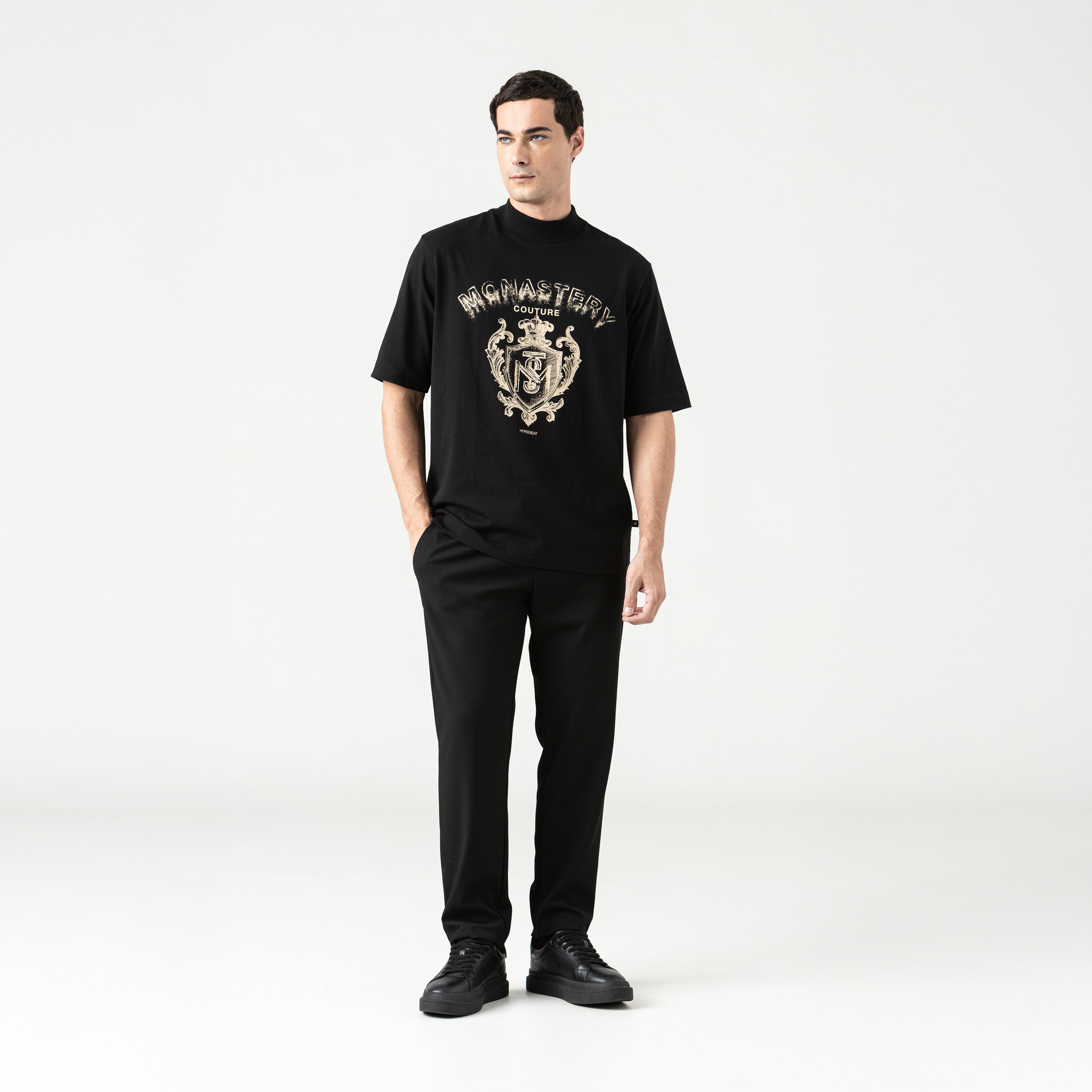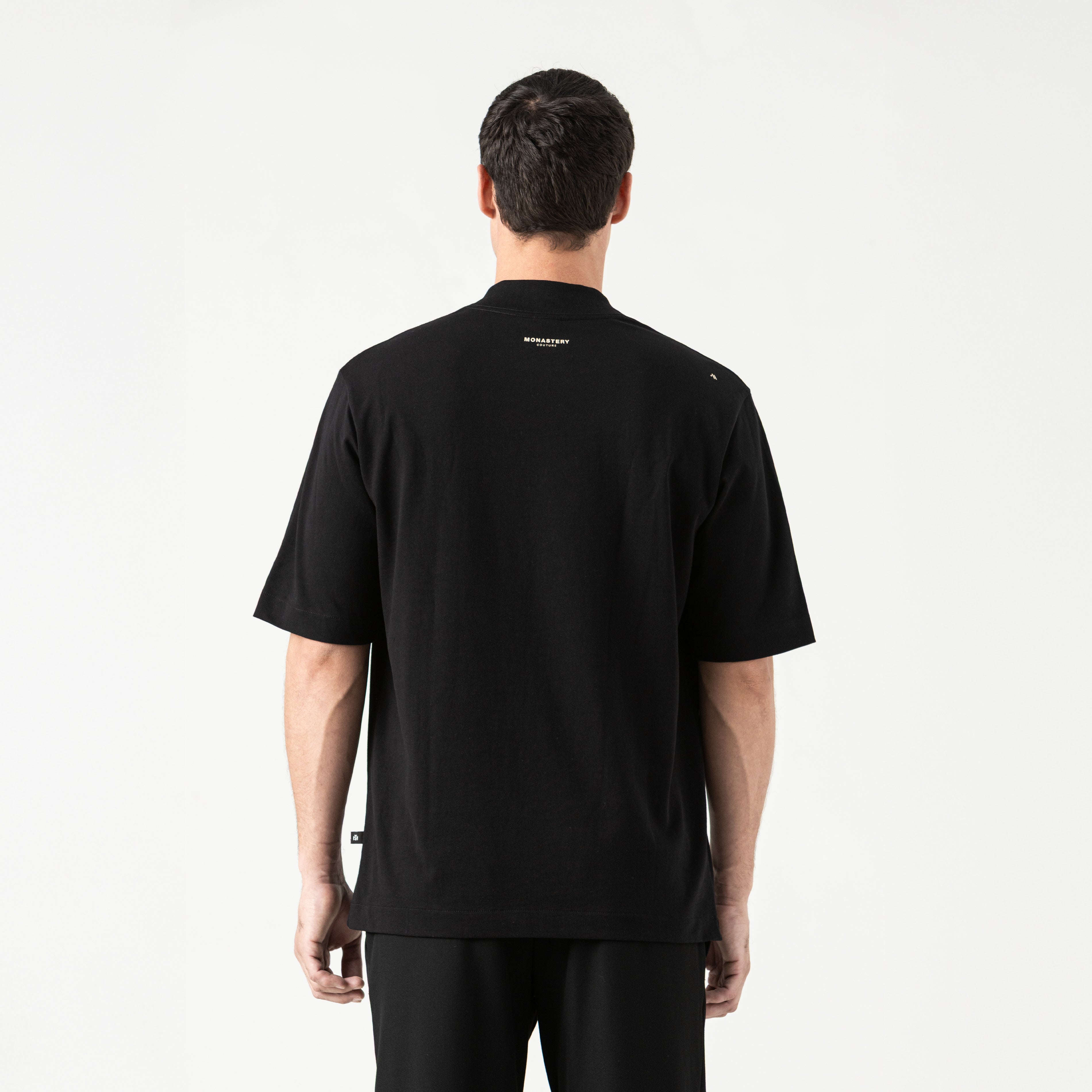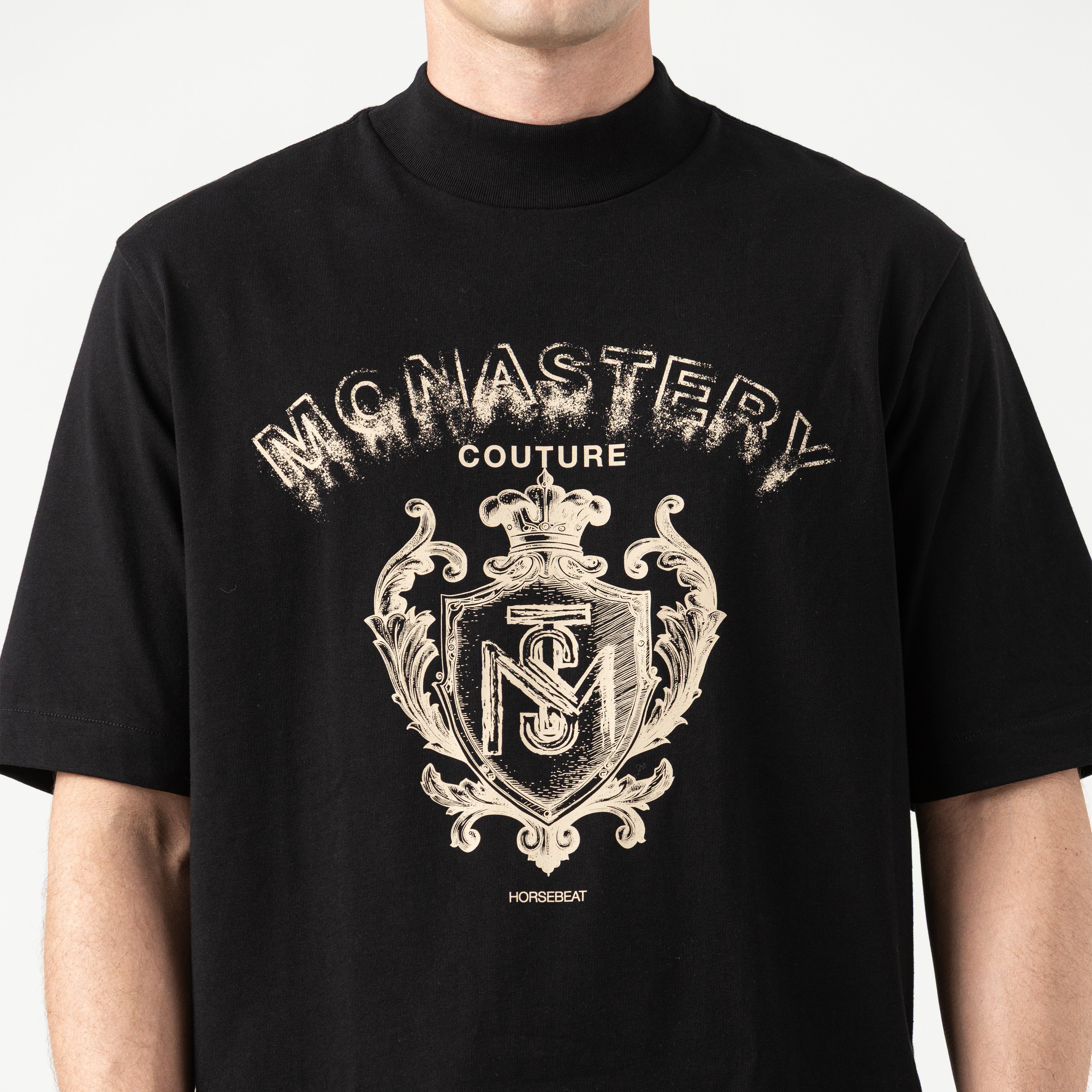 Sheval is a men's T-shirt. This oversized silhouette with a 5cm ribbed neckline is crafted from our exclusive 100% cotton Monastery fabric, offering structure, softness, and a relaxed fit with character. The front features a flat print with a Monastery crest design, a symbol of strength, heritage, and timeless style. On the back, a high-density print adds texture and depth, completing a powerful and balanced visual statement. Ideal for those who dress with intention and confidence.