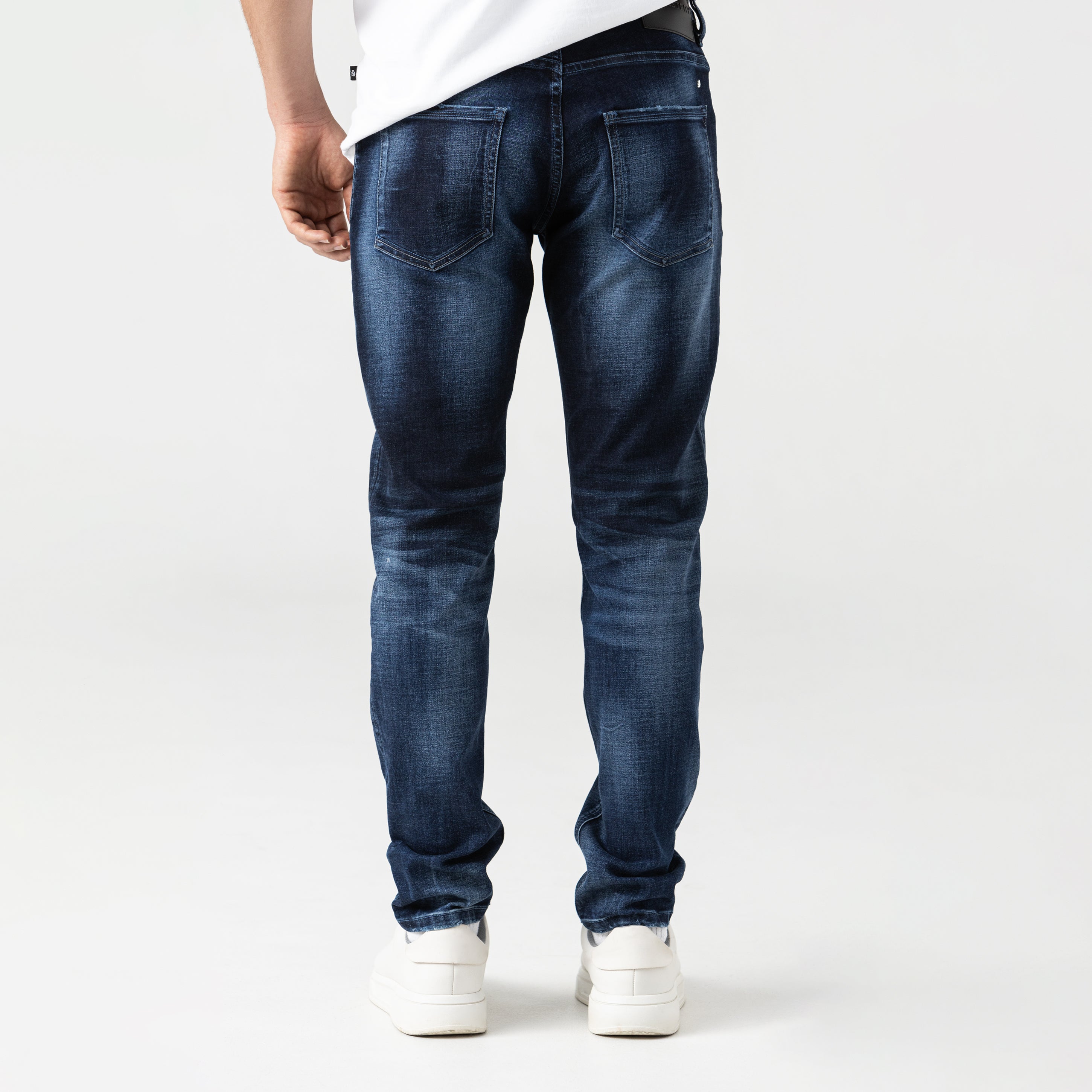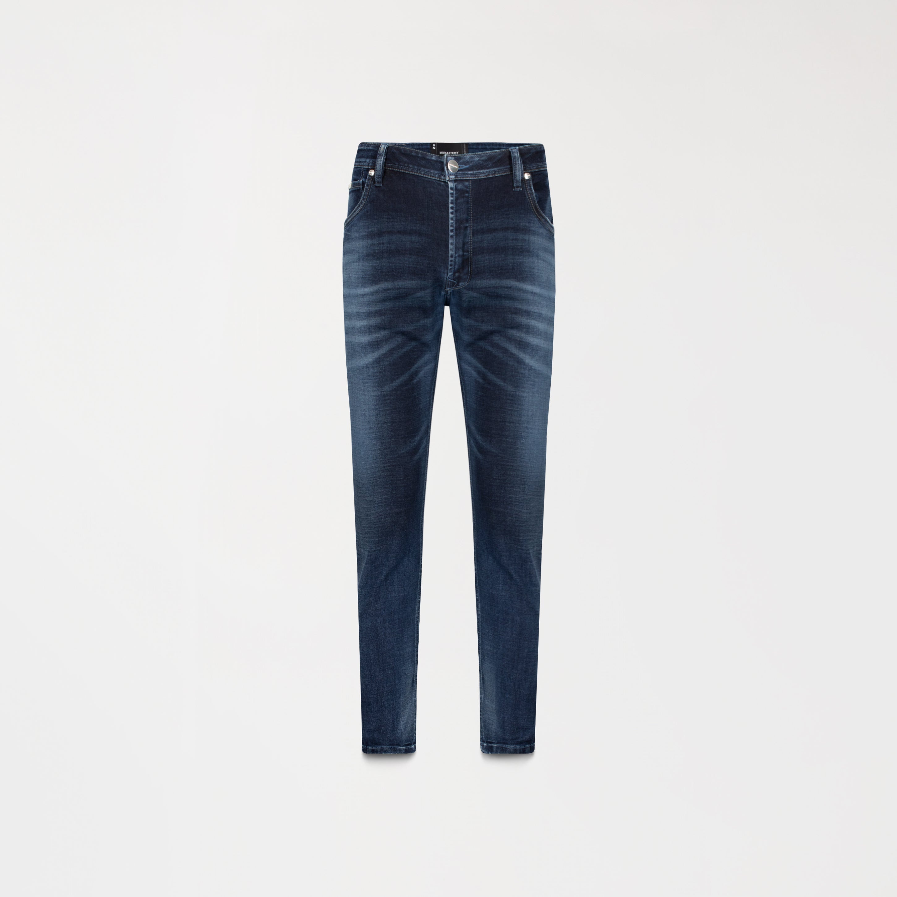 Men's jeans crafted from MST denim fen, an exclusive Monastery fabric that combines structure, durability, and comfort in a slim silhouette. Its medium-dark stone tone with controlled distressing adds character and depth, highlighting the denim's natural texture.