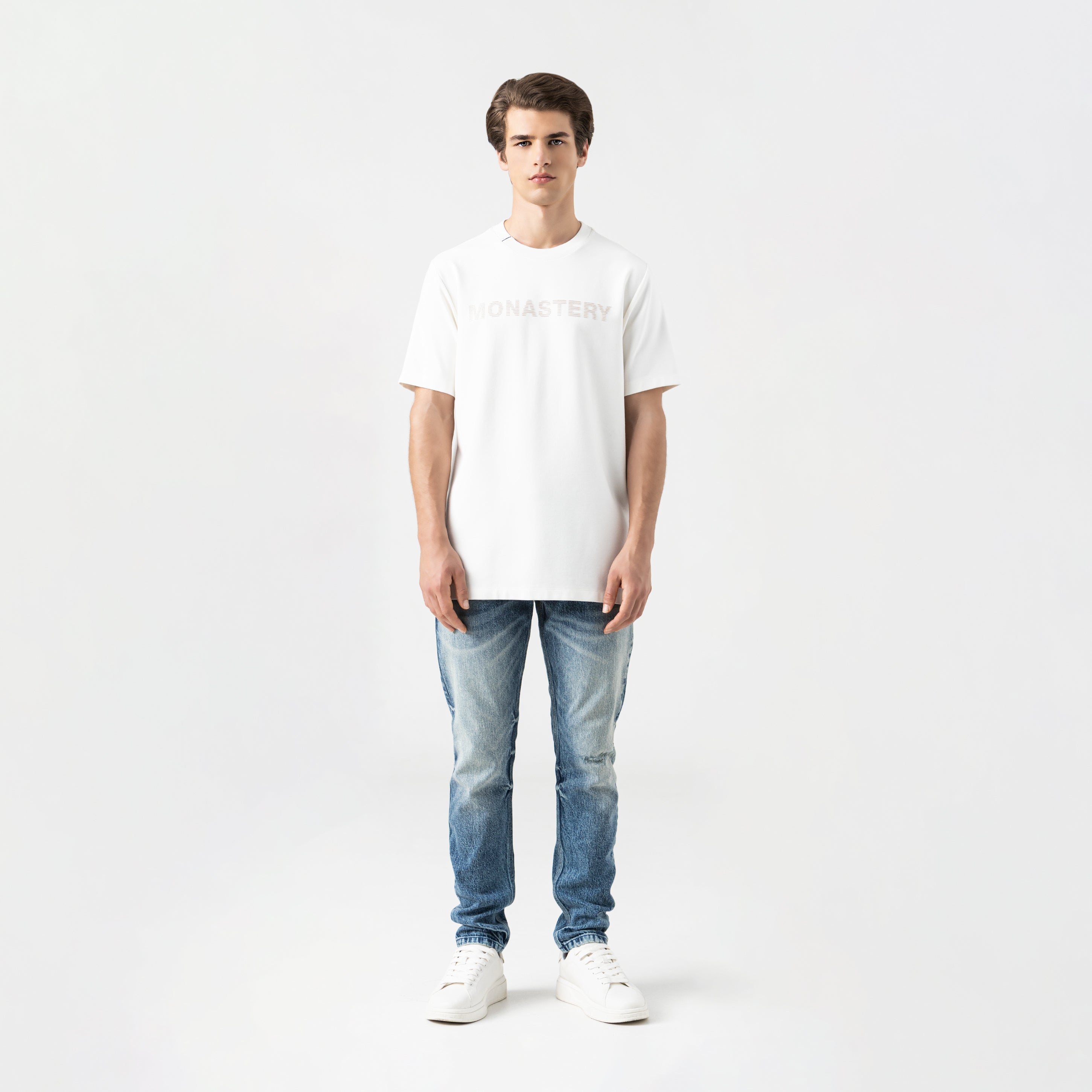 Minimalism with character. With a regular fit and a 2.5 cm ribbed collar, this t-shirt, crafted from high-quality MST Napoleon cotton, offers exceptional comfort and softness. The brushed-effect print on the front adds movement and artistic expression, complemented by an appliqué that adds dimension. The back features a high-density print that reinforces identity and presence. Ideal for those seeking authentic style and effortless sophistication.