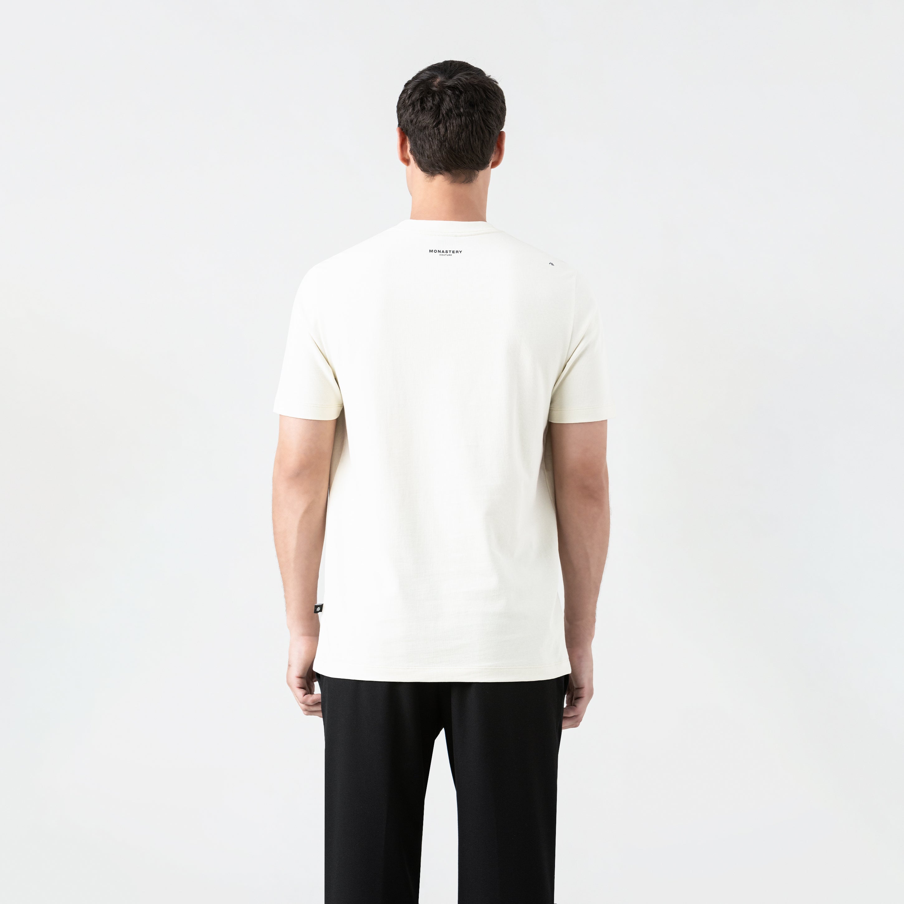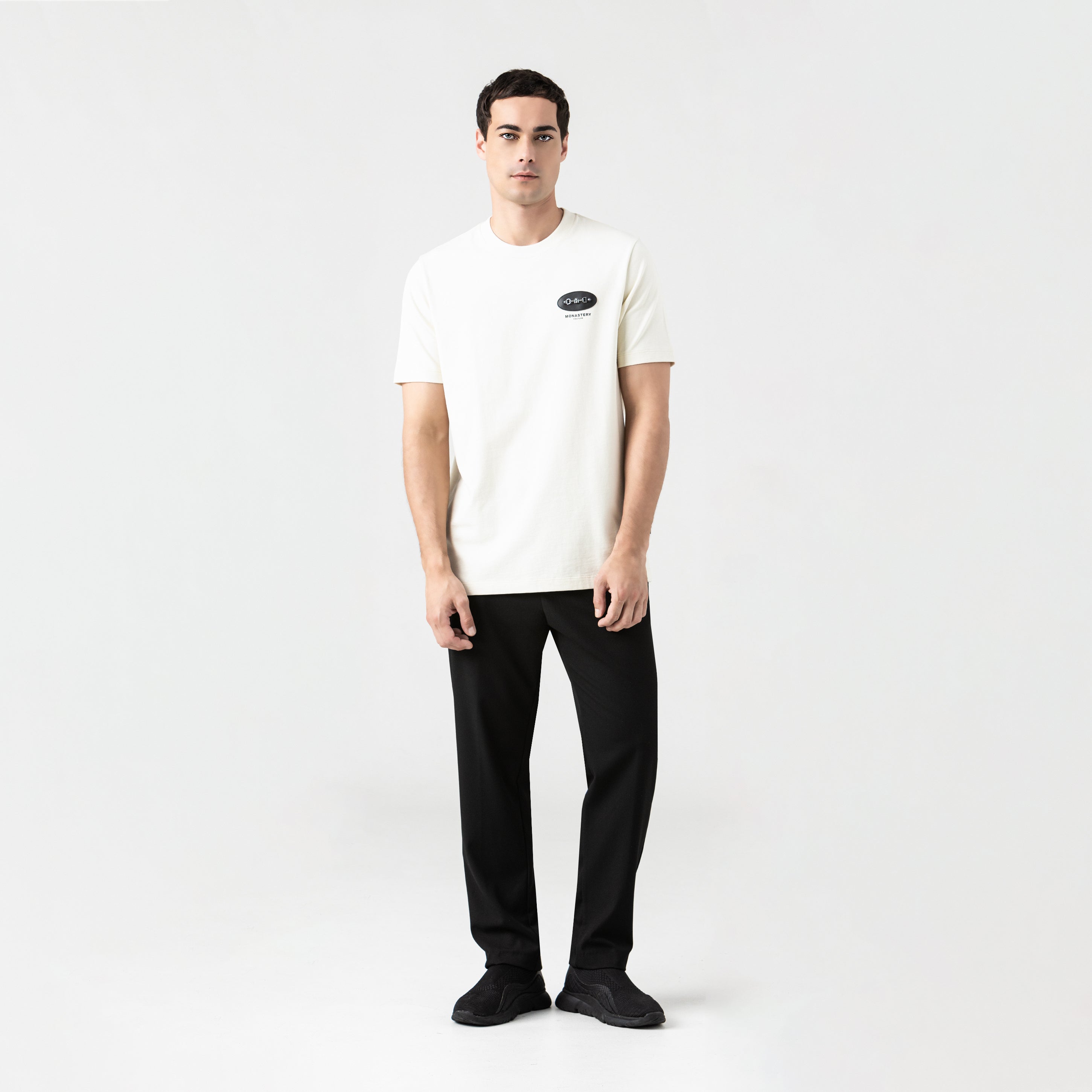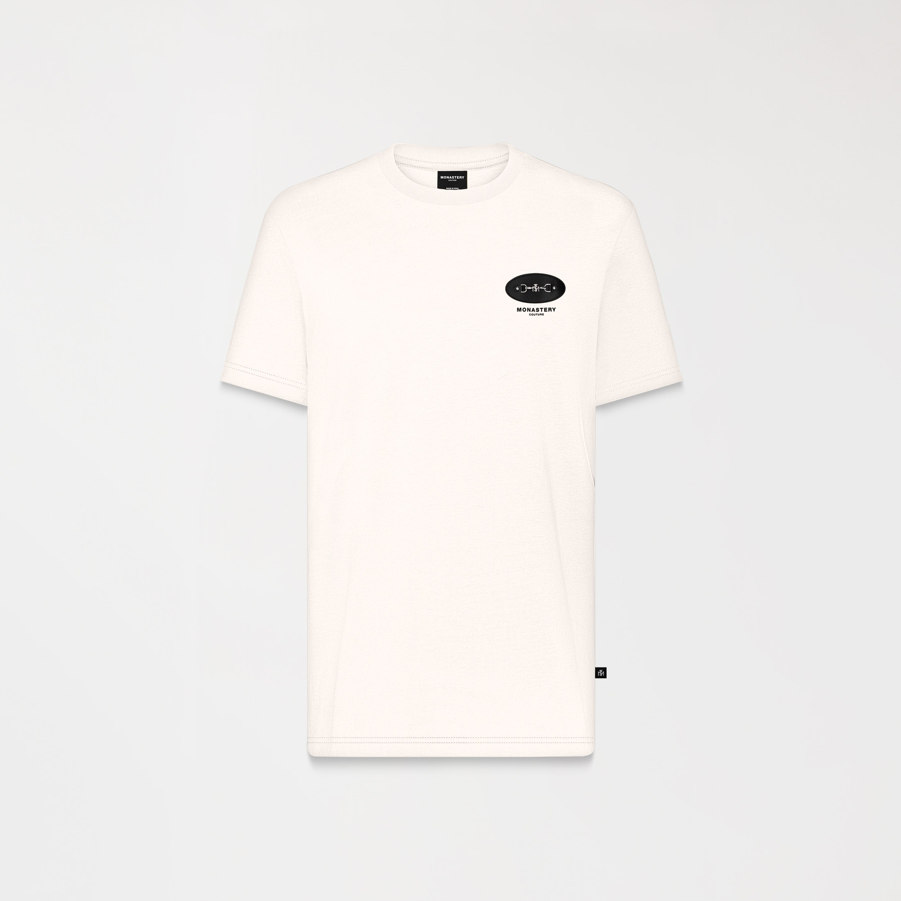 The Stallion men's t-shirt is made from 100% premium cotton, with a regular fit and a 2.5cm ribbed collar for structure, comfort, and an ideal fit. On the front, the Monastery logo is presented in a sophisticated print, accompanied by a leather appliqué and finely crafted metal hardware that adds an exclusive, handcrafted touch. The back maintains its simplicity with a flat print that balances the overall look. An ideal garment for those who value subtle elegance and details that make a statement.