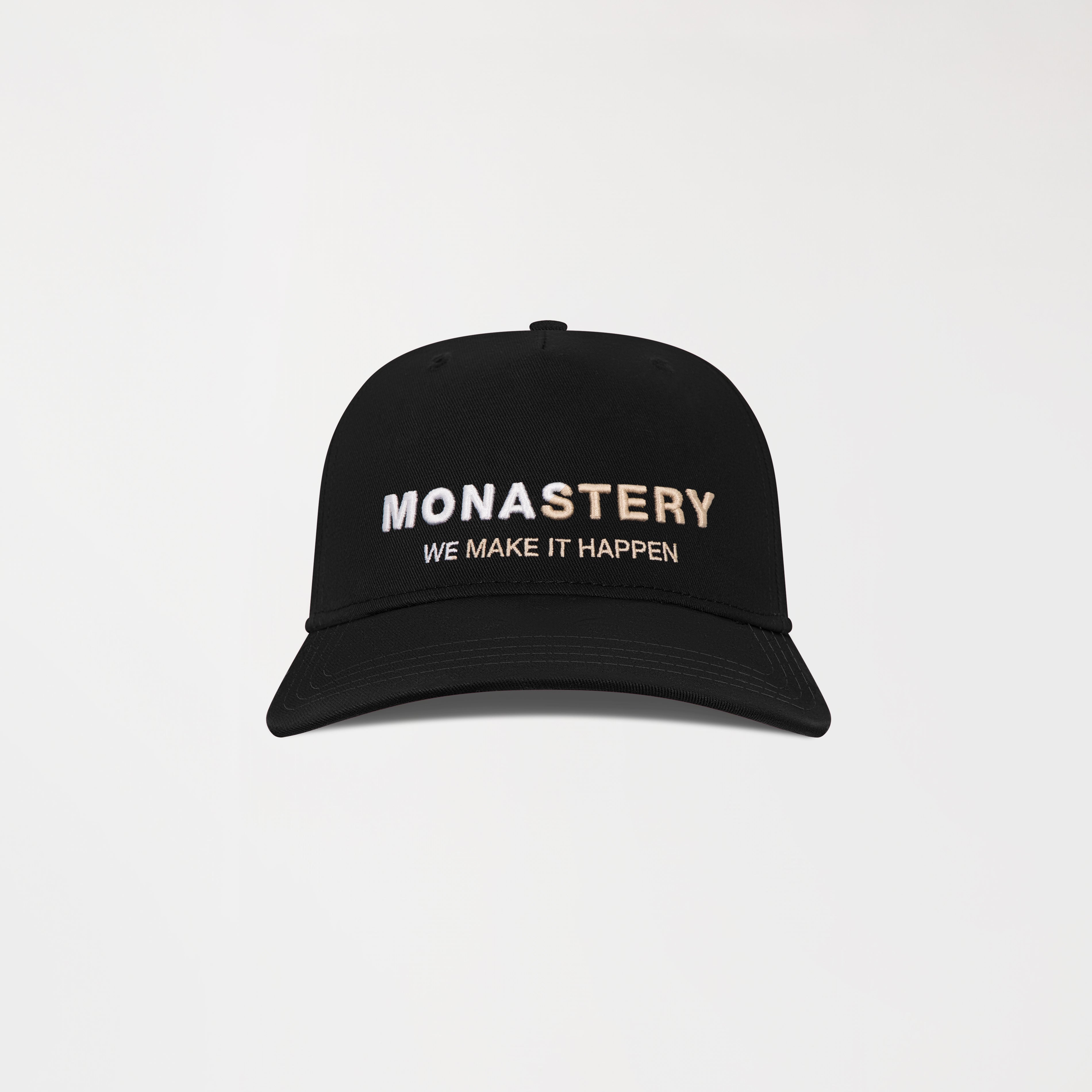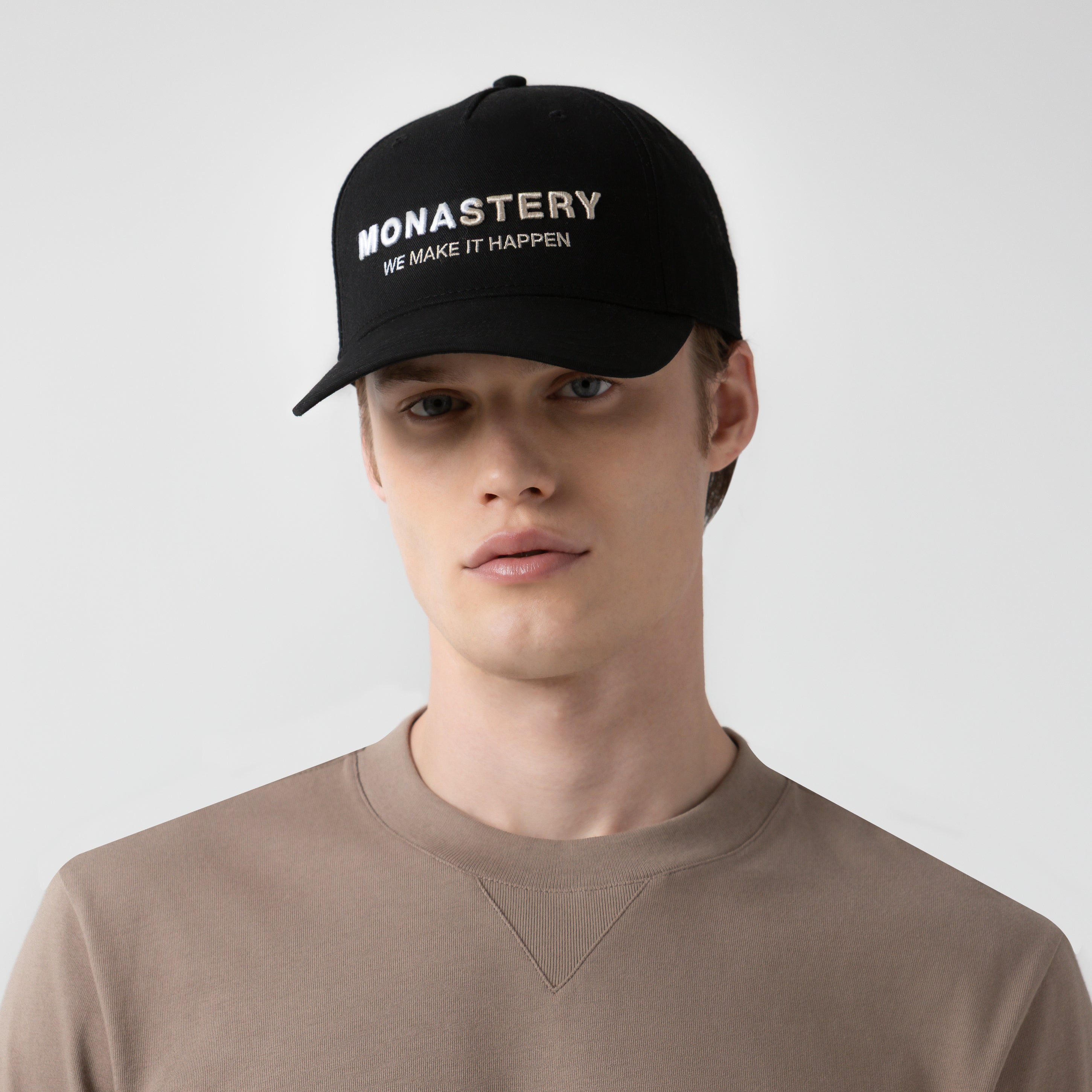 Stroller cap in a basic silhouette, crafted from black cotton. Its front design combines flat and 3D embroidery in striking collection colors that capture all eyes. The cowhide back closure ensures a comfortable fit and a sophisticated finish. A versatile option to elevate your urban style with personality.
