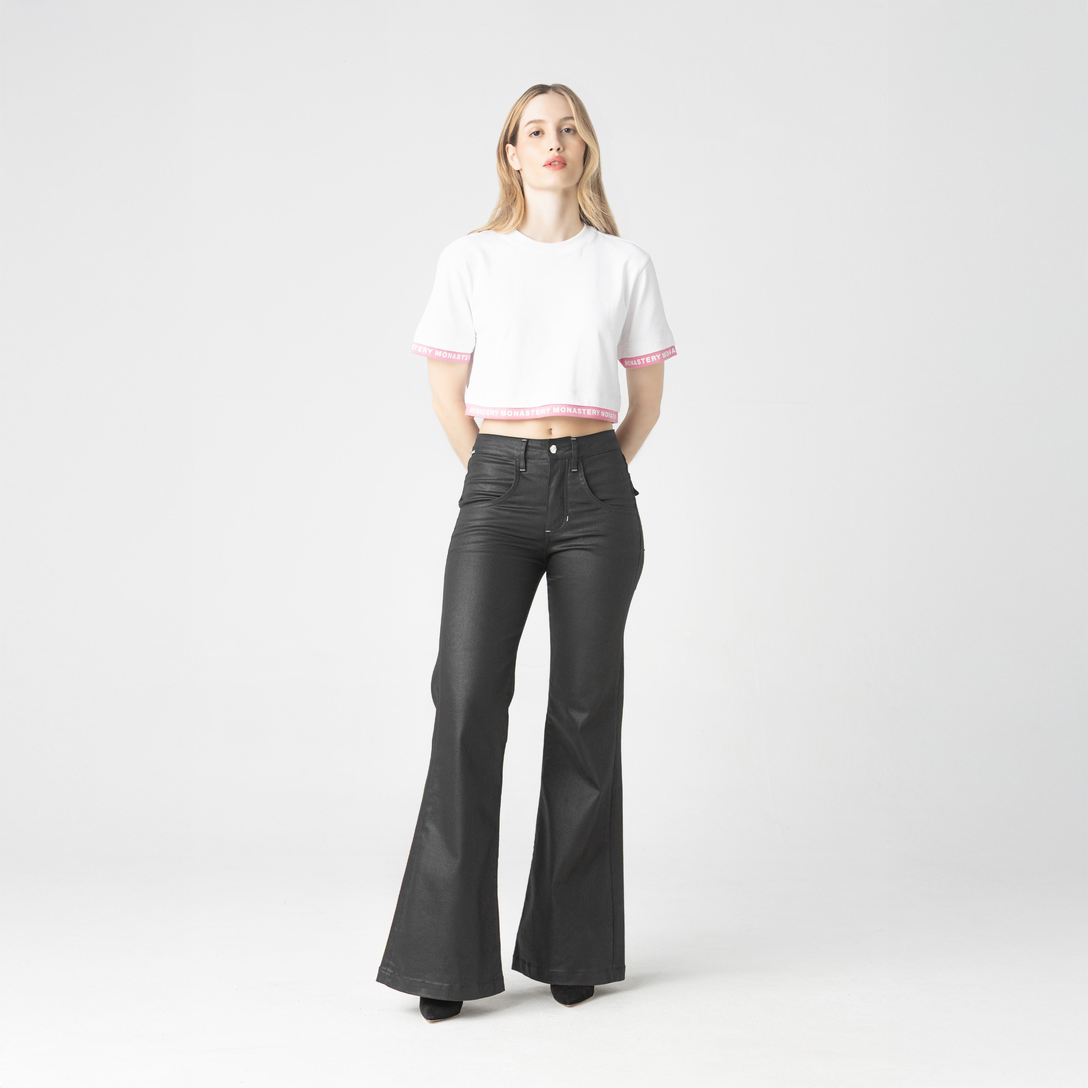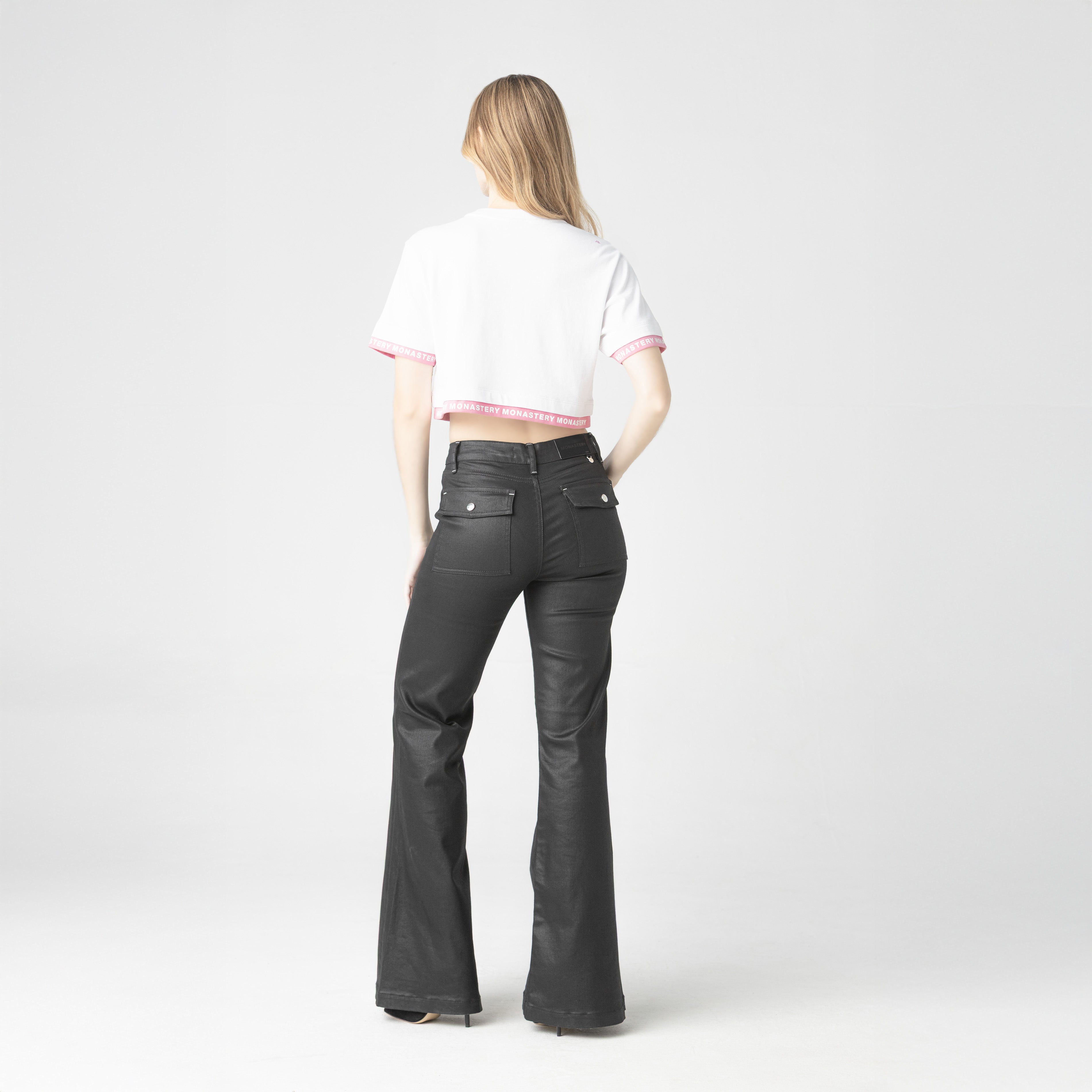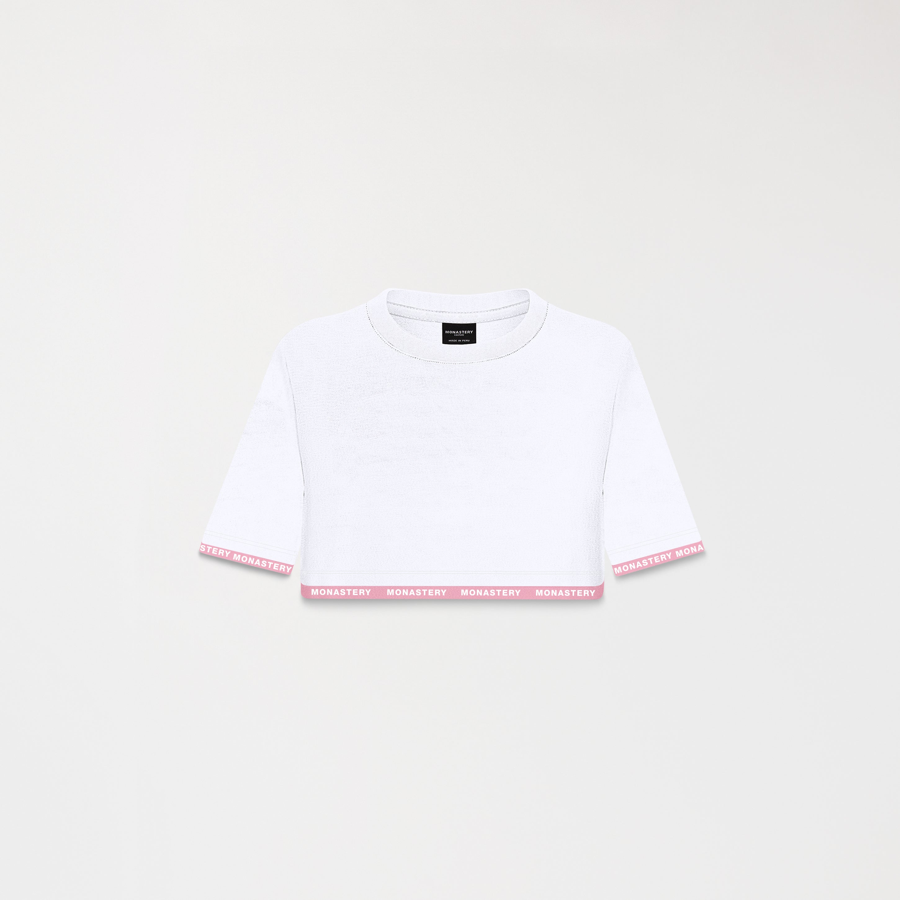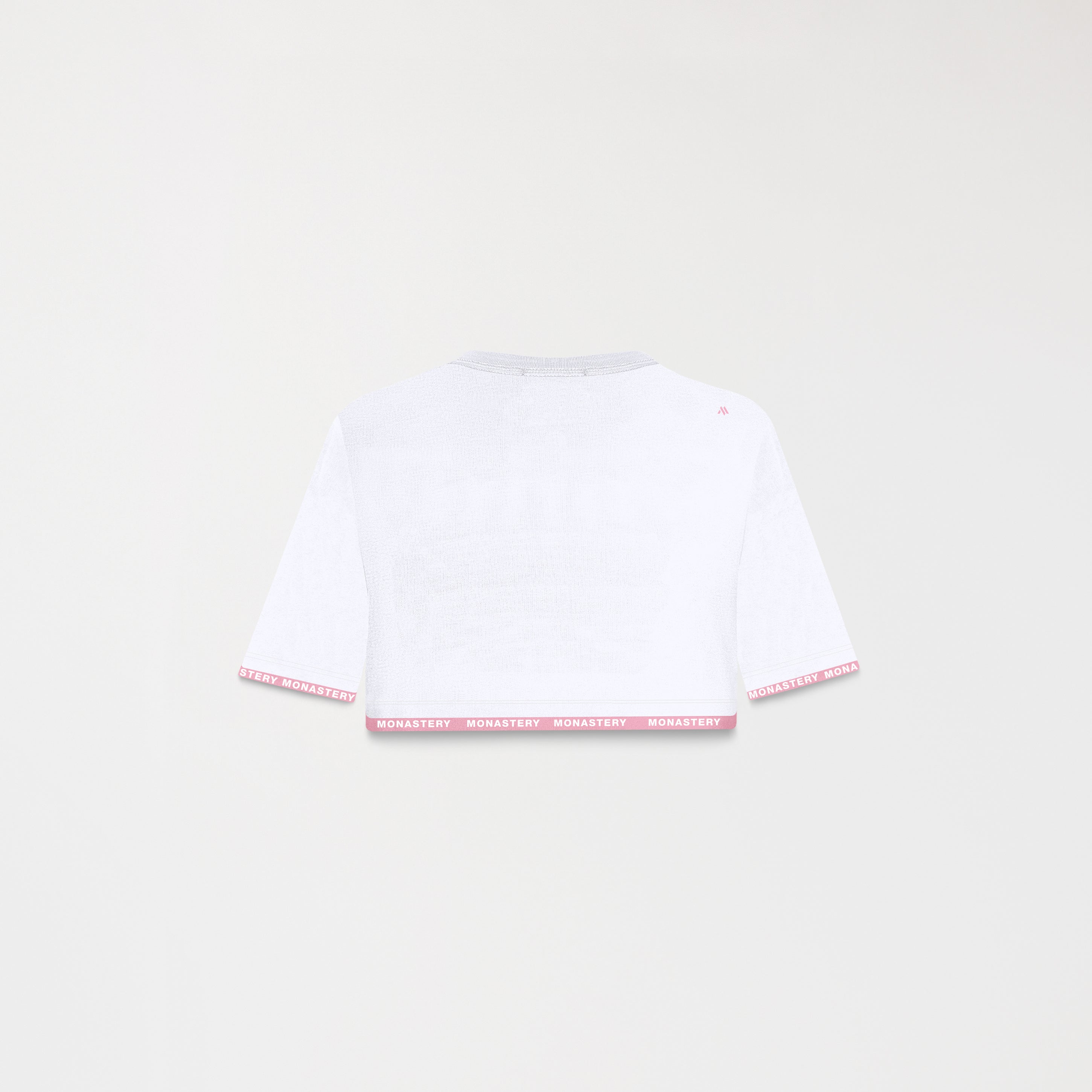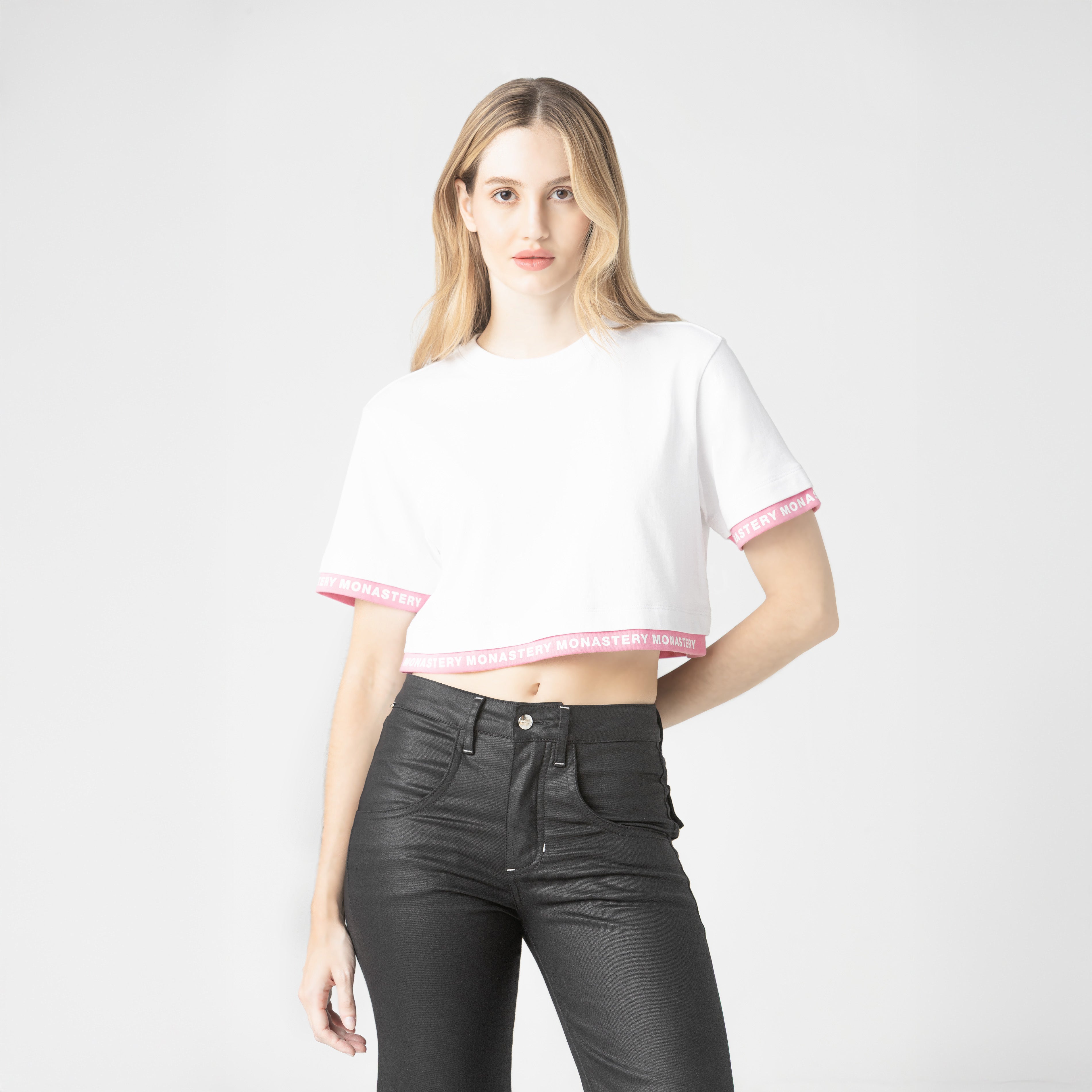 Women's crop top with a petite silhouette and a contrasting double hem that frames the garment and enhances its design with a modern and defined look. It features flat-print artwork on the front, while the back incorporates the brand's signature logo in a flat print, clearly and harmoniously reinforcing its identity.