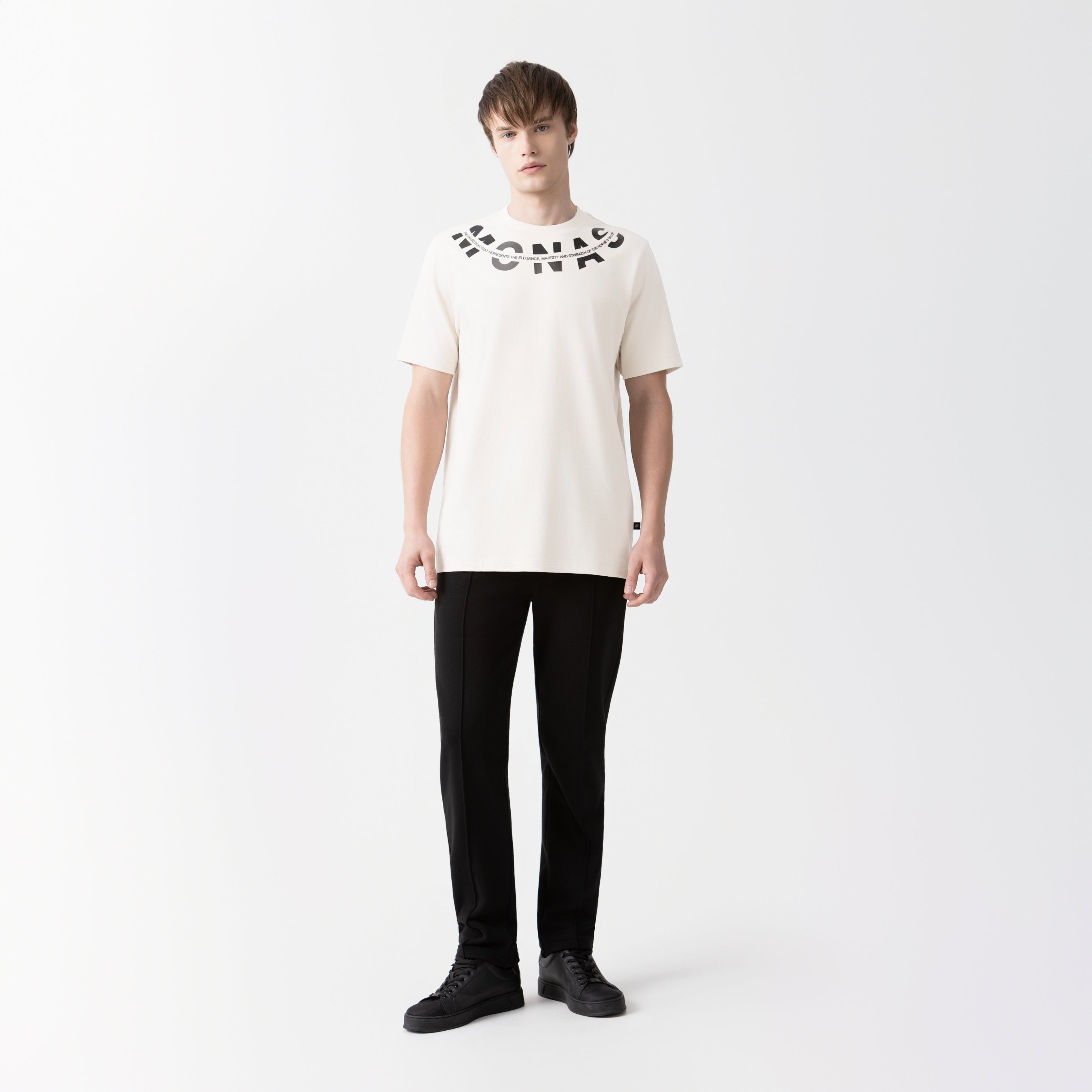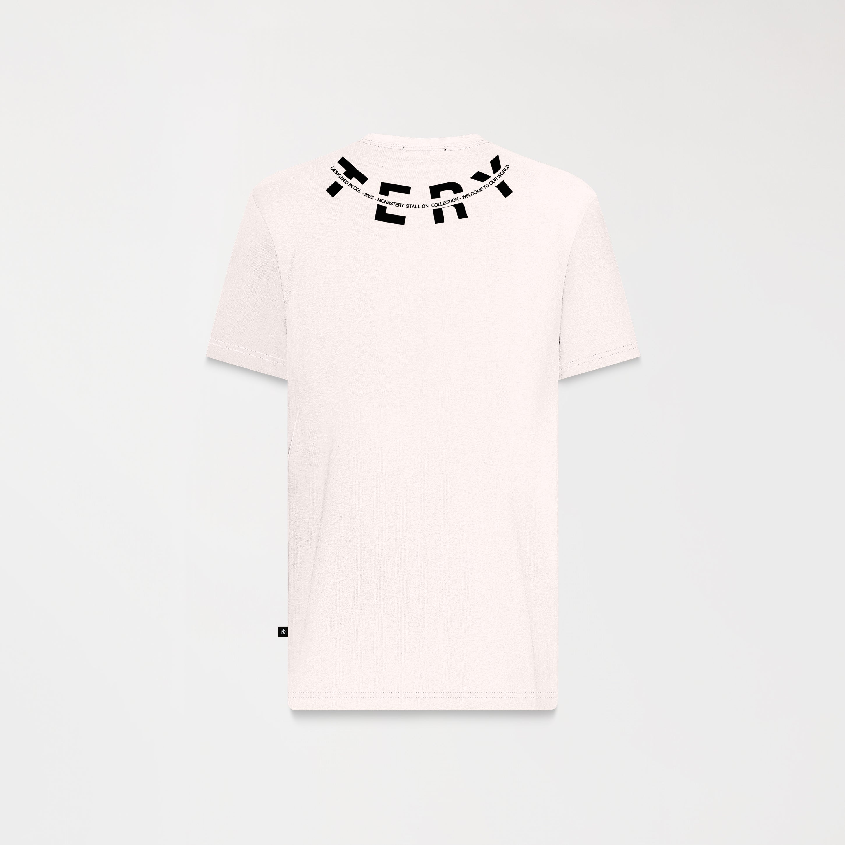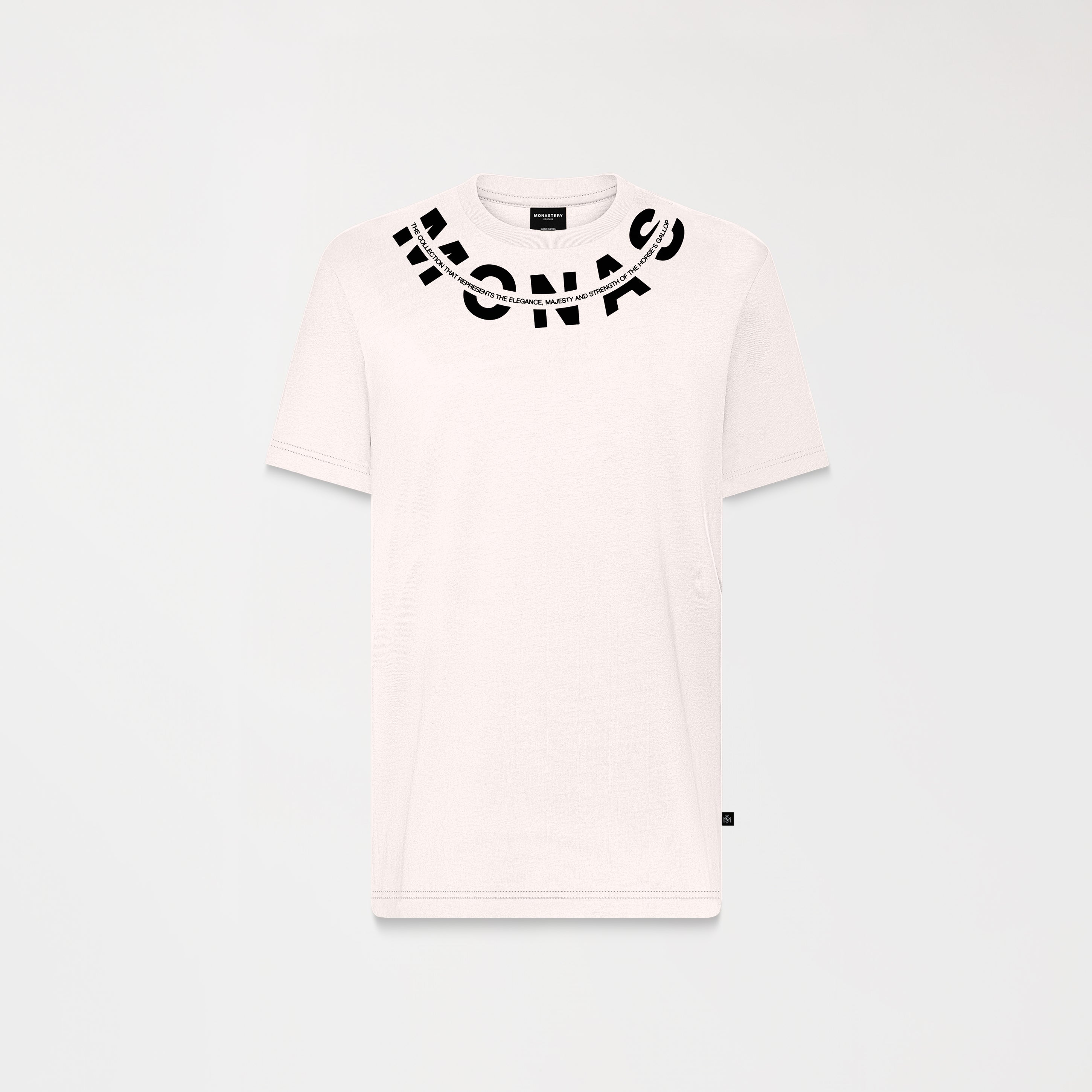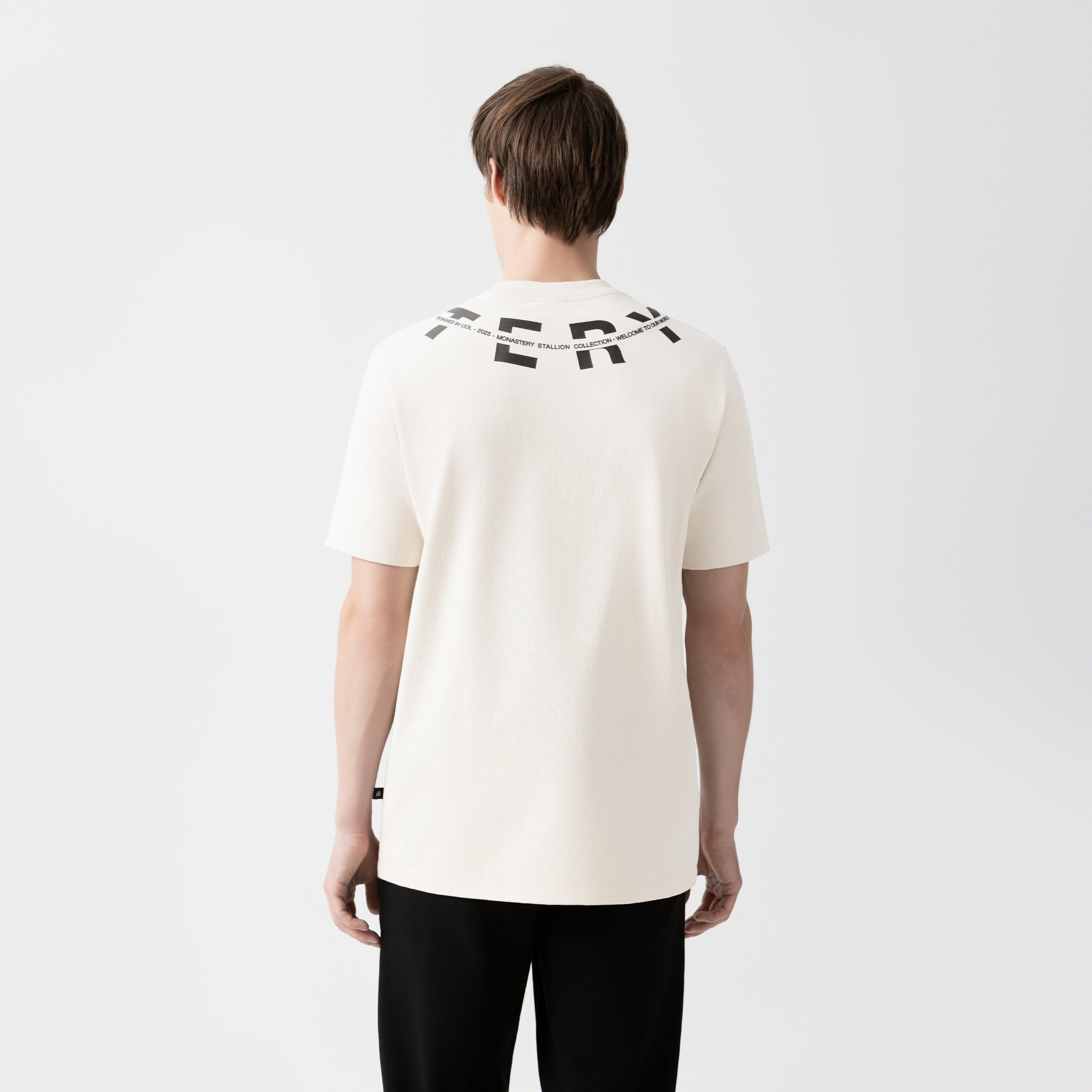 Utah is a men's T-shirt made from 100% high-quality, ultra-siliconized cotton, offering a soft texture and a refined finish. The artwork on the front and back is applied using a flat print technique combining matte transfer—for a glare-free effect—and high-density printing, which adds volume and a tactile texture. The design features the word "Monastery" strategically placed across both sides, creating a continuous, wrap-around graphic that reinforces the brand's visual identity.