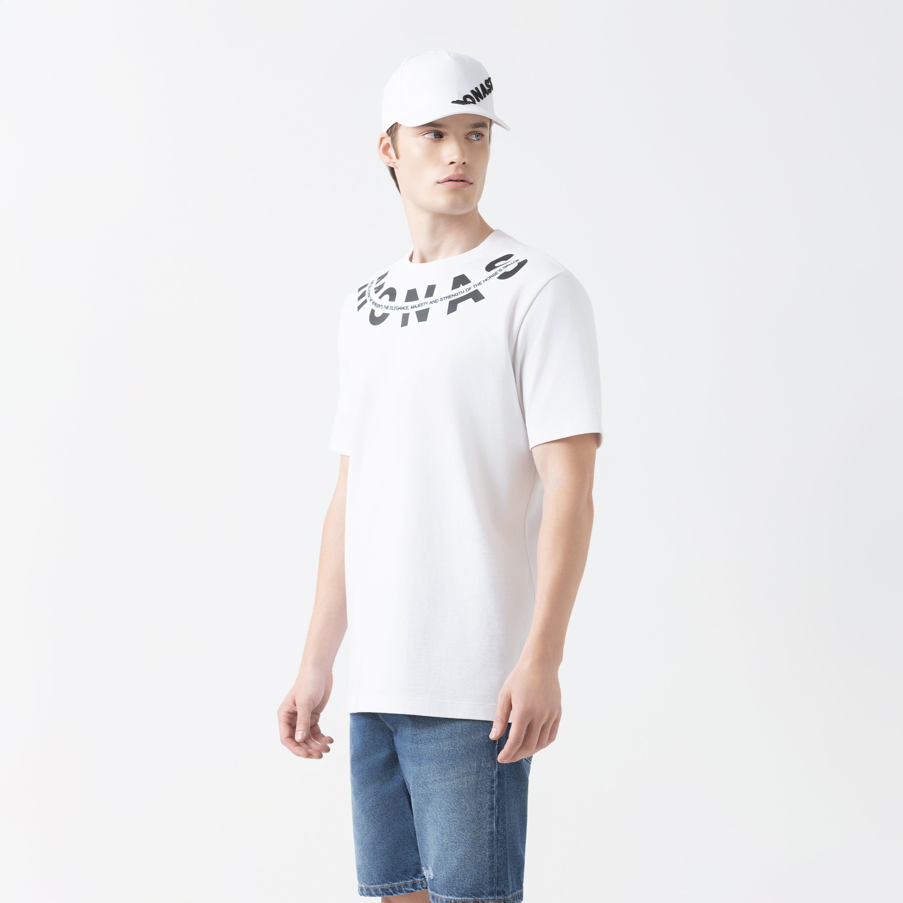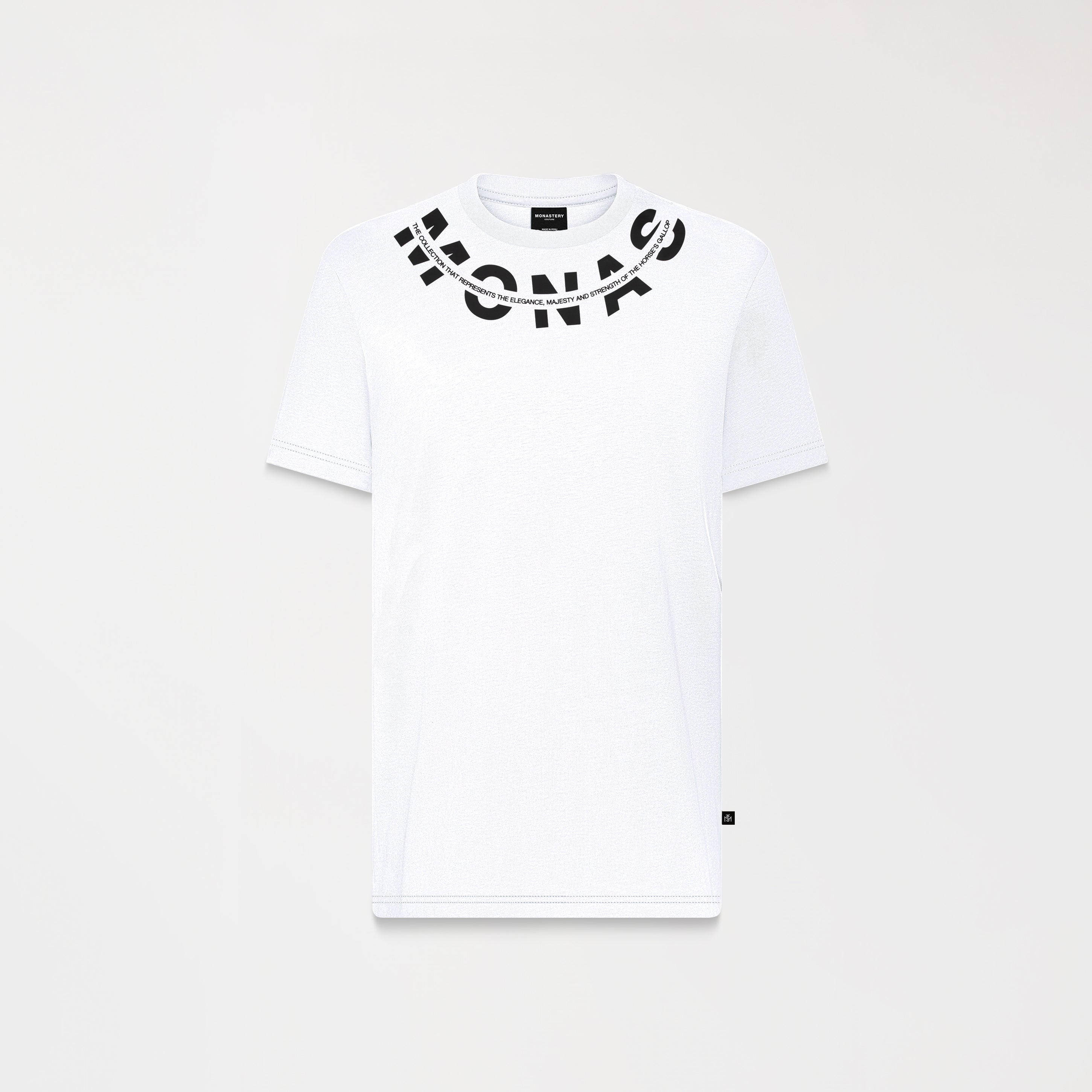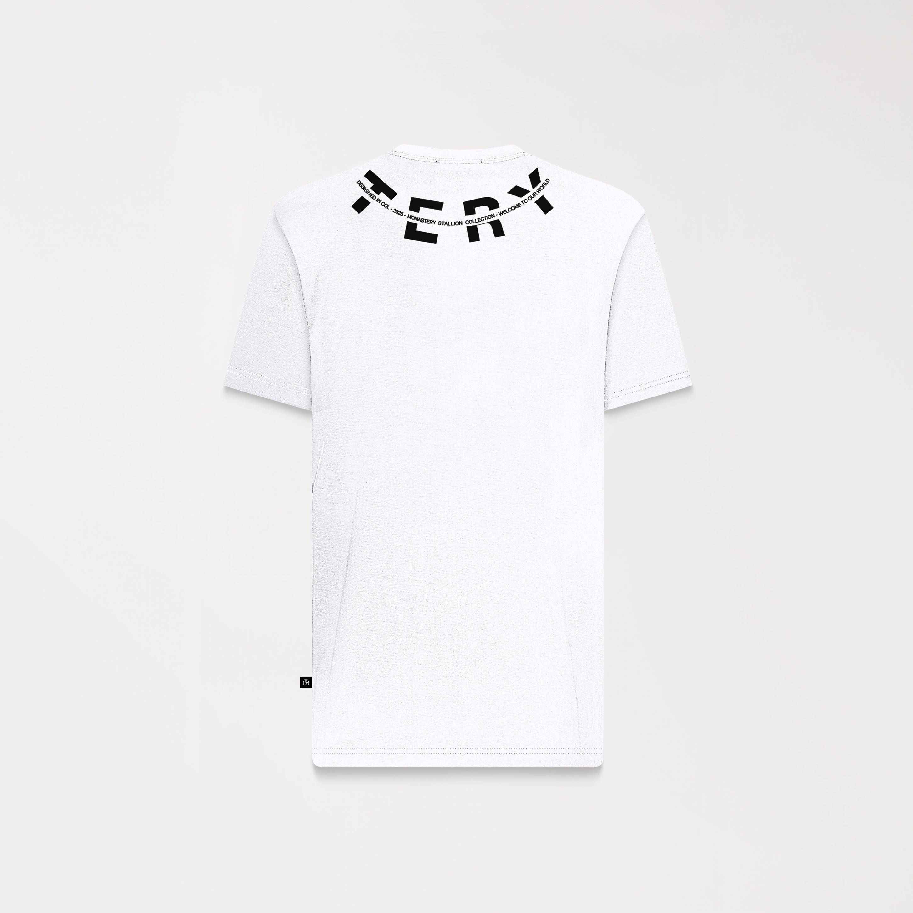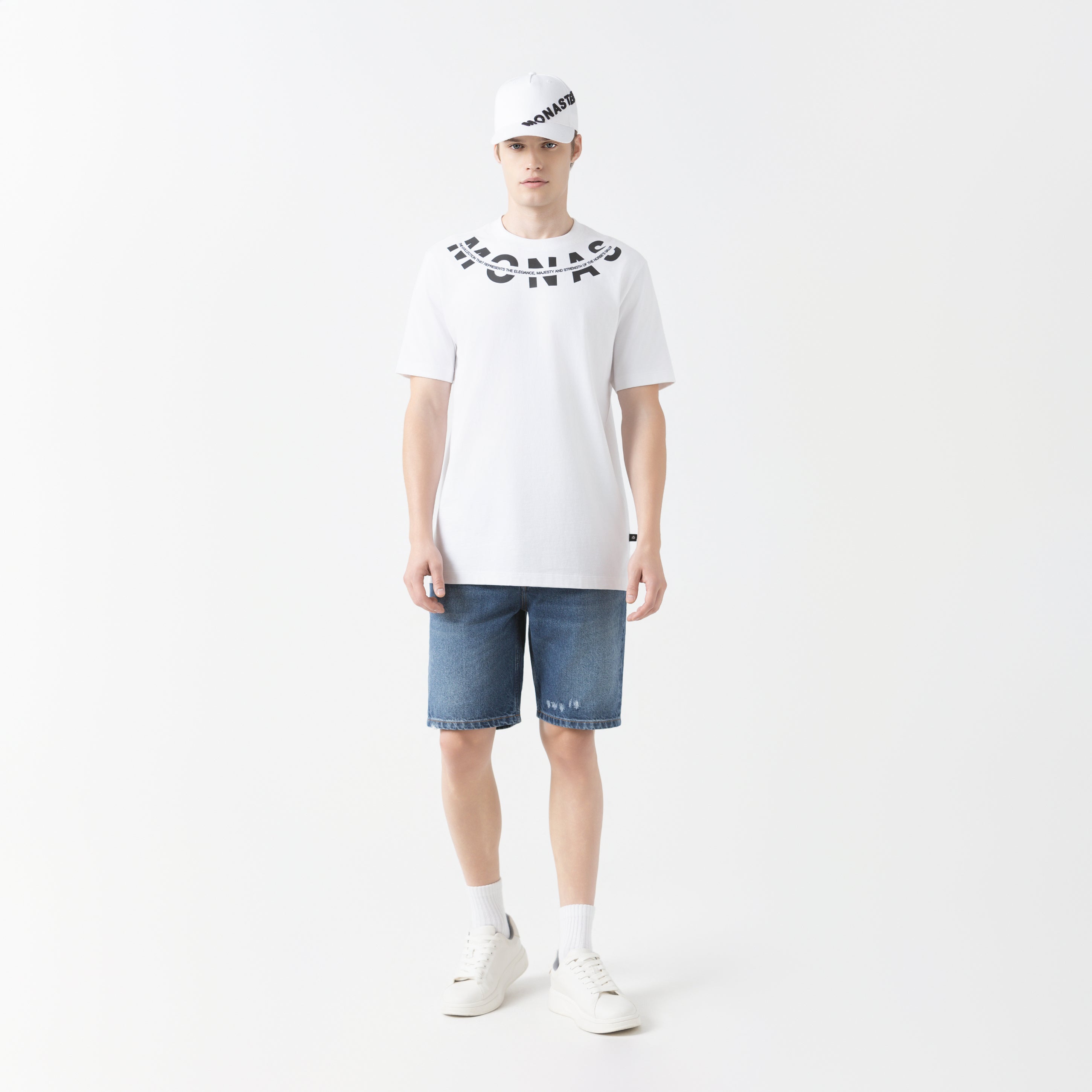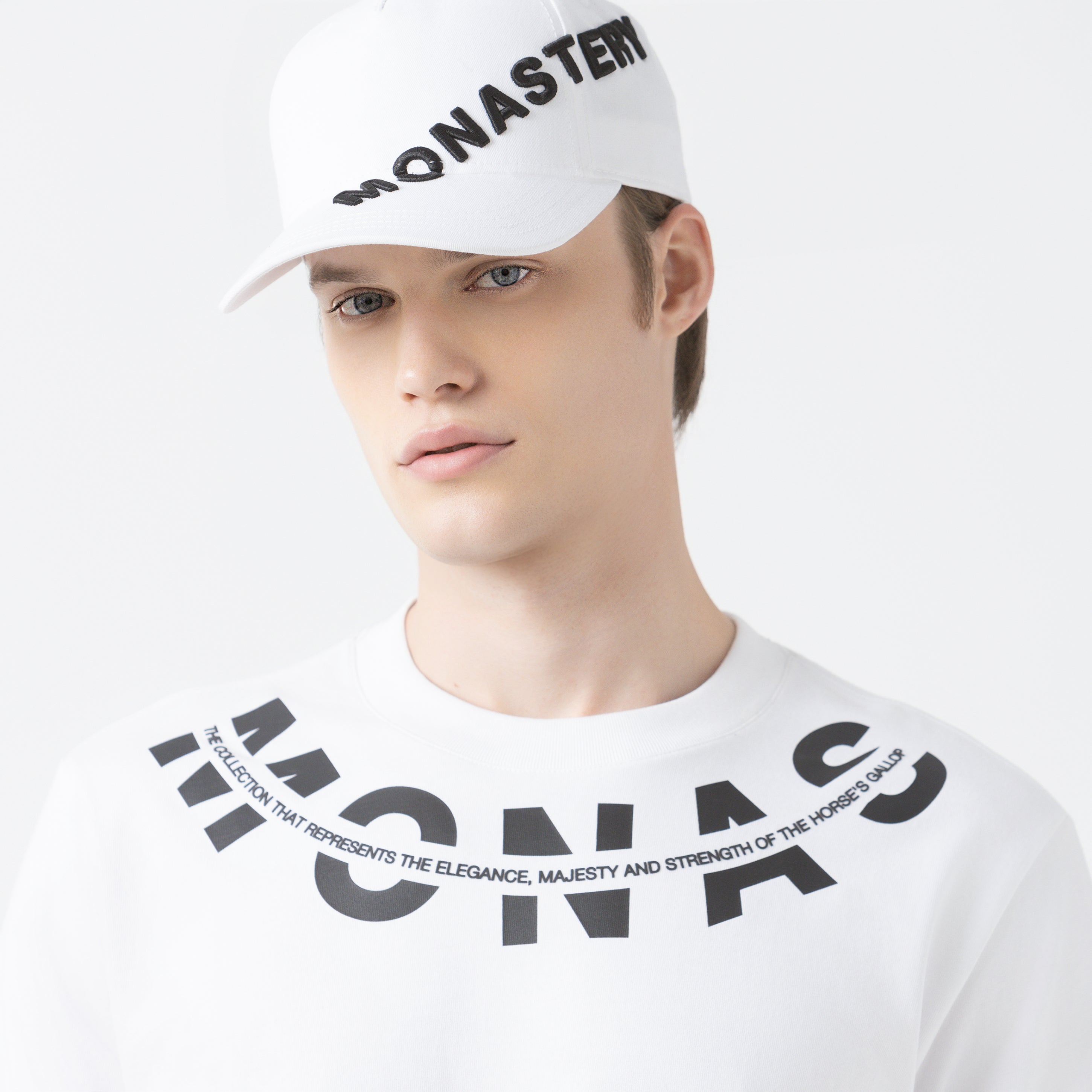 Utah is a men's T-shirt made from 100% high-quality, ultra-siliconized cotton, offering a soft texture and a refined finish. The artwork on the front and back is applied using a flat print technique combining matte transfer—for a glare-free effect—and high-density printing, which adds volume and a tactile texture. The design features the word "Monastery" strategically placed across both sides, creating a continuous, wrap-around graphic that reinforces the brand's visual identity.