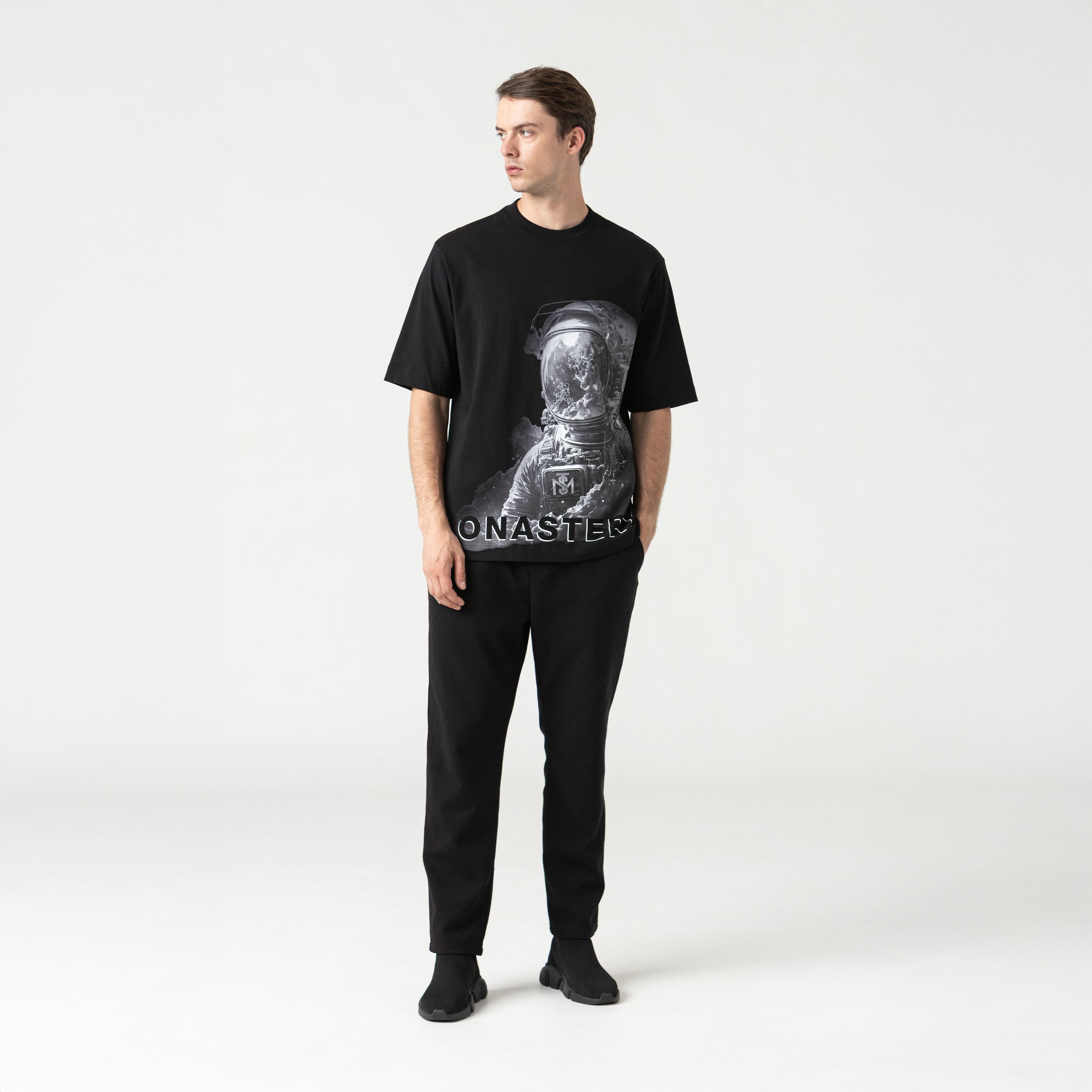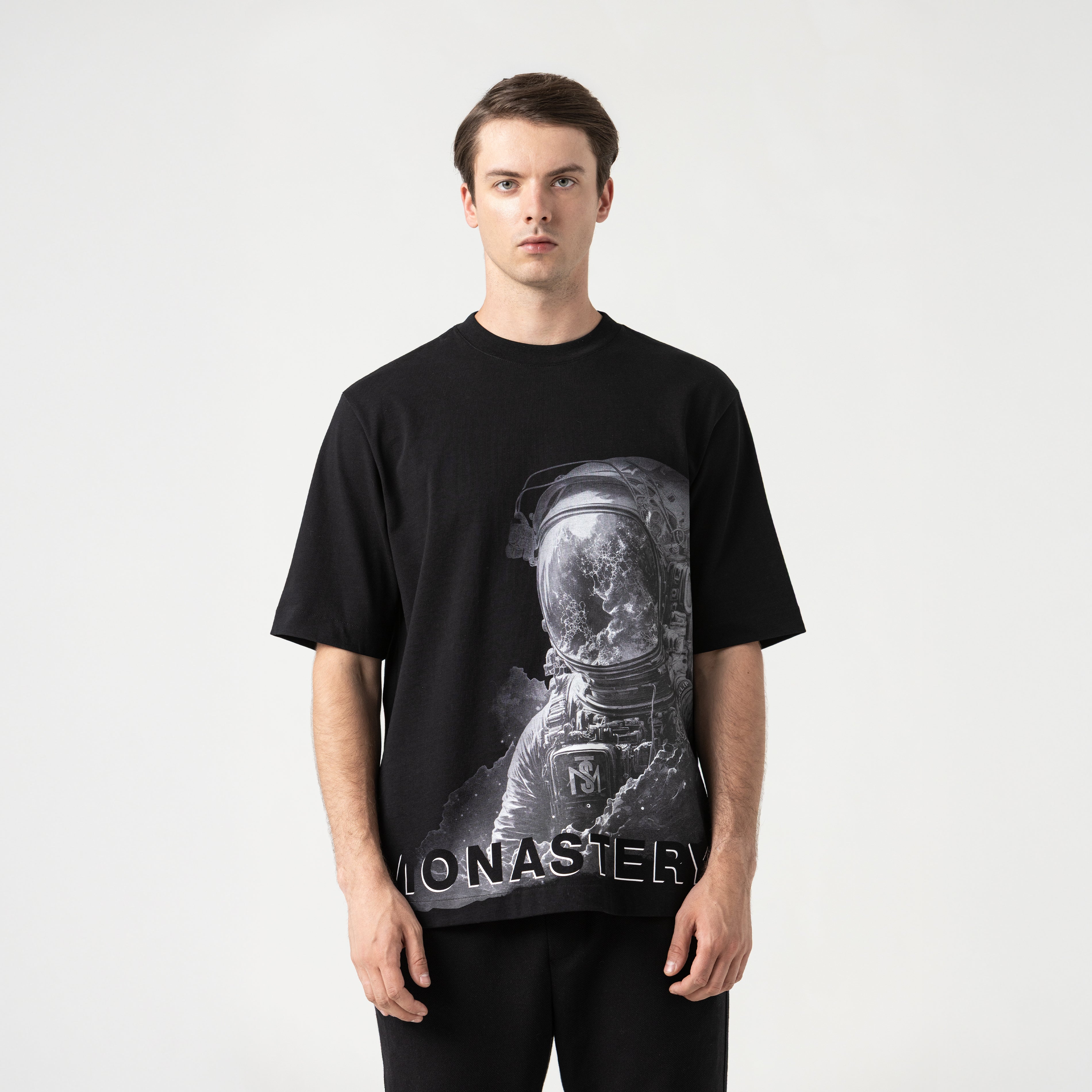 Men's oversized t-shirt, made from 100% cotton exclusively for Monastery. The front features our iconic astronaut Phillip in a screen-printed technique, and the back features the signature logos in high-density prints. Venture is an oversized staple perfect for layering with your wardrobe.