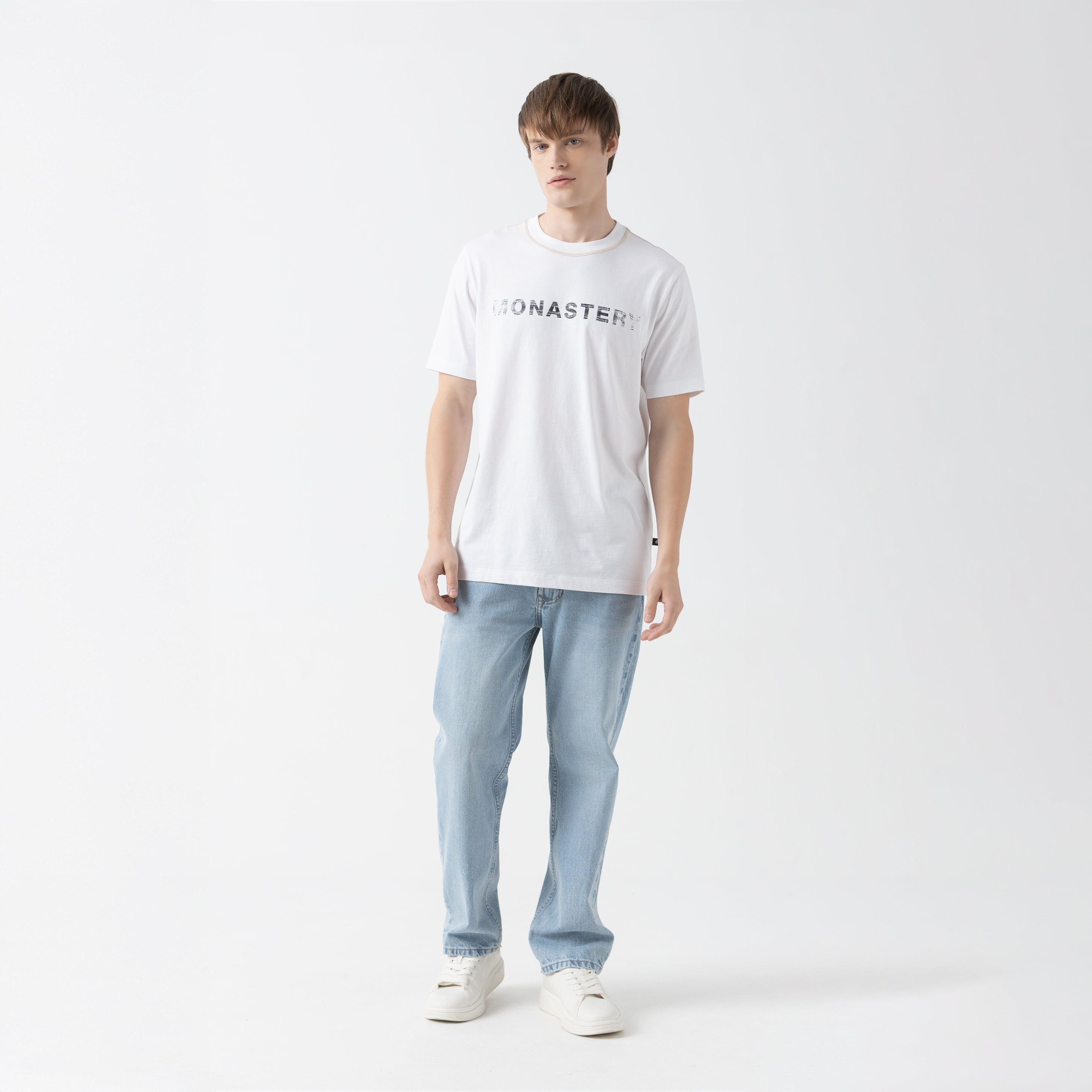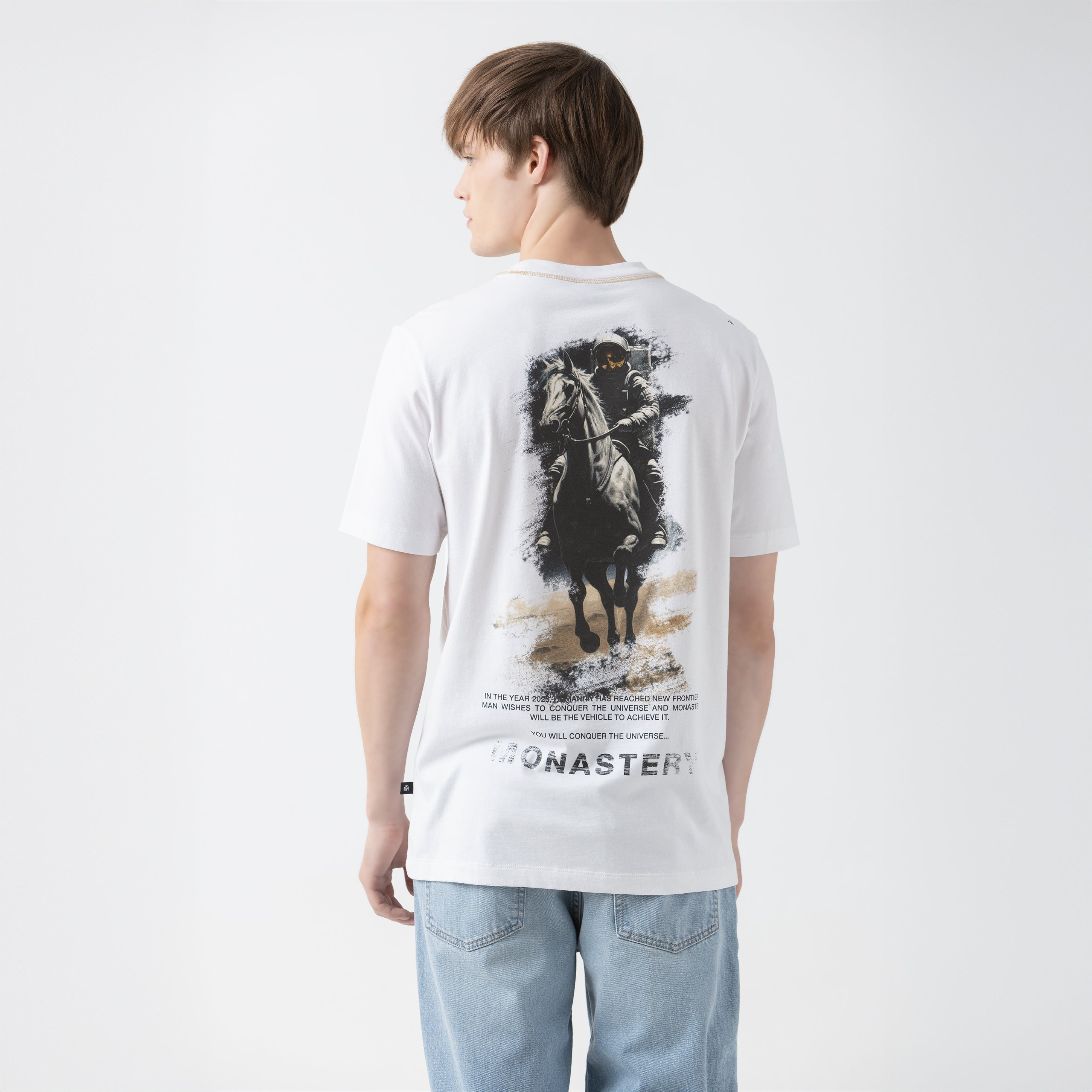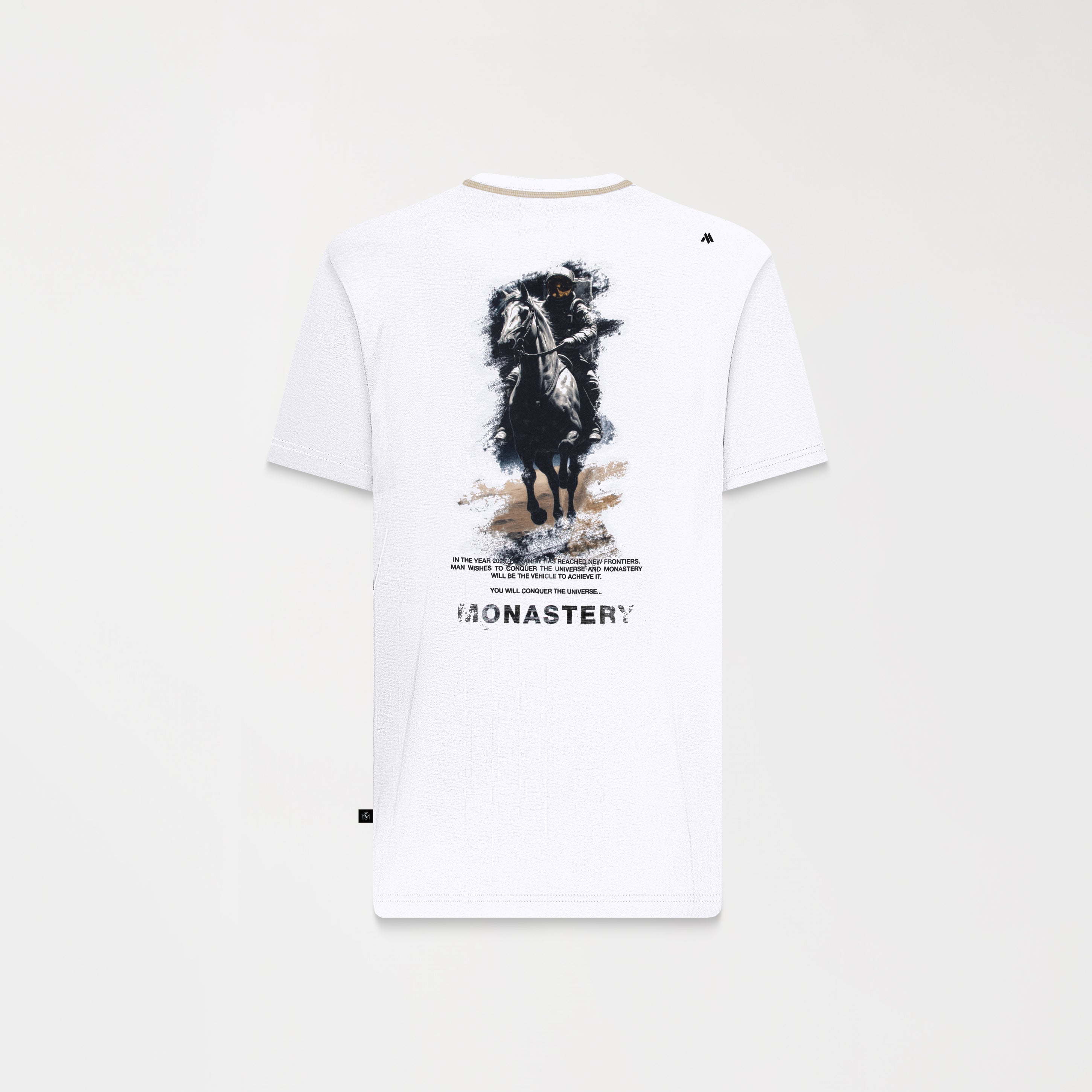 Wesley is a regular-fit T-shirt made from Monastery 2 fabric, a 100% cotton textile that balances comfort and structure. The front features the brand's logo in a flat print, while the back showcases the iconic astronaut Phillip, a distinctive symbol of the Monastery brand. Contrasting stitching at the neck adds a subtle and deliberate detail that enhances the garment's visual appeal.